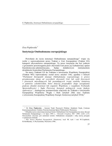 E. Popławska, Instytucja Ombudsmana europejskiego Ewa Popławska ∗ Instytucja Ombudsmana europejskiego Powołanie do życia instytucji Ombudsmana europejskiego 1 wiąże się ściśle z wprowadzeniem przez Traktat o Unii Europejskiej (Traktat UE) kategorii obywatelstwa europejskiego. Ta nowa instytucja ma być jednym z gwarantów przestrzegania praw obywateli Unii przez jej rozbudowany aparat biurokratyczno-administracyjny, będąc dodatkowym instrumentem działalności kontrolnej Parlamentu Europejskiego. Na mocy Traktatu UE do Traktatu o utworzeniu Wspólnoty Europejskiej (Traktat WE) wprowadzony został nowy artykuł 138e, zgodnie z którym “Parlament Europejski mianuje Ombudsmana wyposażonego w prawo przyjmowania skarg od wszystkich obywateli Unii lub osób fizycznych i prawnych mieszkających lub posiadających swoją siedzibę statutową w państwie członkowskim, które dotyczą przypadków złego zarządzania podczas działań instytucji lub organów Wspólnoty, z wyjątkiem Trybunału Sprawiedliwości i Sądu Pierwszej Instancji pełniących swoje funkcje sądownicze”. Analogiczne postanowienia włączono do Traktatu o utworzeniu Europejskiej Wspólnoty Węgla i Stali (artykuł 20d) oraz Traktatu o utworzeniu Europejskiej Wspólnoty Energii Atomowej (artykuł 107d). 2 ∗ Dr Ewa Popławska - Instytut Nauk Prawnych Polskiej Akademii Nauk, Centrum Konstytucjonalizmu i Kultury Prawnej Instytutu Spraw Publicznych, Warszawa. 1 Oficjalna nazwa omawianej instytucji brzmi: Ombudsman Unii Europejskiej (na mocy decyzji Parlamentu Europejskiego z 12 lipca 1995 r., “Dziennik Urzędowy WE” 1995, L225, s.17). Powszechnie używany jest natomiast termin: Ombudsman europejski i taką nazwę przyjęto w niniejszym artykule. 2 Por. Prawo Wspólnot Europejskich. Dokumenty, wyd. III, wyb. i red. W.Czapliński, R.Ostrihansky, A.Wyrozumska, Warszawa 1996. 27 Studia Europejskie, 4/1997 1. Uwagi terminologiczne W polskiej literaturze przedmiotu oraz w tłumaczeniach z języków obcych występują przeważnie dwie wersje nazwy omawianej instytucji: Ombudsman europejski 3 i Rzecznik Praw Obywatelskich 4 lub równorzędnie obydwa terminy. 5 Sporadycznie występują też inne polskie określenia: pełnomocnik praw obywatelskich, pełnomocnik obywateli 6 oraz mediator. 7 Uzasadnienia wymaga zatem wybór terminologii przyjętej w niniejszych rozważaniach. Jakkolwiek w poszczególnych wersjach językowych Traktatu UE stosowane są nazwy analogiczne do nazw instytucji krajowych, 8 słuszniejsze wydaje się stosowanie międzynarodowego terminu wywodzącego się od skandynawskiej genezy instytucji: Ombudsman (nazwa ta przyjęta jest m.in. w szwedzkiej i angielskiej wersji Traktatu). Identyczność brzmienia nazwy instytucji Unii Europejskiej i instytucji krajowych - znacznie przecież różniących się między sobą - nasuwa błędny wniosek o jednakowym zakresie ich kompetencji. Jak wykazała dotychczasowa praktyka, zakorzeniona lepiej w świadomości prawnej obywateli Unii znajomość zakresu i zasad działania Ombudsmanów krajowych i przekonanie o takim samym statusie Ombudsmana europejskiego przyczyniają się do napływu do jego biura ogromnej liczby skarg wykraczających poza jego kompetencje wyznaczone w Traktacie. 9 3 Por. m.in. J.Galster, Konstytucjonalnoprawne zapożyczenia w systemie instytucjonalnym Wspólnot Europejskich, “Przegląd Prawa Europejskiego” nr 1 1996, s.15-16; A.Evans, Prawo integracji europejskiej, część I, tłum. Wł.Czapliński, Warszawa 1996, s.34-35; M.Kruk, Parlament Europejski: traktaty i praktyka. Współpraca Sejmu i Senatu z Parlamentem Europejskim, Kancelaria Sejmu, Biuro Stosunków Międzyparlamentarnych, “Biuletyn Informacyjny” zeszyt 1 1997, s.42-43.. 4 Por. m.in. J.Kolasa, Traktat z Maastricht - Zarys podstawowych zagadnień konstytucyjnych w: Wspólnoty Europejskie (Unia). Wybrane problemy prawne, część II, red. J.Kolasa, Wrocław 1995, s.39; D.Lasok, Zarys prawa Unii Europejskiej, Toruń 1995, s.76; Prawo Wspólnot Europejskich.... op.cit., s.89-90; F.Jacobs, R.Corbett, M.Shackleton, Parlament Europejski, tłum. J.Chłopecki, E.Gawron, S.Marczuk, Z.Sobolewski, Rzeszów 1996, s.447-48. 5 Por. m.in. Z. M. Doliwa-Klepacki, Wspólnoty Europejskie. Analiza oraz wybrane dokumenty, Białystok 1993, s.154. 6 Por. W.Weinfeld, W.Weissels, Europa od A do Z. Podręcznik integracji europejskiej, tłum. E.Ptaszyńska-Sadowska, Gliwice 1995, odpowiednio strony: 75 i 151. 7 Por. C.Mik, Obywatelstwo europejskie w świetle prawa wspólnotowego i międzynarodowego, “Toruński Rocznik Praw Człowieka i Pokoju”, nr 2 1993, s.63-94. 8 Le Médiateur - w wersji francuskiej, el Defensor del Pueblo - w wersji hiszpańskiej, der Bürgerbeauftragte - w wersji niemieckiej, Provedor de Justiça - w wersji portugalskiej, il Mediatore - w wersji włoskiej. Por. Le Médiateur Européen. Rapport Annuel 1996, Luxembourg 1997, s.116-122. 9 Por. Médiateur national et médiateur européen, “Tribune pour l'Europe”, październik 1996. 28 E. Popławska, Instytucja Ombudsmana europejskiego Jak wiadomo, nie powstała jeszcze oficjalna, wiążąca polska wersja językowa Traktatów założycielskich, która rozstrzygnie ostatecznie o przyjętej terminologii i nomenklaturze instytucji. Trzeba się liczyć z możliwością, że zwycięży rozpowszechniona w państwach Unii wersja nazwy identyczna z nazewnictwem krajowym, zwłaszcza że termin “Ombudsman” brzmi obco. Jak się wydaje, argument ten nie powinien być decydujący, gdyż nazwa tej instytucji zadomowiła się w języku polskim, zwłaszcza w publikacjach z dziedziny prawa konstytucyjnego, a także używana jest systematycznie dla określenia Rzecznika Praw Obywatelskich w publicystyce. Decydująca powinna być natomiast troska o uniknięcie mylnego utożsamienia przez obywateli - przyszłych beneficjantów prawa do skargi – instytucji obydwu rzeczników (krajowego i europejskiego) czy też rozpowszechnienia błęd