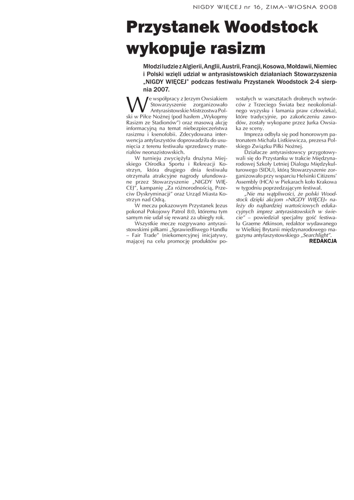 NIGDY WIĘCEJ nr 16, ZIMA-WIOSNA 2008 Przystanek Woodstock wykopuje rasizm Młodzi ludzie z Algierii, Anglii, Austrii, Francji, Kosowa, Mołdawii, Niemiec i Polski wzięli udział w antyrasistowskich działaniach Stowarzyszenia „NIGDY WIĘCEJ” podczas festiwalu Przystanek Woodstock 2-4 sierpnia 2007. W e współpracy z Jerzym Owsiakiem Stowarzyszenie zorganizowało Antyrasistowskie Mistrzostwa Polski w Piłce Nożnej (pod hasłem „Wykopmy Rasizm ze Stadionów”) oraz masową akcję informacyjną na temat niebezpieczeństwa rasizmu i ksenofobii. Zdecydowana interwencja antyfaszystów doprowadziła do usunięcia z terenu festiwalu sprzedawcy materiałów neonazistowskich. W turnieju zwyciężyła drużyna Miejskiego Ośrodka Sportu i Rekreacji Kostrzyn, która drugiego dnia festiwalu otrzymała atrakcyjne nagrody ufundowane przez Stowarzyszenie „NIGDY WIĘCEJ”, kampanię „Za różnorodnością, Przeciw Dyskryminacji” oraz Urząd Miasta Kostrzyn nad Odrą. W meczu pokazowym Przystanek Jezus pokonał Pokojowy Patrol 8:0, któremu tym samym nie udał się rewanż za ubiegły rok. Wszystkie mecze rozgrywano antyrasistowskimi piłkami „Sprawiedliwego Handlu – Fair Trade” (niekomercyjnej inicjatywy, mającej na celu promocję produktów po- wstałych w warsztatach drobnych wytwórców z Trzeciego Świata bez neokolonialnego wyzysku i łamania praw człowieka), które tradycyjnie, po zakończeniu zawodów, zostały wykopane przez Jurka Owsiaka ze sceny. Impreza odbyła się pod honorowym patronatem Michała Listkiewicza, prezesa Polskiego Związku Piłki Nożnej. Działacze antyrasistowscy przygotowywali się do Przystanku w trakcie Międzynarodowej Szkoły Letniej Dialogu Międzykulturowego (SIDU), którą Stowarzyszenie zorganizowało przy wsparciu Helsinki Citizens’ Assembly (HCA) w Piekarach koło Krakowa w tygodniu poprzedzającym festiwal. „Nie ma wątpliwości, że polski Woodstock dzięki akcjom »NIGDY WIĘCEJ« należy do najbardziej wartościowych edukacyjnych imprez antyrasistowskich w świecie” – powiedział specjalny gość festiwalu Graeme Atkinson, redaktor wydawanego w Wielkiej Brytanii międzynarodowego magazynu antyfaszystowskiego „Searchlight”. REDAKCJA
