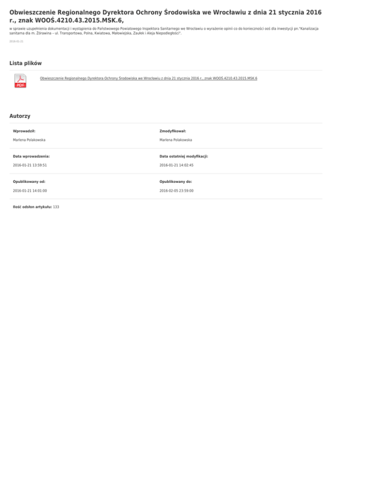 Obwieszczenie Regionalnego Dyrektora Ochrony Środowiska we Wrocławiu z dnia 21 stycznia 2016 r., znak WOOŚ.4210.43.2015.MSK.6, w sprawie uzupełnienia dokumentacji i wystąpienia do Państwowego Powiatowego Inspektora Sanitarnego we Wrocławiu o wyrażenie opinii co do konieczności ooś dla inwestycji pn."Kanalizacja sanitarna dla m. Żórawina – ul. Transportowa, Polna, Kwiatowa, Małowiejska, Zaułek i Aleja Niepodległości". 2016-01-21 Lista plików Obwieszczenie Regionalnego Dyrektora Ochrony Środowiska we Wrocławiu z dnia 21 stycznia 2016 r., znak WOOŚ.4210.43.2015.MSK.6 Autorzy Wprowadził: Zmodyfikował: Marlena Polakowska Marlena Polakowska Data wprowadzenia: Data ostatniej modyfikacji: 2016-01-21 13:59:51 2016-01-21 14:02:45 Opublikowany od: Opublikowany do: 2016-01-21 14:01:00 2016-02-05 23:59:00 Ilość odsłon artykułu: 133