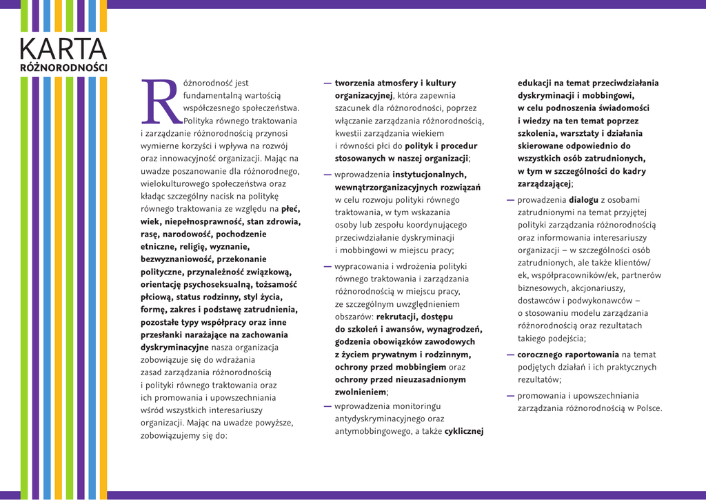 R óżnorodność jest fundamentalną wartością współczesnego społeczeństwa. Polityka równego traktowania i zarządzanie różnorodnością przynosi wymierne korzyści i wpływa na rozwój oraz innowacyjność organizacji. Mając na uwadze poszanowanie dla różnorodnego, wielokulturowego społeczeństwa oraz kładąc szczególny nacisk na politykę równego traktowania ze względu na płeć, wiek, niepełnosprawność, stan zdrowia, rasę, narodowość, pochodzenie etniczne, religię, wyznanie, bezwyznaniowość, przekonanie polityczne, przynależność związkową, orientację psychoseksualną, tożsamość płciową, status rodzinny, styl życia, formę, zakres i podstawę zatrudnienia, pozostałe typy współpracy oraz inne przesłanki narażające na zachowania dyskryminacyjne nasza organizacja zobowiązuje się do wdrażania zasad zarządzania różnorodnością i polityki równego traktowania oraz ich promowania i upowszechniania wśród wszystkich interesariuszy organizacji. Mając na uwadze powyższe, zobowiązujemy się do: — tworzenia atmosfery i kultury organizacyjnej, która zapewnia szacunek dla różnorodności, poprzez włączanie zarządzania różnorodnością, kwestii zarządzania wiekiem i równości płci do polityk i procedur stosowanych w naszej organizacji; — wprowadzenia instytucjonalnych, wewnątrzorganizacyjnych rozwiązań w celu rozwoju polityki równego traktowania, w tym wskazania osoby lub zespołu koordynującego przeciwdziałanie dyskryminacji i mobbingowi w miejscu pracy; — wypracowania i wdrożenia polityki równego traktowania i zarządzania różnorodnością w miejscu pracy, ze szczególnym uwzględnieniem obszarów: rekrutacji, dostępu do szkoleń i awansów, wynagrodzeń, godzenia obowiązków zawodowych z życiem prywatnym i rodzinnym, ochrony przed mobbingiem oraz ochrony przed nieuzasadnionym zwolnieniem; — wprowadzenia monitoringu antydyskryminacyjnego oraz antymobbingowego, a także cyklicznej edukacji na temat przeciwdziałania dyskryminacji i mobbingowi, w celu podnoszenia świadomości i wiedzy na ten temat poprzez szkolenia, warsztaty i działania skierowane odpowiednio do wszystkich osób zatrudnionych, w tym w szczególności do kadry zarządzającej; — prowadzenia dialogu z osobami zatrudnionymi na temat przyjętej polityki zarządzania różnorodnością oraz informowania interesariuszy organizacji – w szczególności osób zatrudnionych, ale także klientów/ ek, współpracowników/ek, partnerów biznesowych, akcjonariuszy, dostawców i podwykonawców – o stosowaniu modelu zarządzania różnorodnością oraz rezultatach takiego podejścia; — corocznego raportowania na temat podjętych działań i ich praktycznych rezultatów; — promowania i upowszechniania zarządzania różnorodnością w Polsce.