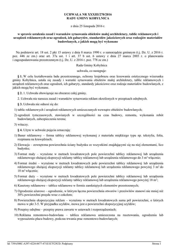 UCHWAŁA NR XXXIII/270/2016 RADY GMINY KOBYLNICA z dnia 25 listopada 2016 r. w sprawie ustalenia zasad i warunków sytuowania obiektów małej architektury, tablic reklamowych i urządzeń reklamowych oraz ogrodzeń, ich gabarytów, standardów jakościowych oraz rodzajów materiałów budowlanych, z jakich mogą być wykonane Na podstawie art. 18 ust. 2 pkt 15 ustawy z dnia 8 marca 1990 r. o samorządzie gminnym (t.j. Dz. U. z 2016 r. poz. 446 ze zm.) oraz art. 37a ust. 1 i art. 37 b ust. 6 ustawy z dnia 27 marca 2003 r. o planowaniu i zagospodarowaniu przestrzennym (t.j. Dz. U. z 2016 r. poz. 778 ze zm.) Rada Gminy Kobylnica uchwala, co następuje: § 1. W celu kształtowania ładu przestrzennego, ochrony krajobrazu oraz kreowania estetycznego wizerunku gminy Kobylnica, ustala się zasady i warunki sytuowania obiektów małej architektury, tablic reklamowych i urządzeń reklamowych oraz ogrodzeń, ich gabaryty, standardy jakościowe oraz rodzaje materiałów budowlanych, z jakich mogą być wykonane. § 2. 1. Uchwała obowiązuje na obszarze całej gminy. 2. Uchwała nie narusza zasad i warunków sytuowania reklam określonych w przepisach odrębnych. § 3. Uchwała nie odnosi się do: 1) tablic reklamowych i urządzeń reklamowych umieszczanych wewnątrz obiektów budowlanych; 2) ogrodzeń tymczasowych, stawianych w szczególności na czas budowy, remontu, wykonania robót budowlanych, zabezpieczenia terenu; 3) witaczy. § 4. Użyte w uchwale pojęcia oznaczają: 1) Baner reklamowy – forma tablicy reklamowej wykonanej z materiału miękkiego typu np. tekstylia, folia, rozpinana na krawędziach; 2) Elewacja – zewnętrzna powierzchnia ściany budynku ze wszystkimi znajdującymi się na niej elementami, lico budynku; 3) Format mały – wyrażone w metrach kwadratowych pole powierzchni tablicy reklamowej lub urządzenia reklamowego służącej ekspozycji reklamy tablicy reklamowej lub urządzenia reklamowego do 3 m2 włącznie; 4) Format średni – wyrażone w metrach kwadratowych pole powierzchni tablicy reklamowej lub urządzenia reklamowego służącej ekspozycji reklamy tablicy reklamowej lub urządzenia reklamowego powyżej 3 m2 do 18 m2 włącznie; 5) Format duży – wyrażone w metrach kwadratowych pole powierzchni tablicy reklamowej lub urządzenia reklamowego służącej ekspozycji reklamy tablicy reklamowej lub urządzenia reklamowego powyżej 18 m2; 6) Kasetony reklamowe – tablice reklamowe w formie zamkniętych elementów przestrzennych; 7) Ogrodzenie ażurowe – ogrodzenie, w którym łączna powierzchnia otworów i prześwitów stanowi nie mniej niż 30% powierzchni przęsła wraz z cokołem; 8) Powierzchnia ekspozycyjna reklam – wyrażona w metrach kwadratowych suma pól powierzchni, o których mowa w pkt 3-5. W przypadku szyldów, mowa jest o powierzchni ekspozycyjnej szyldów; 9) Przepisy odrębne – przepisy prawa zawarte w ustawach i rozporządzeniach; 10) Reklama remontowo-budowlana – tablica reklamowa umieszczona na rusztowaniu, ogrodzeniu lub wyposażeniu placu budowy, podczas trwania prac remontowo-budowlanych; Id: 739A500C-A397-4224-8477-471E1E7F25CD. Podpisany Strona 1 11) System Informacji Gminnej – zespół nośników informacji ułatwiający poruszanie się w przestrzeni gminnej, obejmujący np. oznakowanie ulic, nieruchomości, miejscowości; 12) Terenowy System Informacji Turystycznej – zespół nośników informacyjnych w zakresie produktów turystycznych województwa (w tym sieciowych, jak np.: Pomorskie Szlaki Kajakowe, Pomorskie Szlaki Rowerowe), powiatu, gminy wraz z oznakowaniem ułatwiającym przemieszczanie się po szlakach turystycznych; 13) Witacz – nośnik informacyjno-promocyjny odnoszący się do jednostki samorządu terytorialnego lub miejscowości, umieszczany przy drogach wjazdowych i wyjazdowych na teren i z terenu województwa, powiatu, gminy oraz poszczególnych miejscowości. § 5. 1. Ustala się następujące ogólne zasady sytuowania tablic i urządzeń reklamowych (łącznie z szyldami): 1) Wyklucza się sytuowanie tablic i urządzeń reklamowych w sposób: a) przesłaniający widok od strony drogi na obiekty wpisane do rejestru zabytków, witacze, b) zakłócający odczytanie znaków drogowych i ograniczający pole widoczności na skrzyżowaniach, c) zakłócający odczytanie informacji z zakresu Systemu Informacji Gminnej lub Terenowego Systemu Informacji Turystycznej; 2) Tablice i urządzenia reklamowe nie mogą być sytuowane: a) na drzewach i w zasięgu ich koron, w szpalerach drzew oraz w strefie o promieniu 10 m od pomników przyrody, b) na budowlach i urządzeniach infrastruktury technicznej, w szczególności takich elektroenergetyczne i oświetleniowe, maszty siłowni wiatrowych, stacje transformatorowe itp., jak: słupy c) na budowlach i urządzeniach o funkcji barier dźwiękochłonnych, na mostach, wiaduktach i kładkach; 3) Wyklucza się sytuowanie tablic reklamowych i urządzeń reklamowych podświetlanych służących ekspozycji zmiennych treści reklamowych typu LED, z zastosowanym oświetleniem pulsacyjnym będącym źródłem efektu stroboskopowego lub innych emitujących światło o zmiennym natężeniu; 4) Obowiązuje zakaz sytuowania banerów reklamowych, z wyjątkiem banerów reklamowych sytuowanych tymczasowo na zasadach określonych w niniejszej uchwale: a) na okres do 1 miesiąca, o formacie małym lub średnim, zawierających informację o imprezach i uroczystościach kulturalnych, edukacyjnych, turystycznych, religijnych, sportowych, b) stanowiących reklamę remontowo-budowlaną, w formie osłony rusztowania; 5) Przy sytuowaniu tablic reklamowych i urządzeń reklamowych w formie szyldów obowiązuje limit ilościowy wynoszący maksymalnie 2 szyldy na każdy podmiot prowadzący działalność na terenie danej nieruchomości. 2. Szczegółowe ustalenia w zakresie sytuowania tablic i urządzeń reklamowych (poza szyldami), są następujące: 1) Tablice i urządzenia reklamowe nie mogą by