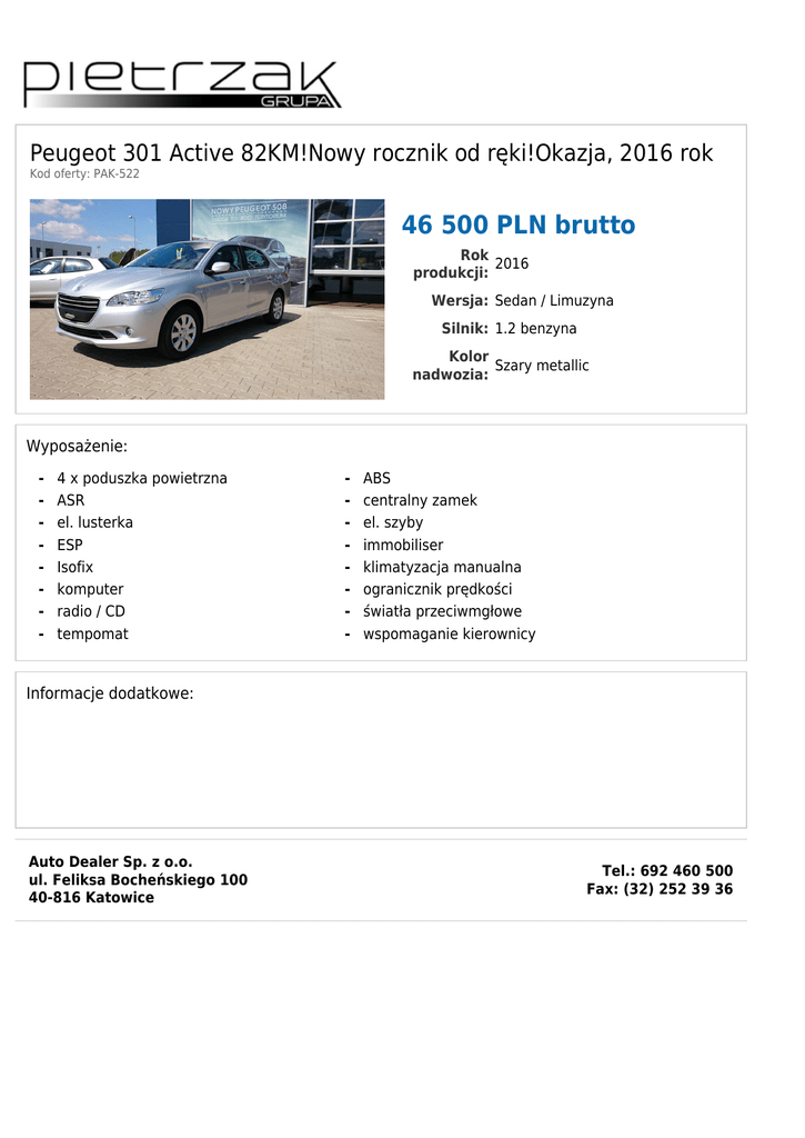 Peugeot 301 Active 82KM!Nowy rocznik od ręki!Okazja, 2016 rok Kod oferty: PAK-522 46 500 PLN brutto Rok 2016 produkcji: Wersja: Sedan / Limuzyna Silnik: 1.2 benzyna Kolor Szary metallic nadwozia: Wyposażenie: - 4 x poduszka powietrzna ASR el. lusterka ESP Isofix komputer radio / CD tempomat - ABS centralny zamek el. szyby immobiliser klimatyzacja manualna ogranicznik prędkości światła przeciwmgłowe wspomaganie kierownicy Informacje dodatkowe: Auto Dealer Sp. z o.o. ul. Feliksa Bocheńskiego 100 40-816 Katowice Tel.: 692 460 500 Fax: (32) 252 39 36