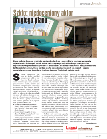advertorialX brana Szko: niedoceniony aktor drugiego planu Przykład systemu „Twin Lambda” firmy Laguna. Biura, pokoje dzienne, sypialnie, garderoby, kuchnie – wszystkie te wnętrza wymagają odpowiednio dobranych mebli. Każde z nich wymaga indywidualnego podejścia, by zapewnić funkcjonalność i użyteczność przestrzeni, ale także odpowiedni design i materiały. Szkło jest elementem, który bardzo często pojawia się w naszych wnętrzach – często sprawiając wrażenie dodatku wykończeniowego. Tak jednak być nie musi. S ystemy aluminiowe Laguny to idealny przykład wykorzystania szkła w meblarstwie. Dzięki wykorzystaniu aluminiowych ram, ramiaków, płaskowników i rączek, możliwe jest tworzenie niebagatelnych kompozycji szaf i zabudów, które ozdobią wnętrze. Takie rozwiązanie pozwala na łączenie różnych wypełnień (płyta lub płyta + szkło) na jednym skrzydle drzwi, bądź też samej tafli szklanej. Dotyczy to wypełnień o łącznej grubości 10 oraz 18 mm. W ofercie Laguny zastosowanie szkła idealnie sprawdza się w popularnych systemach, takich jak: • linia systemów na płytę 10 mm: „Twin”, „Twin Lambda”, „Twin Epsilon”, „Twin Flat”, „Twin Multi” oraz „Twin Gama”, • linia systemów na płytę 18 mm: „Intero”, „Multiomega”, „Rama”, w nowym systemie „Modern”. Coraz popularniejsze wśród klientów indywidualnych stają się szafy z wykorzystaniem systemów nawierzchniowych. Zapewniają one optyczne po- większenie szafy, ze względu na ukrycie we wnętrzu zabudowy torów i okuć. W przypadku wyboru płyty jako jednolitego elementu skrzydeł drzwi – szafie nadaje się jednolity wyląd. Alternatywą dla takiego rozwiązania jest wykorzystanie szkła z profilem ramkowym, jako skrzydła drzwi. Pozwala to wyeksponować wnętrze szafy (w przypadku wykorzystania przezroczystej tafli, a szafy jako biblioteczki) lub delikatnie zaznaczyć zawartość zabudowy, nadając wnętrzu elegancki charakter (w przypadku szkła szczotkowanego). System meblowy „Outer” daje możliwość zastosowania takiego właśnie rozwiązania. Daje on ogromne możliwości z wykorzystaniem tafli szklanej, przy jednoczesnym prostym montażu dzięki zastosowaniu prowadników „Outer”, które pozwalają na bezpieczny montaż szkła. Kuchnia jest zazwyczaj „perełką w oku” podczas projektowania domu. Właściwe podejście, zaplanowanie nie tylko kolorystyki, lecz również materiałów wykończeniowych, skutkuje doskonałym efektem końcowym. Szkło daje gwarancję nie tylko wysokiej estetyki, lecz przede wszystkim długiej żywotności. Wykorzystanie go we frontach szafek kuchennych, pozwala na eleganckie podkreślenie charakteru kuchni. Górne szafki stanowią często wyróżnik wnętrza – warto wykorzystać atut położenia ich na wysokości wzroku, by przyciągnąć uwagę i dodać kuchni eleganckiego charakteru. Idealnym rozwiązaniem jest tu „Mini Cabinet” – system przesuwny do szafkowych frontów. System ten daje ogromną uniwersalność zastosowania (nawierzchniowo, wewnętrznie, skrzydła mijane, pojedyncze, na torach pojedynczych, podwójnych, mocowanych nawierzchniowo, do czoła korpusu, wewnątrz korpusu, przykręcanych i wpuszczanych). Pozwala to na dostosowanie do indywidualnych potrzeb klientów. Zastosować go można do lekkiej zabudowy (15 kg) z możliwością zastosowania także płyty oraz frontów z samej tafli szkła. Dyskretność okuć i torów sprawia wrażenie elegancji i daje efekt luksusowego wykończenia wnętrza. Joanna Kałuska LAGUNA Fabryka Oku Sp. z o.o. Sp. k. | 80-298 Gdask | ul. Maszynowa 32 A tel.+48 58 770 48 00 | fax+48 58 743 57 01 | www.laguna.pl | www.animadomus.com.pl marzec 2015 [ BIZNES meble.pl 51