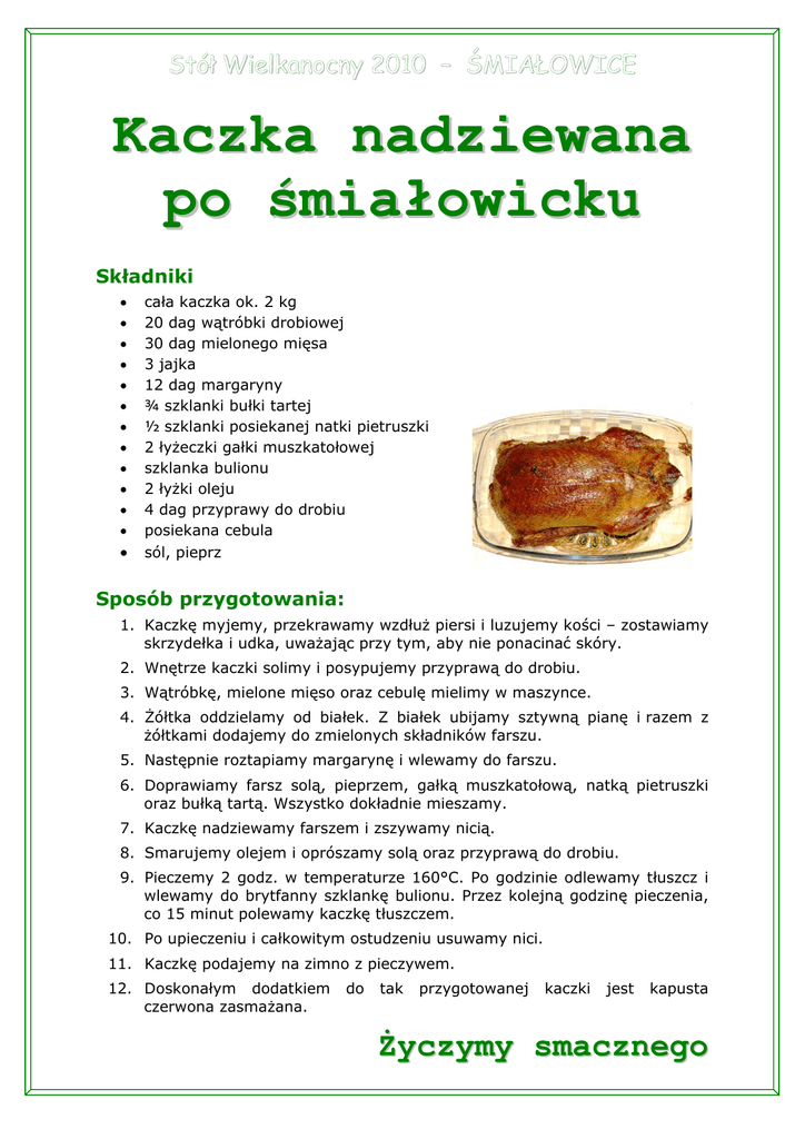 Stół Wielkanocny 2010 – ŚMIAŁOWICE Kaczka nadziewana po śmiałowicku Składniki • • • • • • • • • • • • • cała kaczka ok. 2 kg 20 dag wątróbki drobiowej 30 dag mielonego mięsa 3 jajka 12 dag margaryny ¾ szklanki bułki tartej ½ szklanki posiekanej natki pietruszki 2 łyżeczki gałki muszkatołowej szklanka bulionu 2 łyżki oleju 4 dag przyprawy do drobiu posiekana cebula sól, pieprz Sposób przygotowania: 1. Kaczkę myjemy, przekrawamy wzdłuż piersi i luzujemy kości – zostawiamy skrzydełka i udka, uważając przy tym, aby nie ponacinać skóry. 2. Wnętrze kaczki solimy i posypujemy przyprawą do drobiu. 3. Wątróbkę, mielone mięso oraz cebulę mielimy w maszynce. 4. Żółtka oddzielamy od białek. Z białek ubijamy sztywną pianę i razem z żółtkami dodajemy do zmielonych składników farszu. 5. Następnie roztapiamy margarynę i wlewamy do farszu. 6. Doprawiamy farsz solą, pieprzem, gałką muszkatołową, natką pietruszki oraz bułką tartą. Wszystko dokładnie mieszamy. 7. Kaczkę nadziewamy farszem i zszywamy nicią. 8. Smarujemy olejem i oprószamy solą oraz przyprawą do drobiu. 9. Pieczemy 2 godz. w temperaturze 160°C. Po godzinie odlewamy tłuszcz i wlewamy do brytfanny szklankę bulionu. Przez kolejną godzinę pieczenia, co 15 minut polewamy kaczkę tłuszczem. 10. Po upieczeniu i całkowitym ostudzeniu usuwamy nici. 11. Kaczkę podajemy na zimno z pieczywem. 12. Doskonałym dodatkiem czerwona zasmażana. do tak przygotowanej kaczki jest kapusta Życzymy smacznego