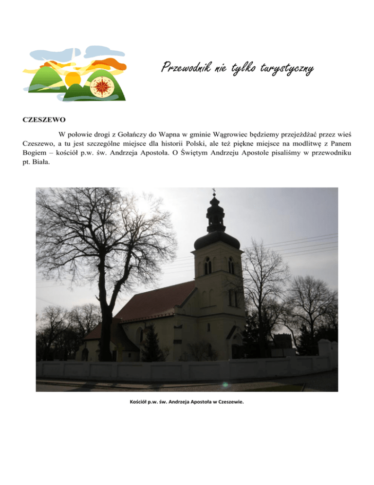 Przewodnik nie tylko turystyczny CZESZEWO W połowie drogi z Gołańczy do Wapna w gminie Wągrowiec będziemy przejeżdżać przez wieś Czeszewo, a tu jest szczególne miejsce dla historii Polski, ale też piękne miejsce na modlitwę z Panem Bogiem – kościół p.w. św. Andrzeja Apostoła. O Świętym Andrzeju Apostole pisaliśmy w przewodniku pt. Biała. Kościół p.w. św. Andrzeja Apostoła w Czeszewie. Kościół p.w. św. Andrzeja Apostoła w Czeszewie. Późnogotycki kościół św. Andrzeja pochodzi z około 1500 roku, przebudowany z neogotycką wieżą z 1909 roku, której hełm wzorowano na kościele klarysek w Bydgoszczy. Wewnątrz ołtarz główny z 1 połowy XVII wieku, z obrazem adoracji Trójcy Świętej przez króla Władysława IV i innych dostojników. Po prawej obraz Matki Boskiej Gostyńskiej z 1 połowy XVII wieku, a po lewej krucyfiks z XVII /XVIII wieku oraz epitafium Karola Libelta (pochowanego w podziemiach kościoła ) i symboliczny nagrobek jego syna. Na zewnątrz kościoła dawna kropielnica z czerwonego granitu oraz tablica ku czci ks. Stanisława Piszczygłowy (1878-1942), zamordowanego w Dachau. Na ścianie południowej epitafium zasłużonej dla sprawy narodowej rodziny Szumanów, za prezbiterium grób Pantaleona Szumana (1782 – 1849), teścia Karola Libelta. Figura Matki Boskiej na kaplicy pogrzebowej w Czeszewie. Kilka słów o … Karolu Fryderyku Libeltcie Urodził się w dniu 8 kwietnia 1807 r. w Poznaniu-Chwaliszewie, zm. 9 czerwca 1875 r. w Brdowie – polski filozof mesjanistyczny, działacz polityczny i społeczny, prezes Poznańskiego Towarzystwa Przyjaciół Nauk. Był synem szewca. Ukończył Gimnazjum św. Marii Magdaleny w Poznaniu, w latach 1826-1830 studiował w Berlinie filologię klasyczną, filozofię i nauki matematyczno-przyrodnicze. Był tam ulubionym uczniem Hegla. W 1830 obronił doktorat i odbył krótką podróż poznawczą po Europie. Po powrocie do Polski wziął udział w powstaniu listopadowym jako artylerzysta, co zamknęło mu na kilka lat drogę do pracy nauczyciela. Postawa w kilku powstańczych bitwach przyniosła mu awans na podporucznika i krzyż Orderu Virtuti Militari. Działalność społeczna i polityczna W 1840 r. otworzył w Poznaniu pensjonat dla uczniów, podjął także pracę nauczyciela w gimnazjum. Zaangażował się w działalność publicystyczną, publikował na łamach pism poznańskich (Tygodnik Literacki) i warszawskich, zainicjował wydawanie Dziennika Domowego. W latach 1841-1843 brał udział w cyklu wykładów – odczytów publicznych, zorganizowanych z inicjatywy Tytusa Działyńskiego w Sali Czerwonej Pałacu Działyńskich w Poznaniu, gdzie prowadził wykłady z zakresu estetyki. Działał w kilku organizacjach, m.in. Towarzystwie Naukowej Pomocy (od 1841). Od 1838 należał do komitetu współpracującego z Towarzystwem Demokratycznym Polskim (tzw. Komitet Libelta), zajmującego się przygotowaniami powstania w Wielkopolsce. Libelt na prośbę Edwarda Raczyńskiego opracował również instrukcję dla pracownika planowanego przez Raczyńskiego przysionka śmierci – kostnicy, przeznaczonej dla osób obawiających się pogrzebania żywcem. Był wyznaczony na reprezentanta Poznania w przyszłym Rządzie Narodowym. W związku z tym opracował powstańczą proklamację, będącą później podstawą manifestu krakowskiego. Aresztowany przez władze pruskie i postawiony przed sądem, został w procesie berlińskim skazany na 20 lat twierdzy (1847). Uwolniony przez wydarzenia rewolucji 1848 r. powrócił do Poznania i został członkiem Komitetu Narodowego. Początkowo był zwolennikiem porozumienia z Prusami i wojny z Rosją, ale widząc fiasko tej opcji poparł tzw. wojnę ludową. Po niepowodzeniu walki zbrojnej zaangażował się w działalność Ligi Polskiej (1848-1850) oraz reprezentował poznańskie w parlamencie we Frankfurcie. Brał także udział w zjeździe polskim we Wrocławiu i Kongresie Słowiańskim w Pradze (1848), gdzie wystąpił z koncepcją niepodległej Polski jako państwa federacyjnego. Był jednym z autorów Manifestu zboru słowiańskiego do ludów Europy. W 1849 r. został wybrany do parlamentu pruskiego i kierował Kołem Polskim, ale wkrótce złożył mandat i skoncentrował się na pracy wydawniczej i publicystycznej w Dzienniku Polskim. Po 1850 r. ograniczył działalność, chociaż ponownie pełnił mandat poselski i kierował Kołem Polskim, wielokrotnie występując w sprawach polskich. Aktywność polityczną zastąpił pracą organiczną. Był w gronie założycieli Poznańskiego Towarzystwa Przyjaciół Nauk i od 1868 r. pełnił funkcję jego prezesa. Działał także w innych organizacjach. Był dwukrotnie żonaty. Pierwsza żona Elżbieta z Jaworskich zmarła krótko po ślubie, z drugą, Marią z Szumanów, miał sześcioro dzieci – cztery córki i dwóch synów. Syn Karol zginął w bitwie pod Brdowem w powstaniu styczniowym w 1863. Karol Fryderyk Libelt zmarł w dniu 09 czerwca 1875 r. i został pochowany w Czeszewie. Kościół p.w. św. Andrzeja Apostoła w Czeszewie. Naprzeciw kościoła, na domu nr 34 stojącym na miejscu dawnej szkoły, tablica upamiętniająca pierwsze w północnej Wielkopolsce kółko rolnicze, utworzone 14.IV.1867 roku z inicjatywy Karola Lieblta. Dom nr 27 (poczta) to dawny zajazd zbudowany w 1912 roku. Pomnik przed domem nr 19 ustawiono na miejscu, gdzie 21.XII.1918 roku uformował się oddział powstańców wielkopolskich. Kościół p.w. św. Andrzeja Apostoła w Czeszewie. Tablica pamiątkowa ku czci ks. Proboszcza Stanisława Piszczygłowa zamordowanego przez hitlerowców. Kilka słów o… Ks. Proboszczu Stanisławie Piszczygłowa Aresztowany w dniu 06.10.1941 i uwięziony w obozie przejściowym w Lądzie. Stamtąd w dniu 30.10.1941 r. przetransportowany do obozu koncentracyjnego KL Dachau. W końcu — całkowicie wycieńczony — przewieziony w tzw. „transporcie inwalidów” do Hartheim, gdzie został zamo