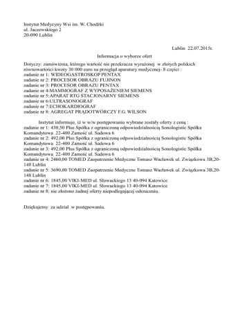 Instytut Medycyny Wsi im. W. Chodźki ul. Jaczewskiego 2 20-090 Lublin Lublin 22.07.2015r. Informacja o wyborze ofert Dotyczy: zamówienia, którego wartość nie przekracza wyrażonej w złotych polskich równowartości kwoty 30 000 euro na przegląd aparatury medycznej- 8 części : zadanie nr 1: WIDEOGASTROSKOP PENTAX zadanie nr 2: PROCESOR OBRAZU FUJINON zadanie nr 3: PROCESOR OBRAZU PENTAX zadanie nr 4:MAMMOGRAF Z WYPOSAŻENIEM SIEMENS zadanie nr 5:APARAT RTG STACJONARNY SIEMENS zadanie nr 6:ULTRASONOGRAF zadanie nr 7:ECHOKARDIOGRAF zadanie nr 8: AGREGAT PRĄDOTWÓRCZY F.G. WILSON Instytut informuje, iż w w/w postępowaniu wybrane zostały oferty z ceną : zadanie nr 1: 430,50 Plus Spółka z ograniczoną odpowiedzialnością Sonologistic Spółka Komandytowa 22-400 Zamość ul. Sadowa 6 zadanie nr 2: 492,00 Plus Spółka z ograniczoną odpowiedzialnością Sonologistic Spółka Komandytowa 22-400 Zamość ul. Sadowa 6 zadanie nr 3: 492,00 Plus Spółka z ograniczoną odpowiedzialnością Sonologistic Spółka Komandytowa 22-400 Zamość ul. Sadowa 6 zadanie nr 4: 2460,00 TOMED Zaopatrzenie Medyczne Tomasz Wacławek ul. Związkowa 3B,20148 Lublin zadanie nr 5: 3690,00 TOMED Zaopatrzenie Medyczne Tomasz Wacławek ul. Związkowa 3B,20148 Lublin zadanie nr 6: 1845,00 VIKI-MED ul. Słowackiego 13 40-094 Katowice zadanie nr 7: 1845,00 VIKI-MED ul. Słowackiego 13 40-094 Katowice zadanie nr 8: nie złożono żadnej oferty niepodlegającej odrzuceniu. Dziękujemy za udział w postępowaniu.
