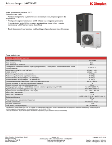 Arkusz danych LAW 9IMR Maks. temperatura zasilania: 55 °C Kolor obudowy: biała Poniższe komponenty są zamontowane z oszczędnością miejsca i gotowe do eksploatacji. - Przełączalne ogrzewanie rurowe (2/4/6 kW) do wspomagania ogrzewania - Zbiornik ciepłej wody 300 l z rurowym wymiennikiem ciepła 3,2 m˛ i grzałką kołnierzową 1,5 kW do termicznej dezynfekcji - Zawór bezpieczeństwa łącznie z możliwością przyłączenia naczynia wzbiorczego Dane techniczne Dimplex (niskotemperaturowe) Znak zamówieniowy LAW 9IMR Kolor obudowy Maks. temperatura zasilania Dolna granica zastosowania źródła ciepła (tryb ogrzewania) / Górna granica zastosowania źródła ciepła (tryb ogrzewania) Moc grzewcza A2/W35 / COP A2/W35* / COP A7/W35* Poziom mocy akustycznej pomieszczenia Poziom mocy akustycznej części zewnętrznej Poziom ciśnienia akustycznego w 1 m (wewnątrz) Poziom ciśnienia akustycznego w 1 m (zewnętrzny) Oznaczenie czynnika chłodniczego / Ilość czynnika chłodniczego Długość przewodu do czynnika chłodniczego (standard) Długość przewodu czynnika chłodniczego max. Przepływ gorącej wody A7 / W35 / Strata ciśnienia przepływu gorącej wody A7 W35 Wymiary części zewnętrznej (szer. x wys. x gł.) Wymiary części wewnętrznej (szer. x wys. x gł.) Masa części zewnętrznej Masa części wewnętrznej Zasilanie elektryczne Prąd rozruchowy z rozrusznikiem łagodnym Sposób odszraniania Przyłącze ogrzewania Znak jakości EHPA (ważny do) biała 55 °C -20 do 30 °C 5,30 kW / 3,60 5,60 kW / 4,80 42 dB (A) 63 dB (A) 35 dB (A) 51 dB (A) R410A / 1,9 kg 7m 50 m 1,6 m³/h / 20000 Pa 950 x 834 x 330 mm 740 x 1920 x 950 mm 69 kg 215 kg 1/N/PE ~230 V, 50 Hz / 3/N/PE ~400 V, 50 Hz 1A Odwrócenie obiegu 1 ¼ cal tak / 09.09.2016 *Uruchomienie pompy ciepła typu Split ze względu na wymagane kwalifikacje w zakresie chłodnictwa w celu połączenia jednostki wewnętrznej i zewnętrznej musi być bezwzględnie przeprowadzone przez autoryzowany serwis (IN 03 WPS). **Proszę uwzględnić, że potrzebne będzie dodatkowe miejsce dla przyłączenia rur, obsługi i konserwacji. Glen Dimplex Deutschland GmbH Oddział Dimplex Am Goldenen Feld 18 95326 Kulmbach Strona 1/4 Zastrzegamy sobie prawo do zmian oraz błędów! Email: [email protected] Internet: www.dimplex.de Internet: 24.07.2014 Telefon: +49 (0)9221 709-201 Telefax: +49 (0)9221 709-339 Wyposażenie urządzenia LAW 9IMR Opis Typ-nr Numer Ilości artykułu przykładowe Sztuk Cena Pompa ciepła Kołnierz uszczelniający ścienny (stal nierdzewna V2A) Samouszczelniający kołnierz ścienny (rura ochronna z wężem skurczowym) MDF 145 358910 MDM 145 358890 EB KPV WWM 25 MMH 25 VTB 25 AS 976 AS 976-1 CTHK 630 CTHK 631 VSE 32-50 VSE 32-100 VSE 32-150 VSE 32-200 VSE 32-300 PSW 500 PSW 1000 348650 346600 348640 339870 322180 330530 363610 336180 362520 362530 362540 362550 362560 339210 361640 SRX 080M SRX 120M SRX 140M SRX 180M 359080 359090 359100 359110 NWPM EWPM LWPM 410 AP PGD NTC-10M FG 3115 356960 356970 339410 356570 363600 336620 Akcesoria hydrauliczne Dodatkowe podzespoły EB KPV Moduł ciepłej wody / moduł niemieszanego obiegu grzewczego Mieszany obieg grzewczy z czujnikiem temperatury Belka rozdzielacza Przyłącze węża 1* Przyłącze węża 1¼" (32 x 5,5mm)* Grzałka zanurzeniowa 4,5 kW; ~230 V Grzałka 2,0 kW Wstępnie obrobiona rura falista ze stali nierdzewnej DN 32 Wstępnie obrobiona rura falista ze stali nierdzewnej DN 32 Wstępnie obrobiona rura falista ze stali nierdzewnej DN 32 Wstępnie obrobiona rura falista ze stali nierdzewnej DN 32 Wstępnie obrobiona rura falista ze stali nierdzewnej DN 32 Uniwersalny zbiornik buforowy 500 l* Stojący zbiornik buforowy 1000 l* 1 1 Akcesoria do ogrzewania Konwektor wentylatorowy, ogrzewanie, 800 W Konwektor wentylatorowy, ogrzewanie, 1200 W Konwektor wentylatorowy, ogrzewanie, 1400 W Konwektor wentylatorowy, ogrzewanie, 1800 W Wyposażenie dodatkowe techniki regulacji Rozszerzenie dla podłączenia sieci Ethernet Rozszerzenie dla przyłączenia magistrali KNX/EIB Rozszerzenie dla połączenia typu Modbus Pilot zdalnego sterowania WPM 2006/2007/EconPlus/R* Czujnik temperatury NTC-10 z tuleją metalową Czujnik temperatury zewnętrznej w obudowie * Dodatkowe szczególne wyposażenie do dyspozycji / wymagane Ważna wskazówka: Kombinacja komponentów i podana ilość przedstawia niewiążące przykładowe urządzenie, które musi być sprawdzone i dopasowane według indywidualnych potrzeb. Wielkość pompy powinna zostać sprawdzona według spadku ciśnienia urządzenia i minimalnego przepływu wody grzewczej pompy ciepła. Glen Dimplex Deutschland GmbH Oddział Dimplex Am Goldenen Feld 18 95326 Kulmbach Strona 2/4 Zastrzegamy sobie prawo do zmian oraz błędów! Email: [email protected] Internet: www.dimplex.de Internet: 24.07.2014 Telefon: +49 (0)9221 709-201 Telefax: +49 (0)9221 709-339 Pompa ciepła powietrze/woda typu split, schemat połączeń, Pompa ciepła i grzałka nurnikowa Adnotacje: Hydrauliczne połączenie obrazuje schematyczne przedstawienie niezbędnych do działania elementów i powinno służyć jako pomoc do przeprowadzenia własnych projektów. Aktualną wersję można w każdej chwili ściągnąć pod adresem www.dimplex.de/nc/pl/professional/plan owanie-online/schematy-po3-czen.html. Nie zawiera ono wszystkich koniecznych zgodnie z normą DIN EN 12828 instalacji bezpieczeństwa, elementów utrzymania stałego ciśnienia oraz ewentualnie koniecznych dodatkowych urządzeń zamykających do prac konserwacyjnych i serwisowych. Nastawienia sterownika pompy ciepła i istniejącego ewentualnie zewnętrznego urządzenia regulującego muszą zostać dostosowane do przedłożonego schematu połączeń. Może wystąpić konieczność dokonania aktualizacji oprogramowania! Glen Dimplex Deutschland GmbH Oddział Dimplex Am Goldenen Feld 18 95326 Kulmbach Strona 3/4 Zastrzegamy sobie prawo do zmian oraz błędów! Email: [email protected] Internet: www.dimpl
