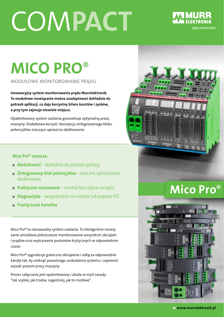 Compact Mico Pro® Modułowe monitorowanie prądu Innowacyjny system monitorowania prądu Murrelektronik. To modułowe rozwiązanie można zaadaptować dokładnie do potrzeb aplikacji, co daje korzystny bilans kosztów i zysków, a przy tym zajmuje niewiele miejsca. Opatentowany system zasilania gwarantuje optymalną pracę maszyny. Dodatkowa korzyść: koncepcja zintegrowanego bloku potencjałów znacząco upraszcza okablowanie. Mico Pro® oznacza: Modułowość – dokładnie do potrzeb aplikacji Zintegrowany blok potencjałów – znaczne uproszczenie okablowania Praktyczne mocowanie – montaż bez użycia narzędzi Diagnostyka – bezpośrednio na module lub poprzez PLC Mico Pro® Przełączanie kanałów Mico Pro® to niezawodny system zasilania. To inteligentne rozwiązanie umożliwia jednoczesne monitorowanie wszystkich obciążeń i prądów oraz wykrywanie poziomów krytycznych w odpowiednim czasie. Mico Pro® sygnalizuje graniczne obciążenia i odłącza odpowiednie kanały tak, by uniknąć poważnego uszkodzenia systemu i zapewnić wysoki poziom pracy maszyny. Proces załączania jest opatentowany i działa w myśl zasady: “tak szybko, jak trzeba; najpóźniej, jak to możliwe". Informacje zawarte w niniejszym prospekcie zostały opracowane z najwyższą starannością. Odpowiedzialność za ich prawdziwość, pełność i aktualność jest jednak ograniczona do przypadków rażącego zaniedbania. ÔÔ www.murrelektronik.pl Modułowość – dokładność do ostatniego kanału • Modułowy system na napięcie pracy 12 i 24 V DC • Montaż zamkniętego systemu bez użycia narzędzi • Ustawione moduły z 1, 2 lub 4 kanałami dla prądu zasilania 2, 4, 6, 8, 10 i 16 A – zabezpieczenie przed manipulacją • Regulowane moduły z 1, 2 lub 4 kanałami dla prądu zasilania od 1 do 10 A lub od 11 do 20 A – regulacja poprzez naciśnięcie przycisku • Wymagana minimalna ilość miejsca: zaledwie 8, 12 i/lub 24 mm na moduł Wygodne mocowanie – Montaż bez użycia narzędzi • I nnowacyjny system mostkowania za pomocą dwóch szyn • Możliwość przycięcia do odpowiedniej długości i podłączenia •D iagnostyka i sygnały sterujące poprzez styki sprężynowe •W tykowe zaciski sprężynowe •D obrze widoczne etykiety oraz status sygnalizowany diodami LED Diagnostyka – bezpośrednio na module lub poprzez kontrolki • Sygnalizacja statusu za pomocą diody LED na każdym kanale •D iagnostyka grupowa całego modułu na module zasilania •M oduły z regulowanymi ustawieniami umożliwiają diagnostykę sygnałów poszczególnych kanałów • Ostrzeżenie o zbliżaniu się do 90 % obciążenia •P onowne załączenia kanału po naciśnięciu przycisku lub przez sygnał z PLC Informacje szczegółowe • Monitorowanie prądów każdego kanału aż do 20 A • Optymalne możliwości etykietowania dla zapewnienia przejrzystości w szafie • Wysokie możliwości rozruchowe – aż do 30 mF na kanał przy pełnym obciążeniu • Możliwość pracy z zasilaczami 5 A MicoPro® • Załączanie kaskadowe poszczególnych kanałów na modułach dla uniknięcia pików prądowych ~ Przełączanie kanałów Konstrukcja kaskadowa – pełna selektywność • Możliwość podłączenia dodatkowej stacji Mico Pro® na kanale Mico przy prądzie zasilania powyżej 10 A Integracja – Koncepcja bloku potencjałów • Opcje połączeniowe na +24 V oraz 0 V na każdym kanale • Zewnętrzne zaciski to już przeszłość – potencjał 0 V/GND jest teraz podłączony bezpośrednio do Mico Pro® • Porządkuje instalację, redukuje potrzebne okablowanie, oszczędza miejsce w szafie • Możliwość podłączenia aż do 2 x 12 potencjałów dzięki blokom potencjałów • F unkcja przełączania kanałów poprzez sygnał PLC na modułach • I mplementacja krótkich częstotliwości przełączania (aż do 10 Hz) oraz dłuższe okresy czuwania (np. w maszynach podczas przerw produkcyjnych) Wysokie koszty całkowite Oszczędność miejsca i kosztów Compact Dane do zamówienia Mico Pro® Moduł zasilania Opis Mico Pro® PM 24 V DC/40 A Moduły ze stałym zakresem prądu Numer artykułu Moduł zasilania, max. 40 A 9000-41190-0000000 Liczba kanałów Prąd Mico Pro® fix 1.2 1 2 A 9000-41011-0200000 Mico Pro® fix 1.4 1 4 A 9000-41011-0400000 Mico Pro® fix 1.6 1 6 A 9000-41011-0600000 Mico Pro® fix 1.8 1 8 A 9000-41011-0800000 Mico Pro® fix 1.10 1 10 A 9000-41011-1000000 Mico Pro® fix 1.16 1 16 A 9000-41011-1600000 Mico Pro® fix 2.2 2 2 A 9000-41012-0200000 Mico Pro® fix 2.4 2 4 A 9000-41012-0400000 Mico Pro® fix 2.6 2 6 A 9000-41012-0600000 Mico Pro® fix 4.2 4 2 A 9000-41014-0200000 Mico Pro® fix 4.4 4 4 A 9000-41014-0400000 Mico Pro® fix 4.6 4 6 A 9000-41014-0600000 Liczba kanałów Prąd Mico Pro® flex 1.10 1 1-2-3-4-5-6-7-8-9-10 A 9000-41091-0101000 Mico Pro® flex 1.20 1 11-12-13-14-15-16-17-18- 9000-41091-1102000 Moduły z regulowanym zakresem prądu Numer artykułu Numer artykułu 19-20 A Mico Pro® flex 2.10 2 1-2-3-4-5-6-7-8-9-10 A 9000-41092-0101000 Mico Pro® flex 4.10 4 1-2-3-4-5-6-7-8-9-10 A 9000-41094-0101000 Akcesoria Opis Numer artykułu Mico Pro® PD 2x12 Blok potencjałów, 2 x 12, max. 20 A 9000-41000-0000212 Mico Pro® Mostek 2 x niebieski max. 40 A, długość 500 mm 9000-41000-0000000 Mico Pro® Mostek 2 x czerwony max. 40 A, długość 500 mm 9000-41000-0000001 Mico Pro® Mostek max. 40 A, długość 500 mm 1 x czerwony, 1 x niebieski 9000-41000-0000002 Informacje zawarte w niniejszym prospekcie zostały opracowane z najwyższą starannością. Odpowiedzialność za ich prawdziwość, pełność i aktualność jest jednak ograniczona do przypadków rażącego zaniedbania. Nr Art. 9871239 ÔÔ www.murrelektronik.pl