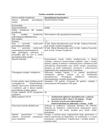 Sylabus modułów kształcenia Nazwa modułu kształcenia Specjalizacja kuratorska I Nazwa jednostki prowadzącej Instytut Historii Sztuki moduł Kod modułu Język kształcenia Efekty kształcenia dla modułu kształcenia Typ modułu kształcenia (obowiązkowy/fakultatywny) Rok studiów Semestr Imię i nazwisko osoby/osób prowadzących moduł Imię i nazwisko osoby/osób egzaminującej/egzaminujących bądź udzielającej zaliczenia, w przypadku gdy nie jest to osoba prowadząca dany moduł Sposób realizacji Polski Obowiązkowy dla specjalności kuratorskiej I 1-2 dr hab. Maria Hussakowska, prof. dr hab. Andrzej Szczerski, prof. dr hab. Tomasz Gryglewicz dr hab. Maria Hussakowska, prof. dr hab. Andrzej Szczerski, prof. dr hab. Tomasz Gryglewicz konwersatoria (część wiedzy przekazywana w formie wykładu, częściowo ilustrowanego slajdami, część w formie dysputy, opartej na lekturze wskazanej przez wykładowcę lub prowadzonej bezpośrednio przy dziele sztuki); seminarium (dysputa na temat wiadomości, zawartych w referowanych fragmentach prac magisterskich), konsultacje. Wymagania wstępne i dodatkowe Zaliczenie modułu Ogólny I (w ramach specjalizacji seminarium główne zmienia się na seminarium specjalistyczne. Wymagania dodatkowe: zaliczenie konwersatorium z krytyki artystycznej. Liczba godzin zajęć dydaktycznych Seminaria 120 godzin, ćwiczenia 60 godzin, wykłady i wymagających bezpośredniego konwersatoria obowiązkowe 305 godz. udziału nauczyciela akademickiego i studentów, gdy w danym module przewidziane są takie zajęcia Liczba punktów ECTS przypisana 66 modułowi Bilans punktów ECTS 1. Seminarium (główne) specjalistyczne z zakresu kuratorstwa dla I roku st. II stopnia – 15 pkt 2. Krytyka artystyczna (obowiązkowe konwersatorium na zaliczenie z oceną) – 4 pkt Stosowane metody dydaktyczne dyskusja na podstawie wskazanej literatury lub referatu, dyskusja na podstawie zreferowanych fragmentów pracy magisterskiej i ich ocena, dysputa przy dziele sztuki, konsultacje Metody sprawdzania i oceny Postępy w pisaniu pracy magisterskiej będę sprawdzane w efektów kształcenia uzyskanych trakcie referowania jej fragmentów na seminariów i w czasie przez studentów konsultacji z promotorem. współczesnej i ośrodku kultury – egzamin ustny. Forma i warunki zaliczenia modułu, w tym zasady dopuszczenia do egzaminu, zaliczenia, a także forma i warunki zaliczenia poszczególnych zajęć wchodzących w zakres danego modułu Z konwersatorium zaliczenie w postaci krótkiego testu na ostatnich lub przedostatnich zajęciach. Zaliczenia prac pisemnych dokonuje się na podstawie złożonego egzemplarza pracy w wersji papierowej, w której zostały uwzględnione poprawki wskazane przez prowadzącego zajęcia. Prowadzący ustala harmonogram prezentowania prac w toku zajęć, a ostateczny termin złożenia pierwszej wersji do poprawki to ostatni dzień zajęć dydaktycznych. Prowadzący zajęcia ma prawo odmówić zaliczenia pracy nieuwzględniającej wskazanych przez niego korekt i złożonej w drugim tygodniu sesji poprawkowej. Warunkiem zaliczenia modułu jest regularne uczęszczanie na zajęcia (dopuszczalne są dwie nieobecności na zajęciach z każdego przedmiotu). Należy też uzyskać zaliczenie z konwersatorium i zaliczenie na ocenę z seminarium magisterskiego. Treści modułu kształcenia Moduł obejmuje następujące przedmioty: 1. Seminarium (główne) specjalistyczne z zakresu kuratorstwa dla I roku st. II stopnia 2. Krytyka artystyczna (obowiązkowe konwersatorium na zaliczenie) Wykaz literatury podstawowej i Wykazy literatury do poszczególnych przedmiotów zawarte w uzupełniającej, obowiązującej do tabelach poszczególnych przedmiotów zaliczenia danego przedmiotu Metody i kryteria oceniania Zajęcia są oceniane wg następujących kryteriów: Gruntowna znajomość problematyki, zaprezentowanej na zajęciach i we wskazanej literaturze, umiejętność zastosowania metod badawczych, zaprezentowanych w trakcie zajęć (sprawdzona poprzez analizę konkretnego dzieła sztuki); umiejętność napisania i właściwego zredagowania (kompozycja, przypisy, dobór ilustracji) dojrzałych tekstów historyczno-artystycznych poświęconych zagadnieniom związanym z kuratorstwem (zawierających oryginalne ustalenia badawcze i interpretacje) z wykorzystaniem literatury polskiej i obcojęzycznej i źródeł i archiwalnych. Wymagane jest regularne uczęszczanie na wszystkie zajęcia. Wymiar, zasady i forma odbywania Program modułu kształcenia nie przewiduje praktyk praktyk, w przypadku, gdy program zawodowych kształcenia przewiduje praktyki Tabele przedmiotów Nazwa przedmiotu 1. Seminarium (główne) specjalistyczne kuratorstwa dla I roku st. II stopnia prowadzącej Instytut Historii Sztuki Nazwa jednostki przedmiot Nazwa i kod modułu do którego należy przedmiot Język kształcenia Typ przedmiotu Imię i nazwisko osoby/osób prowadzących przedmiot Sposób realizacji Wymagania wstępne i dodatkowe Liczba godzin zajęć dydaktycznych Stosowane metody dydaktyczne z zakresu Kuratorska II IHS-II-S- (każdy prowadzący ma inny kod) Polski Obowiązkowy w ramach modułu Dr hab. Maria Hussakowska, dr hab. Andrzej Szczerski, prof. dr hab. Tomasz Gryglewicz Seminarium Brak 60 Dyskusja na temat referowanych fragmentów prac lub lektury wskazanej przez promotora, zajęcia i dyskusje przy dziełach sztuki, analizowanie projektów wystaw i miejsc, w których mają być prezentowane, wykład promotora, konsultacje Sposób zaliczenia przedmiotu Zaliczenie na ocenę Forma i warunki zaliczenia, metody Zaliczenia prac pisemnych dokonuje się na podstawie i kryteria oceniania złożonego egzemplarza pracy w wersji papierowej, w której zostały uwzględnione poprawki wskazane przez prowadzącego zajęcia. Prowadzący ustala harmonogram prezentowania prac w toku zajęć, a ostateczny termin złożenia pierwszej wersji do poprawki to ostatni dzień zajęć dydaktycznych. Prowadząc