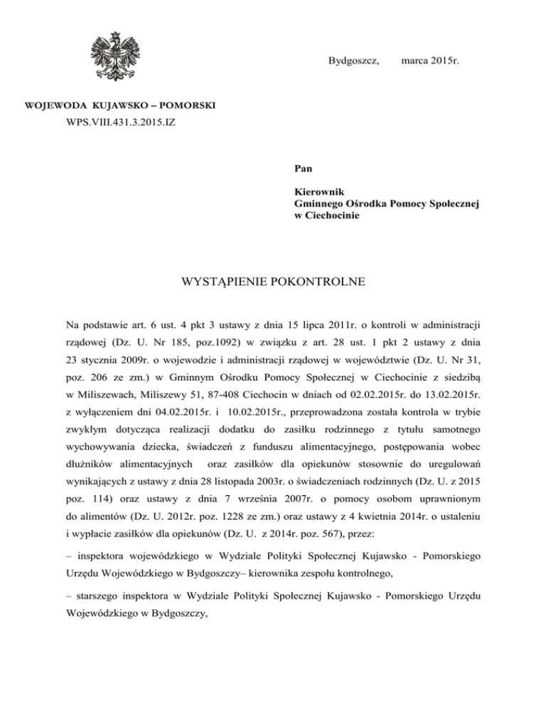 Bydgoszcz, marca 2015r. WOJEWODA KUJAWSKO – POMORSKI WPS.VIII.431.3.2015.IZ Pan Kierownik Gminnego Ośrodka Pomocy Społecznej w Ciechocinie WYSTĄPIENIE POKONTROLNE Na podstawie art. 6 ust. 4 pkt 3 ustawy z dnia 15 lipca 2011r. o kontroli w administracji rządowej (Dz. U. Nr 185, poz.1092) w związku z art. 28 ust. 1 pkt 2 ustawy z dnia 23 stycznia 2009r. o wojewodzie i administracji rządowej w województwie (Dz. U. Nr 31, poz. 206 ze zm.) w Gminnym Ośrodku Pomocy Społecznej w Ciechocinie z siedzibą w Miliszewach, Miliszewy 51, 87-408 Ciechocin w dniach od 02.02.2015r. do 13.02.2015r. z wyłączeniem dni 04.02.2015r. i 10.02.2015r., przeprowadzona została kontrola w trybie zwykłym dotycząca realizacji dodatku do zasiłku rodzinnego z tytułu samotnego wychowywania dziecka, świadczeń z funduszu alimentacyjnego, postępowania wobec dłużników alimentacyjnych oraz zasiłków dla opiekunów stosownie do uregulowań wynikających z ustawy z dnia 28 listopada 2003r. o świadczeniach rodzinnych (Dz. U. z 2015 poz. 114) oraz ustawy z dnia 7 września 2007r. o pomocy osobom uprawnionym do alimentów (Dz. U. 2012r. poz. 1228 ze zm.) oraz ustawy z 4 kwietnia 2014r. o ustaleniu i wypłacie zasiłków dla opiekunów (Dz. U. z 2014r. poz. 567), przez: – inspektora wojewódzkiego w Wydziale Polityki Społecznej Kujawsko - Pomorskiego Urzędu Wojewódzkiego w Bydgoszczy– kierownika zespołu kontrolnego, – starszego inspektora w Wydziale Polityki Społecznej Kujawsko - Pomorskiego Urzędu Wojewódzkiego w Bydgoszczy, w zakresie: 1. przedmiot kontroli: prawidłowość przyznawania i wypłaty dodatku do zasiłku rodzinnego z tytułu samotnego wychowywania dziecka, świadczeń z funduszu alimentacyjnego, postępowania wobec dłużników alimentacyjnych oraz zasiłków dla opiekunów w okresie zasiłkowym 2013/2014 stosownie do uregulowań wynikających z ustawy z dnia 28 listopada 2003r. o świadczeniach rodzinnych (Dz. U. z 2015r. poz. 114) i ustawy z dnia 7 września 2007 r. o pomocy osobom uprawnionym do alimentów (Dz. U. 2012r. poz. 1228 z późn.zm.) oraz ustawy z 4 kwietnia 2014r. o ustaleniu i wypłacie zasiłków dla opiekunów (Dz. U. z 2014r. poz. 567) 2. okres objęty kontrolą: okres zasiłkowy 2013/2014 w zakresie świadczeń z funduszu alimentacyjnego, 2013/2014 – w zakresie świadczeń rodzinnych, czerwiec 2014r. w zakresie zasiłku dla opiekunów. W wyniku przeprowadzonej kontroli kontrolowaną działalność ocenia się: pozytywnie z nieprawidłowościami na podstawie ustaleń dokonanych w wyniku weryfikacji wybranych losowo akt 7 świadczeniobiorców pobierających dodatek do zasiłku rodzinnego z tytułu samotnego wychowywania dziecka, akt 5 wierzycielek pobierających świadczenie z funduszu alimentacyjnego w okresie zasiłkowym 2013/2014 w tym ocenie poddano postępowanie wobec dłużników alimentacyjnych, akt 10 świadczeniobiorców pobierających zasiłek dla opiekunów w miesiącu czerwcu 2014r. W wyniku analizy materiału źródłowego zespół kontrolny ustalił: - kompletność i ważność upoważnień i pełnomocnictw dla pracowników Gminnego Ośrodka Pomocy Społecznej w Ciechocinie do podejmowania działań wobec dłużników alimentacyjnych, prowadzenia postępowania wobec dłużników alimentacyjnych w tym przeprowadzania wywiadów alimentacyjnych, przekazywania do biura informacji gospodarczej o zobowiązaniach dłużników alimentacyjnych oraz prowadzenia postępowań w sprawach z zakresu świadczeń z funduszu alimentacyjnego, a także do prowadzenia postępowań w sprawach z zakresu świadczeń rodzinnych oraz zasiłków dla opiekunów. (Akta kontroli, str. 18-22) - kompletność i ważność upoważnień dla kierownika Gminnego Ośrodka Pomocy Społecznej w Ciechocinie do prowadzenia oraz wydawania decyzji administracyjnych wynikających z realizacji ustawy z dnia 28 listopada 2003r. o świadczeniach rodzinnych oraz ustawy z dnia 2 7 września 2007 r. o pomocy osobom uprawnionym do alimentów a także ustawy o ustaleniu i wypłacie zasiłków dla opiekunów. (Akta kontroli, str. 18-19) - kompletność składanych wniosków o ustalenie prawa do świadczenia z funduszu alimentacyjnego zgodnie w wymogami rozporządzenia z dnia 7 lipca 2010r. w sprawie sposobu i trybu postępowania, sposobu ustalania dochodu oraz wzorów wniosku, zaświadczeń i oświadczeń o ustalenie prawa do świadczeń z funduszu alimentacyjnego (Dz. U. 2010r. nr 123 poz.836) oraz ustawy o pomocy osobom uprawnionym do alimentów, - prawidłowość powołania podstawy prawnej w poddanych kontroli decyzjach w sprawach z zakresu świadczeń rodzinnych, zasiłków dla opiekunów oraz świadczeń z funduszu alimentacyjnego oraz pouczenia o możliwości i trybie odwołania się od decyzji administracyjnej, a także o konieczności informowania o wszelkich zmianach mających wpływ na wypłatę świadczenia, - prawidłowość występowania z wnioskiem do organu właściwego dłużnika o podjęcie działań wobec dłużnika alimentacyjnego, co jest zgodne z art. 5 ustawy o pomocy osobom uprawnionym do alimentów, - merytoryczną poprawność przyznawania uprawnień do skontrolowanego dodatku do zasiłku rodzinnego z tytułu samotnego wychowywania dziecka, świadczeń z funduszu alimentacyjnego oraz zasiłków dla opiekunów, - terminowość wydawania decyzji administracyjnych dotyczących świadczeń pielęgnacyjnych, dodatku do zasiłku rodzinnego z tytułu samotnego wychowywania dziecka, oraz świadczeń z funduszu alimentacyjnego zgodnie z ustawą o świadczeniach rodzinnych oraz ustawą o pomocy osobom uprawnionym do alimentów, - prawidłowość i terminowość dokonywania wypłat świadczeń rodzinnych, a także świadczeń z funduszu alimentacyjnego - na podstawie przedstawionych list wypłat, - prawidłowość postępowania administracyjnego w zakresie przyznawania dodatku do zasiłku rodzinnego z tytułu samotnego wychowywania dziecka. Z losowo wybranych akt 3 7 świadczeniobi