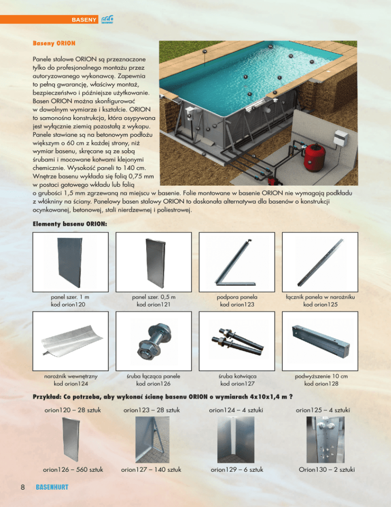 BASENY Baseny ORION Panele stalowe ORION są przeznaczone tylko do profesjonalnego montażu przez autoryzowanego wykonawcę. Zapewnia to pełną gwarancję, właściwy montaż, bezpieczeństwo i późniejsze użytkowanie. Basen ORION można skonfigurować w dowolnym wymiarze i kształcie. ORION to samonośna konstrukcja, która osypywana jest wyłącznie ziemią pozostałą z wykopu. Panele stawiane są na betonowym podłożu większym o 60 cm z każdej strony, niż wymiar basenu, skręcane są ze sobą śrubami i mocowane kotwami klejonymi chemicznie. Wysokość paneli to 140 cm. Wnętrze basenu wykłada się folią 0,75 mm w postaci gotowego wkładu lub folią o grubości 1,5 mm zgrzewaną na miejscu w basenie. Folie montowane w basenie ORION nie wymagają podkładu z włókniny na ściany. Panelowy basen stalowy ORION to doskonała alternatywa dla basenów o konstrukcji ocynkowanej, betonowej, stali nierdzewnej i poliestrowej. Elementy basenu ORION: panel szer. 1 m kod orion120 panel szer. 0,5 m kod orion121 podpora panela kod orion123 łącznik panela w narożniku kod orion125 narożnik wewnętrzny kod orion124 śruba łącząca panele kod orion126 śruba kotwiąca kod orion127 podwyższenie 10 cm kod orion128 Przykład: Co potrzeba, aby wykonać ścianę basenu ORION o wymiarach 4x10x1,4 m ? 8 orion120 – 28 sztuk orion123 – 28 sztuk orion124 – 4 sztuki orion126 – 560 sztuk orion127 – 140 sztuk orion129 – 6 sztuk orion125 – 4 sztuki Orion130 – 2 sztuki