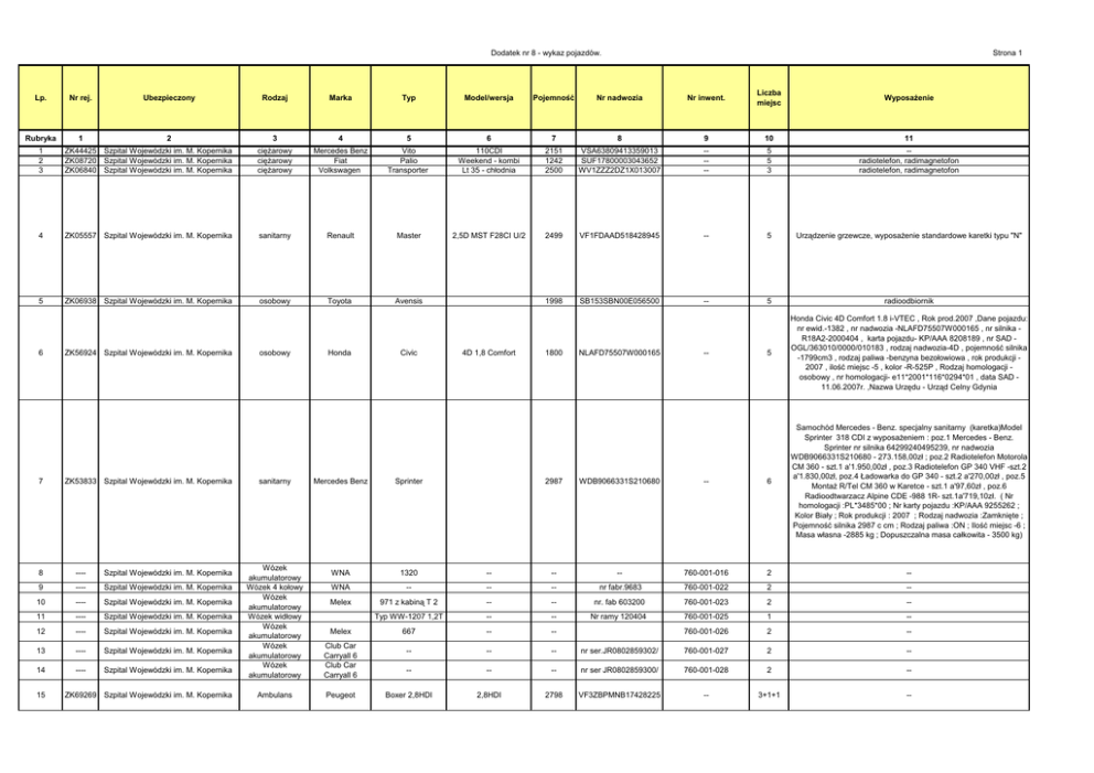 Dodatek nr 8 - wykaz pojazdów. Lp. Rubryka Nr rej. Ubezpieczony 1 2 Rodzaj Marka Typ Model/wersja Pojemność Strona 1 Nr nadwozia Nr inwent. Liczba miejsc Wyposażenie 3 4 5 6 7 8 9 10 11 1 2 3 ZK44425 Szpital Wojewódzki im. M. Kopernika ZK08720 Szpital Wojewódzki im. M. Kopernika ZK06840 Szpital Wojewódzki im. M. Kopernika ciężarowy ciężarowy ciężarowy Mercedes Benz Fiat Volkswagen Vito Palio Transporter 110CDI Weekend - kombi Lt 35 - chłodnia 2151 1242 2500 VSA63809413359013 SUF17800003043652 WV1ZZZ2DZ1X013007 ---- 5 5 3 -radiotelefon, radimagnetofon radiotelefon, radimagnetofon 4 ZK05557 Szpital Wojewódzki im. M. Kopernika sanitarny Renault Master 2,5D MST F28CI U/2 2499 VF1FDAAD518428945 -- 5 Urządzenie grzewcze, wyposażenie standardowe karetki typu "N" 5 ZK06938 Szpital Wojewódzki im. M. Kopernika osobowy Toyota Avensis 1998 SB153SBN00E056500 -- 5 radioodbiornik 5 Honda Civic 4D Comfort 1.8 i-VTEC , Rok prod.2007 ,Dane pojazdu: nr ewid.-1382 , nr nadwozia -NLAFD75507W000165 , nr silnika R18A2-2000404 , karta pojazdu- KP/AAA 8208189 , nr SAD OGL/363010/0000/010183 , rodzaj nadwozia-4D , pojemność silnika -1799cm3 , rodzaj paliwa -benzyna bezołowiowa , rok produkcji 2007 , ilość miejsc -5 , kolor -R-525P , Rodzaj homologacji osobowy , nr homologacji- e11*2001*116*0294*01 , data SAD 11.06.2007r. ,Nazwa Urzędu - Urząd Celny Gdynia 6 Samochód Mercedes - Benz. specjalny sanitarny (karetka)Model Sprinter 318 CDI z wyposażeniem : poz.1 Mercedes - Benz. Sprinter nr silnika 64299240495239, nr nadwozia WDB9066331S210680 - 273.158,00zł ; poz.2 Radiotelefon Motorola CM 360 - szt.1 a'1.950,00zł , poz.3 Radiotelefon GP 340 VHF -szt.2 a'1.830,00zł, poz.4 Ładowarka do GP 340 - szt.2 a'270,00zł , poz.5 Montaż R/Tel CM 360 w Karetce - szt.1 a'97,60zł , poz.6 Radioodtwarzacz Alpine CDE -988 1R- szt.1a'719,10zł. ( Nr homologacji :PL*3485*00 ; Nr karty pojazdu :KP/AAA 9255262 ; Kolor Biały ; Rok produkcji : 2007 ; Rodzaj nadwozia :Zamknięte ; Pojemność silnika 2987 c cm ; Rodzaj paliwa :ON ; Ilość miejsc -6 ; Masa własna -2885 kg ; Dopuszczalna masa całkowita - 3500 kg) 6 7 ZK56924 Szpital Wojewódzki im. M. Kopernika ZK53833 Szpital Wojewódzki im. M. Kopernika 8 ---- Szpital Wojewódzki im. M. Kopernika 9 ---- Szpital Wojewódzki im. M. Kopernika 10 ---- Szpital Wojewódzki im. M. Kopernika 11 ---- Szpital Wojewódzki im. M. Kopernika 12 ---- Szpital Wojewódzki im. M. Kopernika 13 ---- Szpital Wojewódzki im. M. Kopernika 14 ---- Szpital Wojewódzki im. M. Kopernika 15 ZK69269 Szpital Wojewódzki im. M. Kopernika osobowy sanitarny Honda Civic Mercedes Benz Sprinter Wózek akumulatorowy Wózek 4 kołowy Wózek akumulatorowy Wózek widłowy Wózek akumulatorowy Wózek akumulatorowy Wózek akumulatorowy Club Car Carryall 6 Club Car Carryall 6 Ambulans Peugeot 4D 1,8 Comfort 1800 2987 NLAFD75507W000165 WDB9066331S210680 -- -- WNA 1320 -- -- -- 760-001-016 2 -- WNA -- -- -- nr fabr.9683 760-001-022 2 -- Melex 971 z kabiną T 2 -- -- nr. fab 603200 760-001-023 2 -- Typ WW-1207 1,2T -- -- Nr ramy 120404 760-001-025 1 -- 667 -- -- 760-001-026 2 -- -- -- -- nr ser.JR0802859302/ 760-001-027 2 -- -- -- -- nr ser JR0802859300/ 760-001-028 2 -- Boxer 2,8HDI 2,8HDI 2798 VF3ZBPMNB17428225 -- 3+1+1 -- Melex Dodatek nr 8 - wykaz pojazdów. Pozostałe wyposażenie Zabezpieczenia Rok prod. Ładowność Data I rejestracji Suma Ostateczna suma Suma ubezpieczenia ubezpieczenia ubezpieczenia Autocasco z VAT z Autocasco z VAT z NNW rubryką nr 11 i bez rubryką nr 11 i 12 rubryki 12 Aktualny przebieg OC p.p.m. Autocasco (AC+KR) Od do Od 21 22 23 Do Od Do 25 26 12 13 14 15 16 17 18 19 20 ---- immobiliser alarm immobiliser 2001 1999 2000 995 580 1940 08.03.2001 29.04.1999 23.10.2000 10 000,00 10 000,00 10 000,00 22 000,00 zł 5 100,00 zł 27 000,00 zł 22 000,00 zł 5 100,00 zł 27 000,00 zł 176 765 182 920 250 650 12.05.2010 11.05.2011 01.01.2010 01.01.2010 31.12.2010 01.01.2010 01.01.2010 31.12.2010 01.01.2010 -- immobiliser 1998 -- 26.06.1998 10 000,00 -- -- 354 716 01.01.2010 31.12.2010 -- immobiliser 2000 -- 23.11.2000 10 000,00 15 500,00 zł 15 500,00 zł 281 250 01.01.2010 31.12.2010 01.01.2010 31.12.2010 01.01.2010 31.12.2010 -- immobiliser 2007 -- 31.01.2008 10 000,00 46 300,00 zł 46 300,00 zł 44 750,00 31.01.2010 30.01.2011 31.01.2010 30.01.2011 31.01.2010 30.01.2011 immobiliser 2007 -- 31.08.2007 10 000,00 184 000,00 zł 285 986,34 zł 55 550 01.01.2010 31.12.2010 01.01.2010 31.12.2010 01.01.2010 31.12.2010 01.01.2010 31.12.2010 Ssak OB. wartośc 4194,40 zł Nosze EFX-MAX wartość 23.018,64 zł. DODATKOWO: 1. Inkubator Transportowy typ TI - 500Trotter z respiratorem i ssakiem, 2. Poompa infuzyjna Glaseby 3. Pulsoksymetr Wartość łączna pozycji 1-3: 80.033,43 zł Kardiomonitor o wartości 19.952,91 zł Pozostałe wyposażenie: 2000,00 zł -- 24 Strona 2 NNW 31.12.2010 31.12.2010 31.12.2010 -- 01.01.2010 31.12.2010 01.01.2010 31.12.2010 01.01.2010 31.12.2010 -- -- -- -- 1986 2,5 tony -- 10 000,00 ------ ------ -- 01.01.2010 31.12.2010 -- -- -- -- 1991 2,5 tony -- 10 000,00 ------ ------ -- 01.01.2010 31.12.2010 -- -- 01.01.2010 31.12.2010 -- -- 2009 1 tona -- 10 000,00 ------ ------ -- 01.01.2010 31.12.2010 -- -- 01.01.2010 31.12.2010 -- -- -- -- 10 000,00 ------ ------ -- 01.01.2010 31.12.2010 -- -- 01.01.2010 31.12.2010 -- -- 2003 -- -- 10 000,00 ------ ------ -- 01.01.2010 31.12.2010 -- -- 01.01.2010 31.12.2010 -- -- 2007 -- -- 10 000,00 ------ ------ -- 01.01.2010 31.12.2010 -- -- 01.01.2010 31.12.2010 -- -- 2007 -- -- 10 000,00 ------ ------ -- 01.01.2010 31.12.2010 -- -- 01.01.2010 31.12.2010 Laryngoskopy, aparat AMBU 2.000,00 zł immobiliser 2004 -- 05.09.2009 w kraju 10 000,00 29.09.2011 30.09.2010 29.09.2011 64 750,00 zł RAZEM 64 750,00 zł 466 636,34 zł 163 250 30.09.2010 29.09.2011 30.09.2010