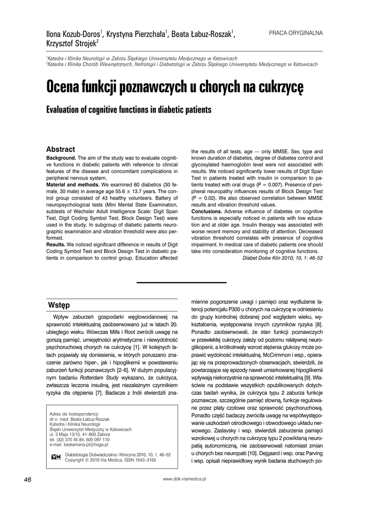 Ilona Kozub-Doros1, Krystyna Pierzchała1, Beata Łabuz-Roszak1, Krzysztof Strojek2 1 2 PRACA ORYGINALNA Katedra i Klinika Neurologii w Zabrzu Śląskiego Uniwersytetu Medycznego w Katowicach Katedra i Klinika Chorób Wewnętrznych, Nefrologii i Diabetologii w Zabrzu Śląskiego Uniwersytetu Medycznego w Katowicach Ocena funkcji poznawczych u chorych na cukrzycę Evaluation of cognitive functions in diabetic patients Abstract Background. The aim of the study was to evaluate cognitive functions in diabetic patients with reference to clinical features of the disease and concomitant complications in peripheral nervous system. Material and methods. We examined 60 diabetics (30 female, 30 male) in average age 55.6 ± 13.7 years. The control group consisted of 43 healthy volunteers. Battery of neuropsychological tests (Mini Mental State Examination, subtests of Wechsler Adult Intelligence Scale: Digit Span Test, Digit Coding Symbol Test, Block Design Test) were used in the study. In subgroup of diabetic patients neurographic examination and vibration threshold were also performed. Results. We noticed significant difference in results of Digit Coding Symbol Test and Block Design Test in diabetic patients in comparison to control group. Education affected Wstęp Wpływ zaburzeń gospodarki węglowodanowej na sprawność intelektualną zaobserwowano już w latach 20. ubiegłego wieku. Wówczas Mills i Root zwrócili uwagę na gorszą pamięć, umiejętności arytmetyczne i niewydolność psychoruchową chorych na cukrzycę [1]. W kolejnych latach pojawiały się doniesienia, w których poruszano znaczenie zarówno hiper-, jak i hipoglikemii w powstawaniu zaburzeń funkcji poznawczych [2–6]. W dużym populacyjnym badaniu Rotterdam Study wykazano, że cukrzyca, zwłaszcza leczona insuliną, jest niezależnym czynnikiem ryzyka dla otępienia [7]. Badacze z Indii stwierdzili zna- Adres do korespondencji: dr n. med. Beata Łabuz-Roszak Katedra i Klinika Neurologii Śląski Uniwersytet Medyczny w Katowicach ul. 3 Maja 13/15, 41–800 Zabrze tel. (32) 370 45 84, 605 097 110 e-mail: [email protected] Diabetologia Doświadczalna i Kliniczna 2010, 10, 1, 46–52 Copyright © 2010 Via Medica, ISSN 1643–3165 46 the results of all tests, age — only MMSE. Sex, type and known duration of diabetes, degree of diabetes control and glycosylated haemoglobin level were not associated with results. We noticed significantly lower results of Digit Span Test in patients treated with insulin in comparison to patients treated with oral drugs (P = 0.007). Presence of peripheral neuropathy influences results of Block Design Test (P = 0.02). We also observed correlation between MMSE results and vibration threshold values. Conclusions. Adverse influence of diabetes on cognitive functions is especially noticed in patients with low education and at older age. Insulin therapy was associated with worse recent memory and stability of attention. Decreased vibration threshold correlates with presence of cognitive impairment. In medical care of diabetic patients one should take into consideration monitoring of cognitive functions. Diabet Dośw Klin 2010; 10, 1: 46–52 mienne pogorszenie uwagi i pamięci oraz wydłużenie latencji potencjału P300 u chorych na cukrzycę w odniesieniu do grupy kontrolnej dobranej pod względem wieku, wykształcenia, występowania innych czynników ryzyka [8]. Ponadto zaobserwowali, że stan funkcji poznawczych w przewlekłej cukrzycy zależy od poziomu relatywnej neuroglikopenii, a krótkotrwały wzrost stężenia glukozy może poprawić wydolność intelektualną. McCrimmon i wsp., opierając się na przeprowadzonych obserwacjach, stwierdzili, że powtarzające się epizody nawet umiarkowanej hipoglikemii wpływają niekorzystnie na sprawność intelektualną [9]. Właściwie na podstawie wszystkich opublikowanych dotychczas badań wynika, że cukrzyca typu 2 zaburza funkcje poznawcze, szczególnie pamięć słowną, funkcje regulowane przez płaty czołowe oraz sprawność psychoruchową. Ponadto część badaczy zwróciła uwagę na współwystępowanie uszkodzeń ośrodkowego i obwodowego układu nerwowego. Zaslavsky i wsp. stwierdzili zaburzenia pamięci wzrokowej u chorych na cukrzycę typu 2 powikłaną neuropatią autonomiczną, nie zaobserwowali natomiast zmian u chorych bez neuropatii [10]. Dejgaard i wsp. oraz Parving i wsp. opisali nieprawidłowy wynik badania słuchowych po- www.ddk.viamedica.pl Ilona Kozub-Doros i wsp., Funkcje poznawcze w cukrzycy tencjałów wywołanych (SPW) u prawie połowy chorych na cukrzycę typu 1 powikłaną neuropatią obwodową [11, 12]. Ryan i wsp. wykazali, że biomedycznym wskaźnikiem oceny funkcji poznawczych jest polineuropatia lub polineuropatia ze współistniejącą nawracającą hipoglikemią, natomiast sama hipoglikemia nie jest takim wskaźnikiem [13]. Natomiast Ziegler i wsp. nie wykazali różnicy dotyczącej wyników analizy wykonanych potencjałów wywołanych (SPW, WPW, P300) w badanych grupach chorych (u osób ze współistniejącą obwodową neuropatią oraz bez neuropatii) [14]. Wobec braku jednoznacznych danych dotyczących współwystępowania i stopnia nasilenia zmian w obwodowym i ośrodkowym układzie nerwowym, które mogą wpływać na funkcje poznawcze, podjęto próbę ich oceny w nieselekcjonowanej grupie chorych na cukrzycę. Celem pracy była ocena funkcji poznawczych u chorych na cukrzycę w odniesieniu do klinicznych cech choroby oraz współistnienia neuropatii cukrzycowej. Materiał i metody Badaniami objęto 60 chorych na cukrzycę (30 kobiet i 30 mężczyzn) w wieku 22–79 lat (średni wiek 55,6 ± 13,7 roku), których leczono w Wojewódzkiej Poradni dla Chorych na Cukrzycę w Zabrzu. Jako kryteria włączenia do badania przyjęto: rozpoznana i leczona co najmniej od roku cukrzyca, słuch umożliwiający porozumienie z badanym, wzrok umożliwiający wykonanie testów neuropsychologicznych, pisemną zgodę badanego. Kr
