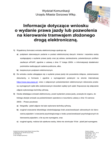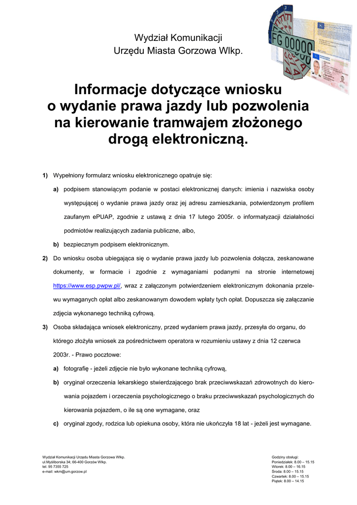 Wydział Komunikacji Urzędu Miasta Gorzowa Wlkp. Informacje dotyczące wniosku o wydanie prawa jazdy lub pozwolenia na kierowanie tramwajem złożonego drogą elektroniczną. 1) Wypełniony formularz wniosku elektronicznego opatruje się: a) podpisem stanowiącym podanie w postaci elektronicznej danych: imienia i nazwiska osoby występującej o wydanie prawa jazdy oraz jej adresu zamieszkania, potwierdzonym profilem zaufanym ePUAP, zgodnie z ustawą z dnia 17 lutego 2005r. o informatyzacji działalności podmiotów realizujących zadania publiczne, albo, b) bezpiecznym podpisem elektronicznym. 2) Do wniosku osoba ubiegająca się o wydanie prawa jazdy lub pozwolenia dołącza, zeskanowane dokumenty, w formacie i zgodnie z wymaganiami podanymi na stronie internetowej https://www.esp.pwpw.pl/, wraz z załączonym potwierdzeniem elektronicznym dokonania przelewu wymaganych opłat albo zeskanowanym dowodem wpłaty tych opłat. Dopuszcza się załączanie zdjęcia wykonanego techniką cyfrową. 3) Osoba składająca wniosek elektroniczny, przed wydaniem prawa jazdy, przesyła do organu, do którego złożyła wniosek za pośrednictwem operatora w rozumieniu ustawy z dnia 12 czerwca 2003r. - Prawo pocztowe: a) fotografię - jeżeli zdjęcie nie było wykonane techniką cyfrową, b) oryginał orzeczenia lekarskiego stwierdzającego brak przeciwwskazań zdrowotnych do kierowania pojazdem i orzeczenia psychologicznego o braku przeciwwskazań psychologicznych do kierowania pojazdem, o ile są one wymagane, oraz c) oryginał zgody, rodzica lub opiekuna osoby, która nie ukończyła 18 lat - jeżeli jest wymagane. Wydział Komunikacji Urzędu Miasta Gorzowa Wlkp. ul.Myśliborska 34; 66-400 Gorzów Wlkp. tel. 95 7355 725 e-mail: [email protected] Godziny obsługi: Poniedziałek: 8.00 – 15.15 Wtorek: 8.00 – 16.15 Środa: 8.00 – 15.15 Czwartek: 8.00 – 15.15 Piątek: 8.00 – 14.15 4) Na podstawie dokumentów, o których mowa w pkt 3 litera a i b, właściwy organ wydający prawo jazdy lub pozwolenie potwierdza przesłane kopie za zgodność z oryginałem, a następnie odsyła oryginały osobie wnioskującej. 5) W przypadku złożenia wniosku elektronicznego zawierającego braki formalnoprawne lub nieodpowiadającego wymaganiom zamieszczonym w Biuletynie Informacji Publicznej właściwy organ, w zależności od ich rodzaju, wzywa do ich uzupełnienia w trybie art.64 §2 ustawy z dnia 14 czerwca 1960r. - Kodeks postępowania administracyjnego. Dodatkowe informacje dotyczące wymaganych dokumentów można uzyskać na stronie internetowej http://www.eurzad.gorzow.pl/ w zakładce Jak Załatwić Sprawę. Wydział Komunikacji Urzędu Miasta Gorzowa Wlkp. ul.Myśliborska 34; 66-400 Gorzów Wlkp. tel. 95 7355 725 e-mail: [email protected] Godziny obsługi: Poniedziałek: 8.00 – 15.15 Wtorek: 8.00 – 16.15 Środa: 8.00 – 15.15 Czwartek: 8.00 – 15.15 Piątek: 8.00 – 14.15