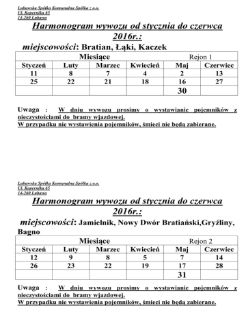 Lubawska Spółka Komunalna Spółka z o.o. Ul. Kopernika 65 14-260 Lubawa Harmonogram wywozu od stycznia do czerwca 2016r.: miejscowości: Bratian, Łąki, Kaczek Miesiące Styczeń 11 25 Luty 8 22 Marzec 7 21 Kwiecień 4 18 Rejon 1 Maj Czerwiec 2 13 16 27 30 W dniu wywozu prosimy o wystawianie pojemników z nieczystościami do bramy wjazdowej. W przypadku nie wystawienia pojemników, śmieci nie będą zabierane. Uwaga : Lubawska Spółka Komunalna Spółka z o.o. Ul. Kopernika 65 14-260 Lubawa Harmonogram wywozu od stycznia do czerwca 2016r.: miejscowości: Jamielnik, Nowy Dwór Bratiański,Gryźliny, Bagno Miesiące Styczeń 12 26 Luty 9 23 Marzec 8 22 Kwiecień 5 19 Rejon 2 Maj Czerwiec 7 14 17 28 31 W dniu wywozu prosimy o wystawianie pojemników z nieczystościami do bramy wjazdowej. W przypadku nie wystawienia pojemników, śmieci nie będą zabierane. Uwaga : Lubawska Spółka Komunalna Spółka z o.o. Ul. Kopernika 65 14-260 Lubawa Harmonogram wywozuod stycznia do czerwca 2016r.: miejscowości: Chrośle, Lekarty, Skarlin, Radomno , Pustki Miesiące Styczeń 13 27 Luty 10 24 Marzec 9 23 Kwiecień 6 20 Rejon 3 Maj Czerwiec 4 1 18 15 29 W dniu wywozu prosimy o wystawianie pojemników z nieczystościami do bramy wjazdowej. W przypadku nie wystawienia pojemników, śmieci nie będą zabierane. Uwaga : Lubawska Spółka Komunalna Spółka z o.o. Ul. Kopernika 65 14-260 Lubawa Harmonogram wywozuod stycznia do czerwca 2016r.: miejscowości: Pacółtowo, Nawra, Mszanowo Miesiące Styczeń 14 28 Luty 11 25 Marzec 10 24 Kwiecień 7 21 Rejon 4 Maj Czerwiec 5 2 19 16 30 W dniu wywozu prosimy o wystawianie pojemników z nieczystościami do bramy wjazdowej. W przypadku nie wystawienia pojemników, śmieci nie będą zabierane. Uwaga : Lubawska Spółka Komunalna Spółka z o.o. Ul. Kopernika 65 14-260 Lubawa Harmonogram wywozuod stycznia do czerwca 2016r.: miejscowości: Tylice, Gwiździny Miesiące Styczeń 2 15 29 Luty 12 26 Marzec 11 25 Kwiecień 8 22 Rejon 5 Maj Czerwiec 6 3 20 17 W dniu wywozu prosimy o wystawianie pojemników z nieczystościami do bramy wjazdowej. W przypadku nie wystawienia pojemników, śmieci nie będą zabierane. Uwaga : Lubawska Spółka Komunalna Spółka z o.o. Ul. Kopernika 65 14-260 Lubawa 4.01 1.02 14.03 11.04 9.05 6.06 18.01 15.02 29.03 25.04 23.05 20.06 Szkło Pustki Radomno Bagno Jamielnik Gryźliny Lekarty Skarlin Nowy Dwór Chrośle Nawra Nawra Ust. Plastik/Papier Harmonogram odbioru posegregowanych odpadów z terenu gminy Nowe Miasto Lubawskie od stycznia do czerwca 2016r. Prosimy odpady wystawiać do drogi głównej Lubawska Spółka Komunalna Spółka z o.o. Ul. Kopernika 65 14-260 Lubawa Harmonogram odbioru posegregowanych odpadów z terenu gminy Nowe Miasto Lubawskieod stycznia do czerwca 2016r. Papier/Plastik Szkło Gwiździny Pacółtowo Tylice Mszanowo Łąki Brat. Bratian Kaczek 5.01 2.02 15.03 12.04 10.05 19.01 16.02 30.03 26.04 24.05 Prosimy odpady wystawiać do drogi głównej 7.06 21.06