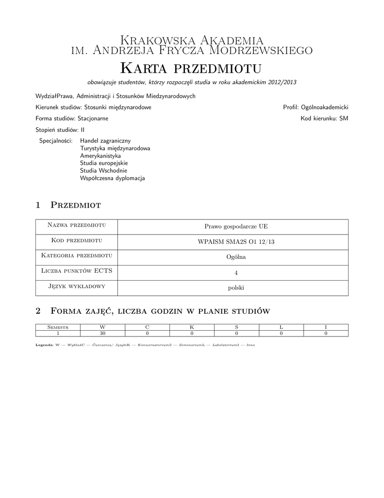 Krakowska Akademia im. Andrzeja Frycza Modrzewskiego Karta przedmiotu obowiązuje studentów, którzy rozpoczęli studia w roku akademickim 2012/2013 WydziałPrawa, Administracji i Stosunków Miedzynarodowych Kierunek studiów: Stosunki międzynarodowe Profil: Ogólnoakademicki Forma studiów: Stacjonarne Kod kierunku: SM Stopień studiów: II Specjalności: 1 2 Handel zagraniczny Turystyka międzynarodowa Amerykanistyka Studia europejskie Studia Wschodnie Współczesna dyplomacja Przedmiot Nazwa przedmiotu Prawo gospodarcze UE Kod przedmiotu WPAISM SMA2S O1 12/13 Kategoria przedmiotu Ogólna Liczba punktów ECTS 4 Język wykładowy polski Forma zajęć, liczba godzin w planie studiów Semestr 1 W 30 C 0 K 0 S 0 Legenda: W — WykładC — Ćwiczenia/ JęzykiK — KonwersatoriumS — SeminariumL — LabolatoriumI — Inne L 0 I 0 Krakowska Akademia im. Andrzeja Frycza Modrzewskiego 3 Cele przedmiotu Cel 1 Nabycie przez studenta podstawowych wiadomości dotyczących funkcjonowania rynku wewnętrznego oraz umiejętności ich praktycznego wykorzystania. 4 Wymagania wstępne 1 posiada podstawowe wiadomości o Unii Europejskiej i jej systemie prawa 5 Modułowe efekty kształcenia MW1 Zna zasady tworzenia i rozwoju form indywidualnej przedsiębiorczości na rynku wewnętrznym UE oraz zasady współpracy handlowej z państwami trzecimi MW2 Posiada wiedzę o podstawach prawnych działania rynku wewnętrznego, potrafi je wykorzystać i zastosować w praktyce. MU3 Posiada umiejętność samodzielnego rozwiązywania podstawowych problemów z zakresu prawa gospodarczego UE i potrafi wykorzystać zdobytą wiedzę w pracy zawodowej. MK4 Rozumie potrzebę zdobywania i aktualizacji wiedzy o podstawach prawnych rynku wewnętrznego oraz jest w stanie samodzielnie ją rozszerzać 6 Treści programowe Strona 2/5 Krakowska Akademia im. Andrzeja Frycza Modrzewskiego Lp W1 7 Wykład Tematyka zajęć Opis szczegółowy bloków tematycznych I. Zasady ogólne funkcjonowania rynku wewnętrznego 1. Etapy realizacji integracji gospodarczej 2. Zasady ogólne unijnego prawa gospodarczego 3. Prawne instrument integracji gospodarczej II. Swoboda przepływu towarów 1. Zakres stosowania przepisów TFUE 1.1.Pojęcie towaru 1.2. Pojęcie towaru unijnego 2. Zakaz ceł i opłat o skutku równoważnym 2.1. Unia celna 2.2. Cła 2.3. Opłaty o skutku równoważnym 3. Zakaz opodatkowania dyskryminacyjnego 3.1. Zakaz opodatkowania towarów podobnych 3.2. Zakaz opodatkowania protekcjonistycznego 4. Zakaz ograniczeń ilościowych i środków o skutku podobnym 4.1. Formuła Dassonville 4.2. Orzeczenie w sprawie Keck rozróżnienie regulacji dotyczących produktów i regulacji dotyczących sprzedaży 4.3. Wymogi imperatywne - orzeczenie Cassis de Dijon 4.4. Dopuszczalne ograniczenie swobody przepływu towaru 4.5. Harmonizacja prawa krajowego na podstawie art. 114 TFUE III. Swoboda przepływu pracowników 1. Zakres podmiotowy przepisów unijnych 1.1. Unijne pojęcie pracownika 2. Zakres przedmiotowy swobody 2.1. Prawo do wjazdu, poruszania się i pobytu w innym państwie członkowskim dyr. 2004/38/WE 2.2. Zakaz dyskryminacji ze względu na przynależność państwową i nakaz traktowania krajowego w zakresie zatrudnienia 2.3. Dopuszczalne wyjątki od stosowania swobody przepływu pracowników 2.4. Bezpośrednia skuteczność przepisów prawa unijnego w zakresie swobodnego przepływu pracowników IV. Swoboda przepływu przedsiębiorczości 1. Zakres podmiotowy swobody osoby fizyczne oraz spółki w rozumieniu art. 54 TFUE 2. Unijne pojęcie przedsiębiorczości 3. Zakres przedmiotowy swobody 3.1. Prawo wjazdu i pobytu w innym państwie członkowskim 3.2. Zakaz dyskryminacji i nakaz traktowania narodowego 3.3. Ogólny zakaz stosowania przepisów i praktyk utrudniających zakładanie przedsiębiorstw 3.4. Uznawanie dyplomów, kwalifikacji i świadectw 4. Dozwolone ograniczenia swobody V. Swoboda świadczenia usług 1. Zakres podmiotowy swobody 2. Unijne pojęcie usługi 3. Rozgraniczenie pomiędzy swobodą świadczenia usług a innymi swobodami rynku wewnętrznego 4. Zakres przedmiotowy swobody 4.1. Zasada traktowania narodowego 4.2. Ogólny zakaz ograniczeń i utrudnień w transgranicznym świadczeniu usług 5. Dozwolone ograniczenia swobody VI. Podstawy unijnego prawa konkurencji VII. Podstawowe zagadnienia wspólnej polityki handlowej Razem Metody dydaktyczne M16. Wykłady M13. Studium przypadku M10. Prezentacje multimedialne Strona 3/5 Liczba godzin 30 30 Krakowska Akademia im. Andrzeja Frycza Modrzewskiego 8 Obciążenie pracą studenta Średnia liczba godzin na zrealizowanie aktywności Forma aktywności Godziny kontaktowe z nauczycielem akademickim, w tym: Godziny wynikające z planu studiów 30 Konsultacje przedmiotowe 0 Egzaminy i zaliczenia w sesji 0 Godziny bez udziału nauczyciela akademickiego wynikające z nakładu pracy studenta, w tym: Przygotowanie się do zajęć, w tym studiowanie zalecanej literatury 25 Opracowanie wyników 0 Przygotowanie raportu, projektu, prezentacji, dyskusji 15 Przygotowanie do egzaminu 30 Sumaryczna liczba godzin dla przedmiotu wynikająca z 100 całego nakładu pracy studenta 4 Sumaryczna liczba punktów ECTS dla przedmiotu 9 Metody oceny Ocena podsumowująca P1. Egzamin pisemny P11. Aktywność na zajęciach Warunki zaliczenia przedmiotu 1 zaliczenie egzaminu na 51% lub pozytywna ocena aktywności na zajęcia, która wykaże znajomość materiału objętego wykładem Kryteria oceny Na ocenę 3 Na ocenę 3.5 Na ocenę 4 Na ocenę 4.5 Na ocenę 5 10 Zna podstawowe zasady funkcjonowania rynku wewnętrzengo oraz wymiany handlowej z państwami trzecimi. Zna podstawowe zasady funkcjonowania rynku wewnętrzengo, ze szczególnym uwzględnieniem swobody przepływu towarów oraz osób, a także zasady wymiany handlowej z państwami trzecimi, Zna podstawowe zasady funkcjonowania rynku wewnętrzengo oraz wymiany handlowej z państwami trzecicmi, zna i rozumie regulacje prawa UE. Zna podstawowe zasady funk