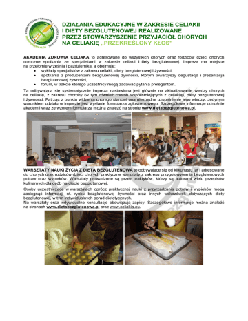 DZIAŁANIA EDUKACYJNE W ZAKRESIE CELIAKII I DIETY BEZGLUTENOWEJ REALIZOWANE PRZEZ STOWARZYSZENIE PRZYJACIÓŁ CHORYCH NA CELIAKIĘ „PRZEKREŚLONY KŁOS" AKADEMIA ZDROWIA CELIAKA to adresowane do wszystkich chorych oraz rodziców dzieci chorych coroczne spotkania ze specjalistami w zakresie celiakii i diety bezglutenowej. Impreza ma miejsce na przełomie września i października, a obejmuje: wykłady specjalistów z zakresu celiakii, diety bezglutenowej i żywności, spotkania z producentami bezglutenowej żywności, którym towarzyszy degustacja i prezentacja bezglutenowej żywności, forum, w trakcie którego uczestnicy mogą zadawać pytania prelegentom. Ta odbywająca się systematycznie impreza nastawiona jest głównie na aktualizowanie wiedzy chorych na celiakię, z zakresu choroby (w tym również chorób współistniejących z celiakią), diety bezglutenowej i żywności. Patrząc z punktu widzenia chorego stanowi ona niezbędne uzupełnienie jego wiedzy. Jedynym warunkiem udziału w imprezie jest wysłanie formularza zgłoszeniowego. Szczegółowe informacje odnośnie akademii wraz ze wzorem formularza można znaleźć na stronie www.dietabezglutenowa.pl. WARSZTATY NAUKI ŻYCIA Z DIETĄ BEZGLUTENOWĄ to odbywające się od kilkunastu lat i adresowane do chorych oraz rodziców dzieci chorych praktyczne warsztaty z zakresu przygotowywania bezglutenowych potraw oraz wypieków. Warsztaty prowadzone są przez praktyków, którzy są autorami wielu przepisów kulinarnych dla osób na diecie bezglutenowej. Osoby uczestniczące w warsztatach oprócz praktycznej nauki z przyrządzania potraw i wypieków mogą zasięgnąć informacji nt. rynku bezglutenowej żywności oraz innych wskazówek dotyczących diety bezglutenowej, w tym indywidualnych porad dietetycznych. Na warsztaty oraz indywidualne konsultacje obowiązują zapisy. Szczegółowe informacje można znaleźć na stronach www.dietabezglutenowa.pl oraz www.celiakia.eu. AKADEMIA KULINARNA CELIAKA to odbywające się od kilku lat zaawansowane warsztaty kulinarne, które uczą przygotowywania wyszukanych potraw w bezglutenowej wersji. Warsztaty odbywają się w małych grupach i prowadzone są przez mistrzów kulinarnych - szefów kuchni najlepszych restauracji. W trakcie warsztatów każdy z uczestników samodzielnie (pod okiem mistrza kulinarnego) przygotowuje każdą potrawę od początku do samego końca. Warsztaty otwarte są dla wszystkich osób wymagających stosowania diety bezglutenowej, a w przypadku dzieci i młodzieży - dla ich rodziców i opiekunów. Na zajęcia obowiązują zapisy - szczegółowe informacje można znaleźć na stronach www.dietabezglutenowa.pl oraz www.celiakia.eu. AKADEMIA ZDROWIA MAŁEGO CELIAKA to odbywające się od kilku lat – w okresie wakacji oraz w dni wolne od nauki szkolnej – specjalne zajęcia o tematyce celiakii i diety bezglutenowej adresowane do dzieci i młodzieży. W czasie zajęć, które mają zwykle formę zabawy uczestnicy dowiadują się: co to jest celiakia i jak się ją leczy oraz co się dzieje, gdy nie przestrzegamy diety bezglutenowej, co to jest gluten i dlaczego gluten dodawany jest do produktów spożywczych, jak rozpoznać produkty dozwolone, ryzykowne i zabronione w diecie bezglutenowej. Na zajęcia obowiązują zapisy - szczegółowe www.dietabezglutenowa.pl oraz www.celiakia.eu. informacje można znaleźć na stronach KOLOROWA KUCHNIA BEZGLUTENOWA to odbywające się od kilku lat – w okresie wakacji oraz w dni wolne od nauki szkolnej – warsztaty kulinarne adresowane do dzieci i młodzieży. W ramach warsztatów uczestnicy w formie zabawy uczą się przygotowywania bezglutenowych posiłków. Dzięki warsztatom dzieci i młodzież zdobywają doświadczenie w pracach kuchennych oraz uczą się samodzielnie przygotowywać ulubione potrawy i wypieki, np. pizzę, gofry, ciasta i ciastka. Na zajęcia obowiązują zapisy - szczegółowe www.dietabezglutenowa.pl oraz www.celiakia.eu. informacje można znaleźć na stronach