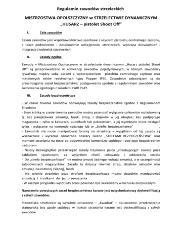 Regulamin zawodów strzeleckich MISTRZOSTWA OPOLSZCZYZNY w STRZELECTWIE DYNAMICZNYM „HUSARZ – pistolet Shoot Off” I. Cele zawodów Celem zawodów jest współzawodnictwo sportowe z użyciem pistoletu centralnego zapłonu, a także podnoszenie i doskonalenie umiejętności strzeleckich, wymiana doświadczeń i integracja środowisk strzeleckich. II. Zasady ogólne Zawody – Mistrzostwa Opolszczyzny w strzelectwie dynamicznym „Husarz pistolet Shoot Off” są przeprowadzane w konwencji zawodów pojedynkowych, w których zawodnicy rywalizują między sobą parami z wykorzystaniem pistoletu centralnego zapłonu oraz metalowych celów reaktywnych typu Popper IPSC. Zawodnicy zobowiązani są do przestrzegania zasad bezpieczeństwa, postępowania zgodnie z regulaminem zawodów oraz zachowania zgodnego z zasadami FAIR PLAY. III. Zasady bezpieczeństwa - W czasie trwania zawodów obowiązują zasady bezpieczeństwa zgodne z Regulaminem Strzelnicy - Broń krótką w czasie trwania zawodów można przenosić wyłącznie całkowicie rozładowaną tj. bez jakiejkolwiek amunicji, łusek, atrap, i zbijaków w jej obrębie; bez podpiętego magazynka – tylko w kaburach, pudełkach lub pokrowcach, a jej wydobycie może nastąpić tylko i wyłącznie na komendę sędziego lub w „Strefie bezpieczeństwa” . - Zawodnik nie może manipulować bronią na strzelnicy – wyjątkiem od tej zasady są wyznaczone i wyraźnie oznaczone obszary zwane „STREFAMI BEZPIECZEŃSTWA” oraz moment strzelania na torze po odpowiedniej komendzie sędziego i pod jego bezpośrednim nadzorem . - Należy bezwzględnie przestrzegać zasady trzymania palca „strzelającego” zawsze poza kabłąkiem spustowym, za wyjątkiem chwili celowania i oddawania strzału - Do „strefy bezpieczeństwa” nie można wnosić żadnego rodzaju amunicji, a w szczególności załadowanych magazynków. Zasada ta dotyczy również atrap, zbijaków nabojów oraz amunicji ćwiczebnej (ślepej), łusek . - Na terenie strzelnicy poza strefami bezpieczeństwa można dowolnie manipulować amunicją i środkami do jej przenoszenia . - W każdym przypadku wylot lufy broni powinien być skierowany w kierunku bezpiecznym. Naruszenie powyższych zasad bezpieczeństwa karane jest natychmiastową dyskwalifikacją z całych zawodów. Stanowiska strzeleckie są wyraźnie oznaczone – „kwadrat” – opuszczenie, przekroczenie stanowiska bez zgody sędziego w trakcie strzelania karane jest dyskwalifikacją z całych zawodów. Wszyscy zawodnicy na torze obowiązkowo używają ochronników słuchu i wzroku. Wszystkie osoby przebywające na strzelnicy są obowiązane nosić okulary ochronne, w pobliżu torów strzeleckich powinny być noszone ochronniki słuchu. Wyłącznie zawodnik ponosi odpowiedzialność cywilną i karną za skutki swoich działań w czasie pobytu na strzelnicy. IV. Zawodnicy a.) Do rywalizacji dopuszczeni są zawodnicy posiadający Licencję Zawodniczą PZSS. b.) Do zawodów dopuszczeni są funkcjonariusze służb mundurowych V. Broń, amunicja i wyposażenie zawodnika Zawodnik i tylko on ponosi całkowitą odpowiedzialność za wyposażenie, broń oraz amunicję używaną przez siebie w trakcie zawodów. Każde wyposażenie i broń używana przez zawodnika w czasie zawodów mają być sprawne i posiadać działające mechanizmy, które pozwolą zawodnikowi każdorazowo sprawować nad nimi pełną kontrolę co stanowi o ich bezpieczeństwie. Muszą spełniać wymogi bezpieczeństwa i regulaminu strzelnicy. Pistolet centralnego zapłonu – broń w postaci pistoletów samopowtarzalnych, bez kolby, przeznaczonych do strzelania nabojami pistoletowymi. Nie przewiduje się podziału na klasy sprzętowe. Broń może być wyposażona wyłącznie w mechaniczne przyrządy celownicze, nie może mieć kompensatorów. Magazynki do broni można ładować maksymalną ilością amunicji przewidzianą przez producenta. Zawodnicy nie mogą używać kabur stwarzających niebezpieczeństwo, a w szczególności podramiennych, typu „cross draw” oraz niezakrywających całego języka spustowego. Zabronione jest używanie „kabur udowych”. Zawodnicy mogą korzystać z wyposażenia dodatkowego takiego jak ładownice do magazynków. Każdorazowo o dopuszczeniu wyposażenia dodatkowego decyduje sędzia. W czasie całych zawodów zawodnik musi korzystać z tej samej broni i wyposażenia – zmiana broni i wyposażenia może nastąpić wyłącznie ze względów bezpieczeństwa za zgodą sędziego głównego. Zabronione jest używanie amunicji zapalającej i innej specjalnego przeznaczenia. VI. Cele Celami są wyłącznie metalowe cele reaktywne typu „popper”. Cele rozstawiane są w odległości około 9-10 m od linii ognia i tworzą dwa symetryczne zestawy po 5 celów. Zestaw składa się z czterech celów początkowych – mini Popper IPSC (w kolorze białym) i jednego celu końcowego – Popper IPSC (w kolorze żółtym). Cele są kalibrowane zgodnie z zasadami IPSC. VII. Przebieg zawodów Zawody składają się z części eliminacyjnej i części pojedynkowej. W części eliminacyjnej zawodnicy strzelają pojedynczo do zestawu 5 (pięciu) popperów. Zawodnik ma prawo do trzech prób. Końcowym wynikiem części eliminacyjnej jest najlepszy czas jednej z prób. Wynikiem każdej próby jest czas oddania ostatniego strzału. Warunkiem zaliczenia próby jest przewrócenie wszystkich pięciu celów (popperów) i wykonanie zmiany magazynka po przewróceniu czterech celów (popperów) początkowych, a przed przewróceniem celu końcowego (poppera końcowego). Jeśli zawodnik nie wypełnił powyższych warunków próba uznawana jest za spaloną. W części pojedynkowej startuje 8 lub 16 zawodników, którzy uzyskali najlepsze wyniki w części eliminacyjnej. Zawodnicy walczą ze sobą parami zgodnie z grafikiem rozgrywek. Zawodnik, który w grafiku jest zapisany w wyższym wierszu rozpoczyna pojedynek na prawym stanowisku, a zawodnik zapisany w wier