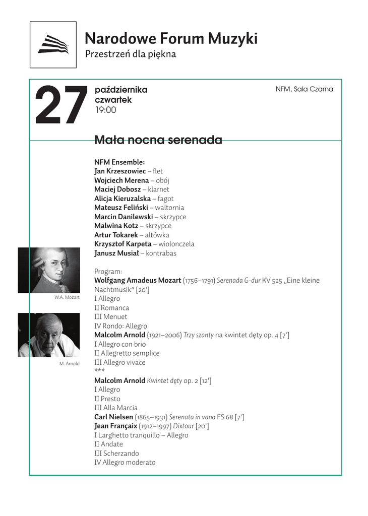 27 października czwartek 19:00 NFM, Sala Czarna Mała nocna serenada NFM Ensemble: Jan Krzeszowiec – flet Wojciech Merena – obój Maciej Dobosz – klarnet Alicja Kieruzalska – fagot Mateusz Feliński – waltornia Marcin Danilewski – skrzypce Malwina Kotz – skrzypce Artur Tokarek – altówka Krzysztof Karpeta – wiolonczela Janusz Musiał – kontrabas W.A. Mozart M. Arnold Program: Wolfgang Amadeus Mozart (1756–1791) Serenada G-dur KV 525 „Eine kleine Nachtmusik” [20'] I Allegro II Romanca III Menuet IV Rondo: Allegro Malcolm Arnold (1921–2006) Trzy szanty na kwintet dęty op. 4 [7'] I Allegro con brio II Allegretto semplice III Allegro vivace *** Malcolm Arnold Kwintet dęty op. 2 [12'] I Allegro II Presto III Alla Marcia Carl Nielsen (1865–1931) Serenata in vano FS 68 [7'] Jean Françaix (1912–1997) Dixtour [20'] I Larghetto tranquillo – Allegro II Andate III Scherzando IV Allegro moderato W kręgu serenady Artur Bielecki Koncert zatytułowany „Mała nocna serenada” z pewnością budzi u słuchacza bardzo przyjemne muzyczne skojarzenia, w dużej mierze związane z arcydziełem „Eine kleine Nachtmusik” Mozarta, jednym z najpopularniejszych utworów mistrza. Czego właściwie powinniśmy oczekiwać po „serenadowym” programie? Termin „serenada” (z łacińskiego słowa „serenus” – pogodny, jasny) oznacza w muzyce przede wszystkim gatunek pochodzący mniej więcej z połowy XVIII w. Pierwotnie znaczył tyle, co muzyczne pozdrowienie, wykonywane zazwyczaj w plenerze, wieczorem, dedykowane ukochanej albo po prostu jakiejś ważnej osobistości. W Niemczech rozumiano ten termin m.in. jako muzykę wieczorną (Abend-Music), prezentowaną publiczności w pogodną, przyjemną noc. Historykom udało się nawet precyzyjnie ustalić zwyczajową porę takiego koncertu serenadowego, była to godzina dziewiąta wieczorem, podczas gdy „notturno” wykonywano później, bo około godziny 23:00. W Italii serenata funkcjonowała już w XVI stuleciu na gruncie muzyki wokalnej, a w XVII w. mogła też wskazywać na utwór wokalno-instrumentalny. Serenata wreszcie stała się gatunkiem czysto instrumentalnym, w okresie klasycyzmu popularnym w takich krajach, jak Austria, Niemcy, Czechy czy wspomniana Italia. Gatunek ten wykształcił nawet własny typ obsady, we wczesnym klasycyzmie zespół obejmował instrumenty dęte, kontrabas i dwie altówki. Późniejsza obsada mogła się ograniczać wyłącznie do smyczków, powstała także serenada orkiestrowa. Miastem, w którym szczególnie chętnie w XVIII stuleciu wykonywano plenerowe serenady czy nokturny, był Wiedeń. Ten rys historyczny pozwala nam uchwycić szerszy kontekst terminu „serenada”, ale oczywiście nie wszystkie prezentowane w dzisiejszym programie utwory należą bezpośrednio do tej tradycji. W tytule koncertu chodzi raczej o typ muzyki pogodnej, przyjemnej w odbiorze, przynoszącej słuchaczowi miłe wytchnienie. Niewątpliwie arcydziełem i owocem takiego nastroju jest Serenada G-dur KV 525 „Eine kleine Nachtmusik” („Mała nocna muzyka”) Wolfganga Amadeusa Mozarta. Któż by nie znał tego utworu i nie reagował uśmiechem na otwierający go radosny, pogodny temat, oparty na trójdźwięku G-dur? Kompozycja, przeznaczona wyłącznie na smyczki, składa się z czterech części i została ukończona 10 sierpnia 1787 r., w okresie pracy nad operą Don Giovanni. Co ciekawe, pierwotnie serenada ta posiadała pięć części, gdyż między pierwszym Allegro a Romancą znajdował się jeszcze Menuet, który w późniejszej praktyce został pominięty. Alfred Einstein tak charakteryzuje to dzieło: „Mozart nie wypowiada tu nic nazbyt osobistego, nawet w Romancy, którą można by określić »Andante innocente« – jedynie w środkowym fragmencie (c-moll) w aurę niewinności wkrada się lekki niepokój. Menuet jest tak zwięzły i regularnie zbudowany, jak tylko możliwe, w głównej partii krzepki, w triu – czuły. Arcymistrzostwo w możliwie najmniejszych ramach”. Serenata in vano Carla Nielsena (1865–1931) przez samego autora nazwana została „małym żartem”. Tytuł można by przetłumaczyć jako „Daremną serenadę”. Znakomity duński kompozytor, autor szeregu dzieł symfonicznych, wyjaśnił w komentarzu, że chodzi tu o następującą muzyczną scenkę: kilku panów rozpoczyna występ, by wywołać na balkon piękną damę, która jednak nie pojawia się i w końcu, po daremnych trudach, muzycy odchodzą, przygrywając sobie marsza, tym razem już wyłącznie dla własnej przyjemności. Utwór jest kwintetem przeznaczonym na klarnet, fagot, róg, wiolonczelę i kontrabas. W programie znajdują się także dwie kompozycje Malcolma Arnolda (1921–2006). Ten angielski twórca był kompozytorem wyjątkowo płodnym i wszechstronnym, autorem m.in. dziewięciu symfonii. Znany jest powszechnie z nagrodzonej Oscarem muzyki do filmu Most na rzece Kwai. Chętnie pisał dla zespołów instrumentów dętych. Niezwykle efektownym i zabawnym dziełem są Trzy szanty na kwintet dęty op. 4, które powstały w roku 1943, są więc młodzieńczą pracą artysty. Każdy z tych błyskotliwych utworów opiera się na autentycznej pieśni żeglarskiej, co z pewnością natychmiast Państwo usłyszą. Przykładowo: część pierwsza nawiązuje do pełnej humoru pieśni What shall we do with the drunken sailor?, podczas gdy druga szanta ma za podstawę Boney was a warrior. Prawykonanie Trzech szant miało miejsce w sierpniu 1943 r. w wojskowym hangarze lotniczym w Bristolu, trwała wszak II wojna światowa i rodacy kompozytora strzegli kraju przed atakami Niemców. Z okresu wojny pochodzi także młodzieńczy Kwintet dęty Arnolda (1942). Kompozycja powstała w Londynie. Części pierwsza i druga są pełne energii, w części pierwszej nie brakuje odniesień do jazzu, część druga to rodzaj scherza. Dopiero trzecie ogniwo, będące marszem, przynosi poważniejsze akcenty. Dixtour J