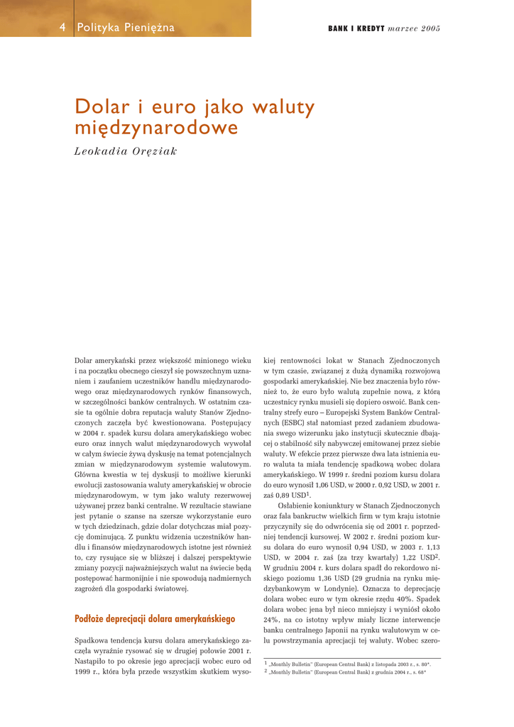 4 Polityka Pieni´˝na BANK I KREDYT m a rz e c 2 0 0 5 Dolar i euro jako waluty mi´dzynarodowe Leokadia Or´ziak Dolar amerykaƒski przez wi´kszoÊç minionego wieku i na poczàtku obecnego cieszy∏ si´ powszechnym uznaniem i zaufaniem uczestników handlu mi´dzynarodowego oraz mi´dzynarodowych rynków finansowych, w szczególnoÊci banków centralnych. W ostatnim czasie ta ogólnie dobra reputacja waluty Stanów Zjednoczonych zacz´∏a byç kwestionowana. Post´pujàcy w 2004 r. spadek kursu dolara amerykaƒskiego wobec euro oraz innych walut mi´dzynarodowych wywo∏a∏ w ca∏ym Êwiecie ˝ywà dyskusj´ na temat potencjalnych zmian w mi´dzynarodowym systemie walutowym. G∏ówna kwestia w tej dyskusji to mo˝liwe kierunki ewolucji zastosowania waluty amerykaƒskiej w obrocie mi´dzynarodowym, w tym jako waluty rezerwowej u˝ywanej przez banki centralne. W rezultacie stawiane jest pytanie o szanse na szersze wykorzystanie euro w tych dziedzinach, gdzie dolar dotychczas mia∏ pozycj´ dominujàcà. Z punktu widzenia uczestników handlu i finansów mi´dzynarodowych istotne jest równie˝ to, czy rysujàce si´ w bli˝szej i dalszej perspektywie zmiany pozycji najwa˝niejszych walut na Êwiecie b´dà post´powaç harmonijnie i nie spowodujà nadmiernych zagro˝eƒ dla gospodarki Êwiatowej. Pod∏o˝e deprecjacji dolara amerykaƒskiego Spadkowa tendencja kursu dolara amerykaƒskiego zacz´∏a wyraênie rysowaç si´ w drugiej po∏owie 2001 r. Nastàpi∏o to po okresie jego aprecjacji wobec euro od 1999 r., która by∏a przede wszystkim skutkiem wyso- kiej rentownoÊci lokat w Stanach Zjednoczonych w tym czasie, zwiàzanej z du˝à dynamikà rozwojowà gospodarki amerykaƒskiej. Nie bez znaczenia by∏o równie˝ to, ˝e euro by∏o walutà zupe∏nie nowà, z którà uczestnicy rynku musieli si´ dopiero oswoiç. Bank centralny strefy euro – Europejski System Banków Centralnych (ESBC) sta∏ natomiast przed zadaniem zbudowania swego wizerunku jako instytucji skutecznie dbajàcej o stabilnoÊç si∏y nabywczej emitowanej przez siebie waluty. W efekcie przez pierwsze dwa lata istnienia euro waluta ta mia∏a tendencj´ spadkowà wobec dolara amerykaƒskiego. W 1999 r. Êredni poziom kursu dolara do euro wynosi∏ 1,06 USD, w 2000 r. 0,92 USD, w 2001 r. zaÊ 0,89 USD1. Os∏abienie koniunktury w Stanach Zjednoczonych oraz fala bankructw wielkich firm w tym kraju istotnie przyczyni∏y si´ do odwrócenia si´ od 2001 r. poprzedniej tendencji kursowej. W 2002 r. Êredni poziom kursu dolara do euro wynosi∏ 0,94 USD, w 2003 r. 1,13 USD, w 2004 r. zaÊ (za trzy kwarta∏y) 1,22 USD2. W grudniu 2004 r. kurs dolara spad∏ do rekordowo niskiego poziomu 1,36 USD (29 grudnia na rynku mi´dzybankowym w Londynie). Oznacza to deprecjacj´ dolara wobec euro w tym okresie rz´du 40%. Spadek dolara wobec jena by∏ nieco mniejszy i wyniós∏ oko∏o 24%, na co istotny wp∏yw mia∏y liczne interwencje banku centralnego Japonii na rynku walutowym w celu powstrzymania aprecjacji tej waluty. Wobec szero1 „Monthly Bulletin” (European Central Bank) z listopada 2003 r., s. 80*. 2 „Monthly Bulletin” (European Central Bank) z grudnia 2004 r., s. 68* Polityka Pieni´˝na 5 BANK I KREDYT m a rz e c 2 0 0 5 kiego koszyka walut, stosowanego przez amerykaƒski System Rezerwy Federalnej, deprecjacja dolara w omawianym okresie by∏a jeszcze mniejsza, gdy˝ wynios∏a 16%. Ten mniejszy spadek dolara by∏ g∏ównie skutkiem faktu, ˝e cz´Êç z walut uj´tych w koszyku by∏a mniej lub bardziej ÊciÊle powiàzana z dolarem poprzez ró˝ne systemy kursowe3. G∏ówne przyczyny os∏abiania si´ dolara od kilku lat majà charakter strukturalny. Wynikajà one z istnienia w Stanach Zjednoczonych tzw. bliêniaczych deficytów (twin deficit), czyli deficytu bilansu obrotów bie˝àcych oraz deficytu bud˝etowego. Deficyt bilansu obrotów bie˝àcych i deficyt bud˝etowy Wyst´pujàcy od d∏u˝szego czasu deficyt w bilansie obrotów bie˝àcych Stanów Zjednoczonych jest rezultatem dzia∏ania wielu czynników. Chodzi w szczególnoÊci o czynniki powodujàce ciàg∏e utrzymywanie si´ nadwy˝ki importu nad eksportem, wskazujàcej na du˝e uzale˝nienie gospodarki amerykaƒskiej od zakupów za granicà. Finansowanie deficytu bilansu obrotów bie˝àcych by∏o dotychczas zapewnione dzi´ki inwestorom mi´dzynarodowym, nabywajàcym ró˝ne aktywa dolarowe, w tym g∏ównie amerykaƒskie papiery skarbowe4. G∏ównymi nabywcami tych ostatnich papierów by∏y do tej pory banki centralne. W ostatnich latach na sytuacj´ w bilansie obrotów bie˝àcych Stanów Zjednoczonych istotny wp∏yw mia∏a stosunkowo luêna polityka pieni´˝na, jak równie˝ bud˝etowa w tym kraju. JeÊli chodzi o polityk´ pieni´˝nà, to zosta∏a ona wyraênie z∏agodzona od 2001 r. Kierujàc si´ obawami przed wystàpieniem deflacji i recesji, amerykaƒski bank centralny, System Rezerwy Federalnej (Fed), rozpoczà∏ od tego roku bardzo aktywny proces obni˝ania stóp procentowych. W efekcie stopy te zosta∏y zredukowane do rekordowo niskiego poziomu w ca∏ym okresie powojennym. Polityk´ taniego i ∏atwo dost´pnego pieniàdza amerykaƒski bank centralny prowadzi∏ przez ponad dwa lata, doprowadzajàc ostatecznie do ujemnych realnych stóp procentowych, co sta∏o si´ istotnym bodêcem do zad∏u˝ania si´ zarówno podmiotów prywatnych, jak i publicznych. W efekcie du˝a masa pieniàdza trafi∏a do gospodarki, na rynek finansowy, przyczyniajàc si´ tak˝e do zdynamizowania popytu na import. Ostatnie lata to tak˝e okres mniej zdyscyplinowanej ni˝ poprzednio polityki bud˝etowej w Stanach Zjednoczonych. Dobra sytuacja w bud˝ecie osiàgni´ta za rzàdów prezydenta Clintona, wyra˝ajàca si´ nad- 3 Further to fall. „The Economist” z 1 stycznia 2005 r. 4 Zob. szerzej: M. Wolf: The world must adjust to the dollar`s inevitable fall. „Financial Times” z 24 listopada 2004 r. wy˝kà rz´du 2% PKB w 