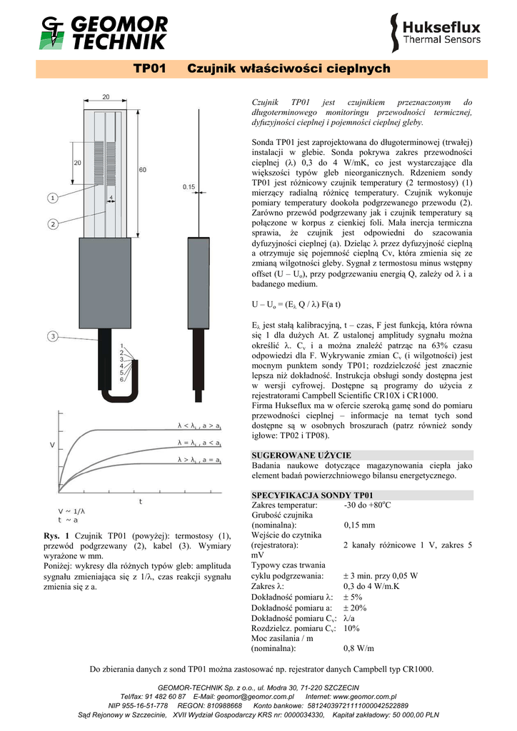 TP01 Czujnik właściwości cieplnych Czujnik TP01 jest czujnikiem przeznaczonym do długoterminowego monitoringu przewodności termicznej, dyfuzyjności cieplnej i pojemności cieplnej gleby. Sonda TP01 jest zaprojektowana do długoterminowej (trwałej) instalacji w glebie. Sonda pokrywa zakres przewodności cieplnej (λ) 0,3 do 4 W/mK, co jest wystarczające dla większości typów gleb nieorganicznych. Rdzeniem sondy TP01 jest róŜnicowy czujnik temperatury (2 termostosy) (1) mierzący radialną róŜnicę temperatury. Czujnik wykonuje pomiary temperatury dookoła podgrzewanego przewodu (2). Zarówno przewód podgrzewany jak i czujnik temperatury są połączone w korpus z cienkiej foli. Mała inercja termiczna sprawia, Ŝe czujnik jest odpowiedni do szacowania dyfuzyjności cieplnej (a). Dzieląc λ przez dyfuzyjność cieplną a otrzymuje się pojemność cieplną Cv, która zmienia się ze zmianą wilgotności gleby. Sygnał z termostosu minus wstępny offset (U – Uo), przy podgrzewaniu energią Q, zaleŜy od λ i a badanego medium. U – Uo = (Eλ Q / λ) F(a t) Eλ jest stałą kalibracyjną, t – czas, F jest funkcją, która równa się 1 dla duŜych At. Z ustalonej amplitudy sygnału moŜna określić λ. Cv i a moŜna znaleźć patrząc na 63% czasu odpowiedzi dla F. Wykrywanie zmian Cv (i wilgotności) jest mocnym punktem sondy TP01; rozdzielczość jest znacznie lepsza niŜ dokładność. Instrukcja obsługi sondy dostępna jest w wersji cyfrowej. Dostępne są programy do uŜycia z rejestratorami Campbell Scientific CR10X i CR1000. Firma Hukseflux ma w ofercie szeroką gamę sond do pomiaru przewodności cieplnej – informacje na temat tych sond dostępne są w osobnych broszurach (patrz równieŜ sondy igłowe: TP02 i TP08). SUGEROWANE UśYCIE Badania naukowe dotyczące magazynowania ciepła jako element badań powierzchniowego bilansu energetycznego. Rys. 1 Czujnik TP01 (powyŜej): termostosy (1), przewód podgrzewany (2), kabel (3). Wymiary wyraŜone w mm. PoniŜej: wykresy dla róŜnych typów gleb: amplituda sygnału zmieniająca się z 1/λ, czas reakcji sygnału zmienia się z a. SPECYFIKACJA SONDY TP01 Zakres temperatur: -30 do +80oC Grubość czujnika (nominalna): 0,15 mm Wejście do czytnika (rejestratora): 2 kanały róŜnicowe 1 V, zakres 5 mV Typowy czas trwania cyklu podgrzewania: ± 3 min. przy 0,05 W Zakres λ: 0,3 do 4 W/m.K Dokładność pomiaru λ: ± 5% Dokładność pomiaru a: ± 20% Dokładność pomiaru Cv: λ/a Rozdzielcz. pomiaru Cv: 10% Moc zasilania / m (nominalna): 0,8 W/m Do zbierania danych z sond TP01 moŜna zastosować np. rejestrator danych Campbell typ CR1000. GEOMOR-TECHNIK Sp. z o.o., ul. Modra 30, 71-220 SZCZECIN Tel/fax: 91 482 60 87 E-Mail: [email protected] Internet: www.geomor.com.pl NIP 955-16-51-778 REGON: 810988668 Konto bankowe: 58124039721111000042522889 Sąd Rejonowy w Szczecinie, XVII Wydział Gospodarczy KRS nr: 0000034330, Kapitał zakładowy: 50 000,00 PLN