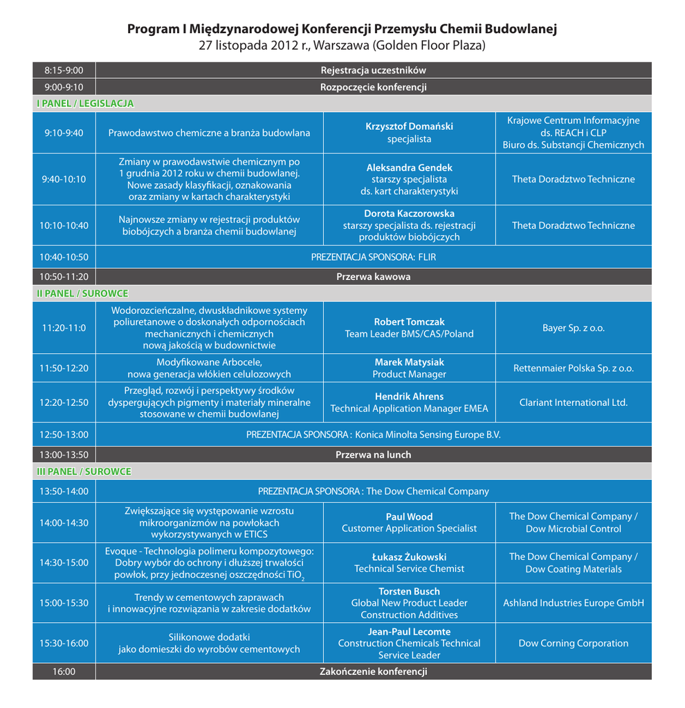 Program I Międzynarodowej Konferencji Przemysłu Chemii Budowlanej 27 listopada 2012 r., Warszawa (Golden Floor Plaza) 8:15-9:00 Rejestracja uczestników 9:00-9:10 Rozpoczęcie konferencji I PANEL / LEGISLACJA 9:10-9:40 Prawodawstwo chemiczne a branża budowlana Krzysztof Domański specjalista Krajowe Centrum Informacyjne ds. REACH i CLP Biuro ds. Substancji Chemicznych 9:40-10:10 Zmiany w prawodawstwie chemicznym po 1 grudnia 2012 roku w chemii budowlanej. Nowe zasady klasyfikacji, oznakowania oraz zmiany w kartach charakterystyki Aleksandra Gendek starszy specjalista ds. kart charakterystyki Theta Doradztwo Techniczne 10:10-10:40 Najnowsze zmiany w rejestracji produktów biobójczych a branża chemii budowlanej Dorota Kaczorowska starszy specjalista ds. rejestracji produktów biobójczych Theta Doradztwo Techniczne 10:40-10:50 PREZENTACJA SPONSORA: FLIR 10:50-11:20 Przerwa kawowa II PANEL / SUROWCE 11:20-11:0 Wodorozcieńczalne, dwuskładnikowe systemy poliuretanowe o doskonałych odpornościach mechanicznych i chemicznych nową jakością w budownictwie Robert Tomczak Team Leader BMS/CAS/Poland Bayer Sp. z o.o. 11:50-12:20 Modyfikowane Arbocele, nowa generacja włókien celulozowych Marek Matysiak Product Manager Rettenmaier Polska Sp. z o.o. 12:20-12:50 Przegląd, rozwój i perspektywy środków dyspergujących pigmenty i materiały mineralne stosowane w chemii budowlanej Hendrik Ahrens Technical Application Manager EMEA Clariant International Ltd. 12:50-13:00 PREZENTACJA SPONSORA : Konica Minolta Sensing Europe B.V. 13:00-13:50 Przerwa na lunch III PANEL / SUROWCE 13:50-14:00 PREZENTACJA SPONSORA : The Dow Chemical Company 14:00-14:30 Zwiększające się występowanie wzrostu mikroorganizmów na powłokach wykorzystywanych w ETICS Paul Wood Customer Application Specialist The Dow Chemical Company / Dow Microbial Control 14:30-15:00 Evoque - Technologia polimeru kompozytowego: Dobry wybór do ochrony i dłuższej trwałości powłok, przy jednoczesnej oszczędności TiO2 Łukasz Żukowski Technical Service Chemist The Dow Chemical Company / Dow Coating Materials 15:00-15:30 Trendy w cementowych zaprawach i innowacyjne rozwiązania w zakresie dodatków Torsten Busch Global New Product Leader Construction Additives Ashland Industries Europe GmbH 15:30-16:00 Silikonowe dodatki jako domieszki do wyrobów cementowych Jean-Paul Lecomte Construction Chemicals Technical Service Leader Dow Corning Corporation 16:00 Zakończenie konferencji