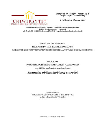 Instytut Filologii Polskiej i Lingwistyki Stosowanej Biblioteka Główna UPH Zakład Polskiej Literatury Dawnej, Tradycji Kulturowej i Edytorstwa Zakład Językoznawstwa i Logopedii ul. Żytnia 38; 08-110 Siedlce; tel. 25 643 18 71; [email protected] PATRONAT HONOROWY PROF. UPH DR HAB. TAMARA ZACHARUK JM REKTOR UNIWERSYTETU PRZYRODNICZO-HUMANISTYCZNEGO W SIEDLCACH PROGRAM IV OGÓLNOPOLSKIEGO SEMINARIUM NAUKOWEGO z serii Różne odsłony kobiecych światów: Rozmaite oblicza kobiecej starości Miejsce obrad: BIBLIOTEKA GŁÓWNA UPH, S. 225, II PIĘTRO ul. Ks. J. Popiełuszki 9, Siedlce Siedlce, 1-2 marca 2016 roku WTOREK 1.03.2016 8.30-9.00 REJESTRACJA UCZESTNIKÓW (BG, II piętro, sala 225) 9.00 – UROCZYSTE OTWARCIE SEMINARIUM DYREKTOR IFPiLS - prof. UPH dr hab. Violetta Machnicka OBRADY PLENARNE PROWADZENIE: prof. UPH. dr hab. Violetta Machnicka 9.15-9.30 prof. AWF dr hab. Ryszard Polak (AWF Biała Podlaska/Warszawa), Pozycja społeczna starych kobiet w różnych kulturach i cywilizacjach. 9.30-9.45 dr Jolanta Dybała (Uniwersytet Jana Kochanowskiego w Kielcach/Filia w Piotrkowie Trybunalskim), Wdowy u Ojców Kapadockich. 9.45-10.00 dr Agnieszka Muszyńska-Andrejczyk (Uniwersytet Muzyczny Fryderyka Chopina w Warszawie), Tragiczne i komiczne oblicze kobiecej starości w operach „Siostra Angelica” („Suor Angelica”) i „Gianni Schicchi” Giacomo Pucciniego. 10.00-10.15 mgr Emilia Juchniewicz (Akademia Pomorska w Słupsku), Od pędzla do pióra. Dennera Hanny Krzemienieckiej obraz starości. 10.15-10.30 Karolina Dymek (Uniwersytet Przyrodniczo-Humanistyczny w Siedlcach), Różne oblicza starości kobiet w baśniach braci Grimm. 10.30-10.45 dr Jarosław Pietrzak (Uniwersytet im. Adama Mickiewicza w Poznaniu), Dom „białych głów szlachcianek w leciech podeszłych”. Przyczynek do historii domu dewotek bialskich w XVIII wieku. 10.45-11.15 DYSKUSJA 11.15-11.45 PRZERWA NA KAWĘ I HERBATĘ PROWADZENIE: prof. AWF dr hab. Ryszard Polak 11.45-12.00 prof. UAM dr hab. Izabela Lis-Wielgosz (Uniwersytet im. Adama Mickiewicza w Poznaniu), Starość kobiety w świetle ról społeczno-kulturowych (przykład z literatury cerkiewnosłowiańskiej). 12.00-12.15 prof. UPH dr hab. Antoni Czyż (Uniwersytet Przyrodniczo-Humanistyczny w Siedlcach), Stara kobieta w „Trenach” Jana Kochanowskiego. 12.15-12.30 mgr Marta Małyska (Uniwersytet Warmińsko-Mazurski w Olsztynie), Wykorzystanie motywu kobiecej starości w staropolskiej poezji politycznej. 12.30-12.45 mgr Sylwia Kawska (Uniwersytet Gdański), Kobieca starość w poezji staropolskiej. 12.45-13.00 mgr Katarzyna Bagrowska (Uniwersytet Opolski), Biblijne staruszki – ich znaczenie w rodzinie i społeczeństwie. 13.00-13.30 DYSKUSJA 13.30-14.15 PRZERWA NA OBIAD PROWADZENIE: prof. UPH dr hab. Antoni Czyż 14.15-14.30 dr Anna Steliga (Uniwersytet Rzeszowski), Ptaki chore na schizofrenię – rola twórczości w życiu dojrzałych kobiet z zaburzeniami psychicznymi. 14.30-14.45 dr Joanna Posłuszna (Uniwersytet Marii Curie Skłodowskiej, Lublin), Droga twórcza i rola muzyki w życiu Alice Herz-Sommer – ocalałej pianistki z Terezina. 14.45-15.00 dr Agnieszka Kowalkiewicz-Kulesza (Uniwersytet Łódzki), Tajemnice wieku podeszłego - niezwykłe relacje babki i wnuczki w powieści Hanny Kowalewskiej „Tego lata w Zawrociu”. 15.00-15.15 mgr Danuta Kalinowska (Uniwersytet Warmińsko-Mazurski w Olsztynie/ Komenda Powiatowej Policji w Garwolinie), Działania profilaktyczne Komendy Powiatowej Policji w Garwolinie adresowane do seniorów. 15.15-15.30 dr Agnieszka Stanecka (Uniwersytet Jana Kochanowskiego w Kielcach/Filia w Piotrkowie Trybunalskim), Konflikt między młodością a dojrzałością w „Arabskiej pieśni” Leilii Aboulelii. 15.30-15.45 dr Julia Legomska (Uniwersytet Śląski, Katowice), Najstarsza matka w Polsce – medialne oblicza późnego macierzyństwa. 15.45-16.15 DYSKUSJA 16.15-16.45 PRZERWA NA KAWĘ I HERBATĘ PROWADZENIE: dr Julia Legomska 16.45-17.00 dr Dominika Dworakowska (Uniwersytet Łódzki), Epizod z życia „prostej niewiasty” opowiedziany u progu starości. Rzecz o „Rozmowie z matką Makryną” Juliusza Słowackiego. 17.00-17.15 mgr Joanna Jabłońska (Uniwersytet Rzeszowski), „Zachodzi słońce mojego życia w coraz już grubszy cień” – mentalna starość Marii Bartusówny. 17.15-17.30 mgr Anna Adamiec (Uniwersytet Gdański), Jak wygląda starość samotnej nauczycielki pod koniec XIX wieku? Na przykładzie „Panny Antoniny” Elizy Orzeszkowej. 17.30-17.45 mgr Bogumiła Brogowska (Uniwersytet Gdański), Porzycki – uwodziciel: dojrzewanie córki, sędziwość matki. 17.45-18.00 mgr Ewa Modzelewska (Uniwersytet Jagielloński, Kraków), Kobieca starość w świetle reportażu. 18.00 DYSKUSJA Ok. 18.30 UROCZYSTA KOLACJA (BUFET w budynku WYDZIAŁU HUMANISTYCZNEGO) ŚRODA 2.03.2016 OBRADY PLENARNE PROWADZENIE: prof. UPH dr hab. Joanna Kuć 9.00-9.15 dr Simona Mizerová (Uniwersytet w Ostrawie, Czechy), Czy kobieca starość to nie radość? Interpretacja kobiecej pełni życia na przykładzie elementarnych tekstów dotyczących fizycznego piękna kobiet. 9.15-9.30 prof. UAM dr hab. Anna Gawarecka (Uniwersytet im. Adama Mickiewicza w Poznaniu), Między szczęściem a utratą nadziei. Formuły ujmowania kobiecej starości w literaturze czeskiej. 9.30-9.45 dr Roman Śliwka (Uniwersytet im. Adama Mickiewicza w Poznaniu), „Bądź prawdziwa i autentyczna!’ Kobieta i problem starzenia się w polskim i czeskim przekazie reklamowym. 9.45-10.00 dr Agnieszka Sochal (Uniwersytet Warszawski), „Nowa kobieta” a proces starzenia się. 10.00-10.15 dr Aneta Jurzysta (Uniwersytet Rzeszowski), Starość jest kobietą czyli literackie pamiętniki trzeciego wieku. O obrazie kobiecej starości w wybranych utworach niemieckojęzycznych. 10.15-10.30 dr Estera Głuszko-Boczoń, (Uniwersytet Rzeszowski), Zakochana stara kobieta. „Oszukana” Tomasz Manna i „Der Lebenslauf der Liebe” Martina Walsera. 10.30-11.00 DYSK
