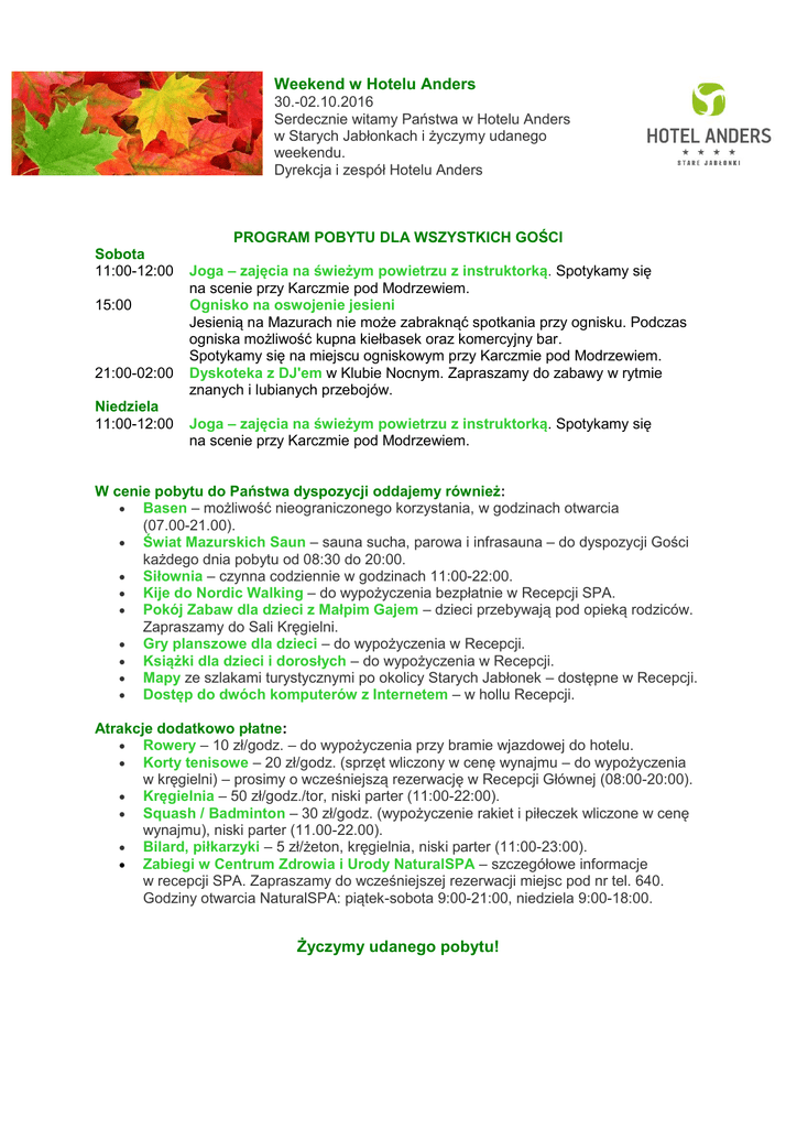 Weekend w Hotelu Anders 30.-02.10.2016 Serdecznie witamy Państwa w Hotelu Anders w Starych Jabłonkach i życzymy udanego weekendu. Dyrekcja i zespół Hotelu Anders PROGRAM POBYTU DLA WSZYSTKICH GOŚCI Sobota 11:00-12:00 15:00 21:00-02:00 Niedziela 11:00-12:00 Joga – zajęcia na świeżym powietrzu z instruktorką. Spotykamy się na scenie przy Karczmie pod Modrzewiem. Ognisko na oswojenie jesieni Jesienią na Mazurach nie może zabraknąć spotkania przy ognisku. Podczas ogniska możliwość kupna kiełbasek oraz komercyjny bar. Spotykamy się na miejscu ogniskowym przy Karczmie pod Modrzewiem. Dyskoteka z DJ'em w Klubie Nocnym. Zapraszamy do zabawy w rytmie znanych i lubianych przebojów. Joga – zajęcia na świeżym powietrzu z instruktorką. Spotykamy się na scenie przy Karczmie pod Modrzewiem. W cenie pobytu do Państwa dyspozycji oddajemy również: Basen – możliwość nieograniczonego korzystania, w godzinach otwarcia (07.00-21.00). Świat Mazurskich Saun – sauna sucha, parowa i infrasauna – do dyspozycji Gości każdego dnia pobytu od 08:30 do 20:00. Siłownia – czynna codziennie w godzinach 11:00-22:00. Kije do Nordic Walking – do wypożyczenia bezpłatnie w Recepcji SPA. Pokój Zabaw dla dzieci z Małpim Gajem – dzieci przebywają pod opieką rodziców. Zapraszamy do Sali Kręgielni. Gry planszowe dla dzieci – do wypożyczenia w Recepcji. Książki dla dzieci i dorosłych – do wypożyczenia w Recepcji. Mapy ze szlakami turystycznymi po okolicy Starych Jabłonek – dostępne w Recepcji. Dostęp do dwóch komputerów z Internetem – w hollu Recepcji. Atrakcje dodatkowo płatne: Rowery – 10 zł/godz. – do wypożyczenia przy bramie wjazdowej do hotelu. Korty tenisowe – 20 zł/godz. (sprzęt wliczony w cenę wynajmu – do wypożyczenia w kręgielni) – prosimy o wcześniejszą rezerwację w Recepcji Głównej (08:00-20:00). Kręgielnia – 50 zł/godz./tor, niski parter (11:00-22:00). Squash / Badminton – 30 zł/godz. (wypożyczenie rakiet i piłeczek wliczone w cenę wynajmu), niski parter (11.00-22.00). Bilard, piłkarzyki – 5 zł/żeton, kręgielnia, niski parter (11:00-23:00). Zabiegi w Centrum Zdrowia i Urody NaturalSPA – szczegółowe informacje w recepcji SPA. Zapraszamy do wcześniejszej rezerwacji miejsc pod nr tel. 640. Godziny otwarcia NaturalSPA: piątek-sobota 9:00-21:00, niedziela 9:00-18:00. Życzymy udanego pobytu!