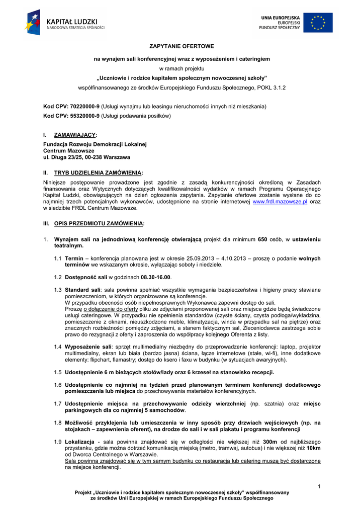 ZAPYTANIE OFERTOWE na wynajem sali konferencyjnej wraz z wyposażeniem i cateringiem w ramach projektu „Uczniowie i rodzice kapitałem społecznym nowoczesnej szkoły” współfinansowanego ze środków Europejskiego Funduszu Społecznego, POKL 3.1.2 Kod CPV: 70220000-9 (Usługi wynajmu lub leasingu nieruchomości innych niż mieszkania) Kod CPV: 55320000-9 (Usługi podawania posiłków) I. ZAMAWIAJĄCY: Fundacja Rozwoju Demokracji Lokalnej Centrum Mazowsze ul. Długa 23/25, 00-238 Warszawa II. TRYB UDZIELENIA ZAMÓWIENIA: Niniejsze postępowanie prowadzone jest zgodnie z zasadą konkurencyjności określoną w Zasadach finansowania oraz Wytycznych dotyczących kwalifikowalności wydatków w ramach Programu Operacyjnego Kapitał Ludzki, obowiązujących na dzień ogłoszenia zapytania. Zapytanie ofertowe zostanie wysłane do co najmniej trzech potencjalnych wykonawców, udostępnione na stronie internetowej www.frdl.mazowsze.pl oraz w siedzibie FRDL Centrum Mazowsze. III. OPIS PRZEDMIOTU ZAMÓWIENIA: 1. Wynajem sali na jednodniową konferencję otwierającą projekt dla minimum 650 osób, w ustawieniu teatralnym. 1.1 Termin – konferencja planowana jest w okresie 25.09.2013 – 4.10.2013 – proszę o podanie wolnych terminów we wskazanym okresie, wyłączając soboty i niedziele. 1.2 Dostępność sali w godzinach 08.30-16.00. 1.3 Standard sali: sala powinna spełniać wszystkie wymagania bezpieczeństwa i higieny pracy stawiane pomieszczeniom, w których organizowane są konferencje. W przypadku obecności osób niepełnosprawnych Wykonawca zapewni dostęp do sali. Proszę o dołączenie do oferty pliku ze zdjęciami proponowanej sali oraz miejsca gdzie będą świadczone usługi cateringowe. W przypadku nie spełnienia standardów (czyste ściany, czysta podłoga/wykładzina, pomieszczenie z oknami, nieuszkodzone meble, klimatyzacja, winda w przypadku sal na piętrze) oraz znacznych rozbieżności pomiędzy zdjęciami, a stanem faktycznym sal, Zleceniodawca zastrzega sobie prawo do rezygnacji z oferty i zaproszenia do współpracy kolejnego Oferenta z listy. 1.4 Wyposażenie sali: sprzęt multimedialny niezbędny do przeprowadzenie konferencji: laptop, projektor multimedialny, ekran lub biała (bardzo jasna) ściana, łącze internetowe (stałe, wi-fi), inne dodatkowe elementy: flipchart, flamastry; dostęp do ksero i faxu w budynku (w sytuacjach awaryjnych). 1.5 Udostępnienie 6 m bieżących stołów/lady oraz 6 krzeseł na stanowisko recepcji. 1.6 Udostępnienie co najmniej na tydzień przed planowanym terminem konferencji dodatkowego pomieszczenia lub miejsca do przechowywania materiałów konferencyjnych. 1.7 Udostępnienie miejsca na przechowywanie odzieży wierzchniej (np. szatnia) oraz miejsc parkingowych dla co najmniej 5 samochodów. 1.8 Możliwość przyklejenia lub umieszczenia w inny sposób przy drzwiach wejściowych (np. na stojakach – zapewnienia oferent), na drodze do sali i w sali plakatu i programu konferencji 1.9 Lokalizacja - sala powinna znajdować się w odległości nie większej niż 300m od najbliższego przystanku, gdzie można dotrzeć komunikacją miejską (metro, tramwaj, autobus) i nie większej niż 10km od Dworca Centralnego w Warszawie. Sala powinna znajdować się w tym samym budynku co restauracja lub catering muszą być dostarczone na miejsce konferencji. 1 Projekt „Uczniowie i rodzice kapitałem społecznym nowoczesnej szkoły” współfinansowany ze środków Unii Europejskiej w ramach Europejskiego Funduszu Społecznego 2. Przerwa kawowa: całodniowa, uzupełniana w razie potrzeby: - kawa, herbata, ciasteczka lub ciasto, woda gazowana, niegazowana, soki owocowe (nie napoje), mleko (nie w proszku) lub śmietanka do kawy. Przerwa kawowa powinna być przygotowana co najmniej na pół godziny przed rozpoczęciem konferencji. 3. Lunch: zupa, drugie danie i deser, z możliwością wyboru dania wegetariańskiego. Wyżywienie w tym samym budynku co sala konferencyjna, należy podać trzy przykładowe MENU. IV. NIE JEST DOPUSZCZALNE SKŁADANIE OFERT CZĄSTKOWYCH. V. DOKUMENTY I OŚWIADCZENIA WYMAGANE DLA POTWIERDZENIA WARUNKÓW UDZIAŁU W ZAMÓWIENIU: a) skan podpisanego przez Wykonawcę oświadczenia o braku podstaw do wykluczenia (Załącznik nr 1) Zamawiający nie może udzielić zamówienia podmiotom powiązanym z nim osobowo lub kapitałowo. Przez powiązania kapitałowe lub osobowe rozumie się wzajemne powiązania między Beneficjentem lub osobami upoważnionymi do zaciągania zobowiązań w imieniu Beneficjenta lub osobami wykonującymi w imieniu Beneficjenta czynności związane z przygotowaniem i przeprowadzeniem procedury wyboru wykonawcy a wykonawcą, polegające w szczególności na: a) uczestniczeniu w spółce jako wspólnik spółki cywilnej lub spółki osobowej; b) posiadaniu co najmniej 10 % udziałów lub akcji; c) pełnieniu funkcji członka organu nadzorczego lub zarządzającego, prokurenta, pełnomocnika; d) pozostawaniu w związku małżeńskim, w stosunku pokrewieństwa lub powinowactwa w linii prostej, pokrewieństwa lub powinowactwa w linii bocznej do drugiego stopnia lub w stosunku przysposobienia, opieki lub kurateli. zdjęcia oferowanej sali b) VI. SPOSÓB WYCENY: 1) 2) 3) Prosimy o podawanie cen brutto w tabelce stanowiącej Załącznik nr 2(formularz oferty) - formularz oferty musi zostać przesłany w postaci podpisanego przez wykonawcę skanu oraz dodatkowo w formie edytowalnej (forma edytowalna nie wymaga podpisu). Zamawiający może prosić oferentów o dodatkowe wyjaśnienia lub uzupełnienie oferty. W takiej sytuacji wszyscy oferenci będą mieli szanse na takie same uzupełnienia. Oferenci mogą zadawać pytania w trakcie okresu przygotowania oferty wyłącznie mailowo. VII. POZOSTAŁE WARUNKI: 1) 2) 3) 4) Umowa musi zostać podpisana do dnia 07.06.2013r. Ustalone ceny nie mogą ulec zmianie przez cały okres trwania umowy, niezależnie od ewentualnych zmian stawki VAT w kolejnych miesiącach. Jeżeli za