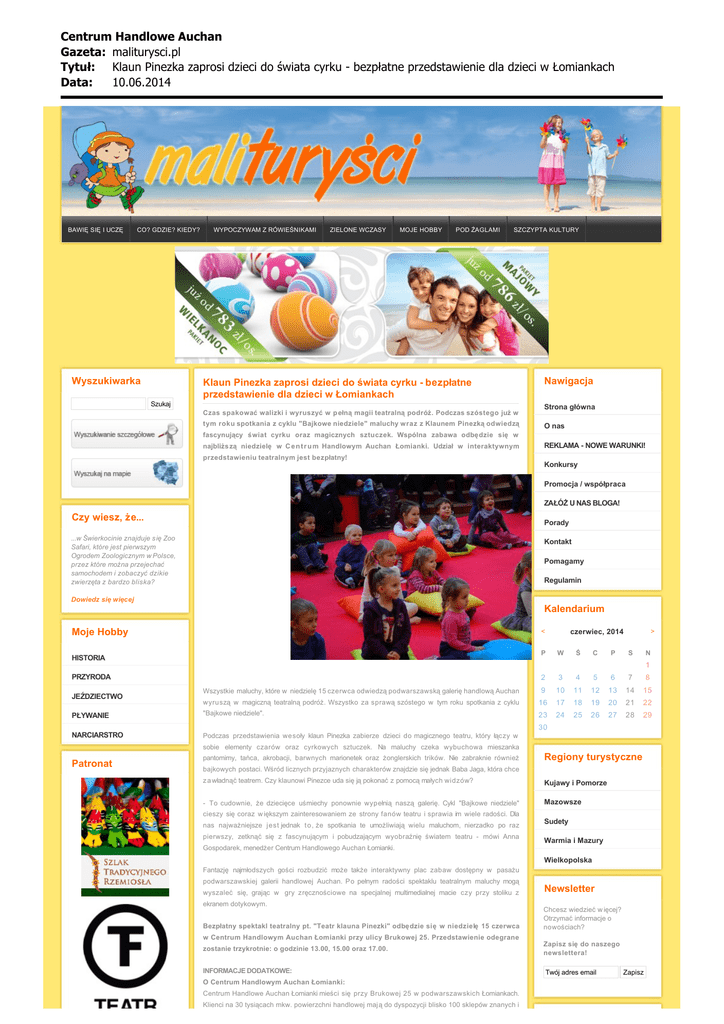 Centrum Handlowe Auchan Gazeta: maliturysci.pl Tytu³: Klaun Pinezka zaprosi dzieci do wiata cyrku bezp³atne przedstawienie dla dzieci w £omiankach Data: 10.06.2014 BAWIĘ SIĘ I UCZĘ WYPOCZYWAM Z RÓWIEŚNIKAMI CO? GDZIE? KIEDY? Wyszukiwarka ZIELONE WCZASY MOJE HOBBY POD ŻAGLAMI SZCZYPTA KULTURY Klaun Pinezka zaprosi dzieci do świata cyrku - bezpłatne przedstawienie dla dzieci w Łomiankach Szukaj Czas spakować walizki i wyruszyć w p ełną magii teatralną podróż. Podczas szóstego już w tym roku spotkania z cyklu "Bajkowe niedziele" maluchy wraz z Klaunem Pinezką odwiedzą Nawigacja Strona główna O nas fascynujący świat cyrku oraz magicznych sztuczek. Wspólna zabawa odbędzie się w najbliżs zą niedzielę w C e n t r u m Handlowym Auchan Łomianki. Udział w interaktywnym REKLAMA - NOWE WARUNKI! przedstawieniu teatralnym jest bezpłatny! Konkursy Promocja / współpraca ZAŁÓŻ U NAS BLOGA! Czy wiesz, że... Porady ...w Świerkocinie znajduje się Zoo Safari, które jest pierwszym Ogrodem Zoologicznym w Polsce, przez które można przejechać samochodem i zobaczyć dzikie zwierzęta z bardzo bliska? Kontakt Pomagamy Regulamin Dowiedz się więcej Kalendarium Moje Hobby HISTORIA < > czerwiec, 2014 P W Ś C P S 2 3 4 5 6 7 8 Wszystkie maluchy, które w niedzielę 15 czerwca odwiedzą podwarszawską galerię handlową Auchan 9 10 11 12 13 14 15 wyruszą w magiczną teatralną podróż. Wszystko za sprawą szóstego w tym roku spotkania z cyklu 16 17 18 19 20 21 22 "Bajkowe niedziele". 23 24 25 26 27 28 29 N 1 PRZYRODA JEŹDZIECTWO PŁYWANIE 30 NARCIARSTRO Podczas przedstawienia wesoły klaun Pinezka zabierze dzieci do magicznego teatru, który łączy w sobie elementy czarów oraz cyrkowych sztuczek. Na maluchy czeka wybuchowa mieszanka Patronat pantomimy, tańca, akrobacji, barwnych marionetek oraz żonglerskich trików. Nie zabraknie również Regiony turystyczne bajkowych postaci. Wśród licznych przyjaznych charakterów znajdzie się jednak Baba Jaga, która chce z a władnąć teatrem. Czy klaunowi Pinezce uda się ją pokonać z pomocą małych widzów? Kujawy i Pomorze - To cudownie, że dziecięce uśmiechy ponownie wypełnią naszą galerię. Cykl "Bajkowe niedziele" Mazowsze cieszy się coraz w iększym zainteresowaniem ze strony fanów teatru i sprawia im wiele radości. Dla nas najważniejsze jest jednak t o , że spotkania te umożliwiają wielu maluchom, nierzadko po raz pierwszy, zetknąć się z fascynującym i pobudzającym wyobraźnię światem teatru - mówi Anna Sudety Warmia i Mazury Gospodarek, menedżer Centrum Handlowego Auchan Łomianki. Wielkopolska Fantazję najmłodszych gości rozbudzić może także interaktywny plac zabaw dostępny w pasażu podwarszawskiej galerii handlowej Auchan. Po pełnym radości spektaklu teatralnym maluchy mogą wyszaleć się, grając w gry zręcznościowe na specjalnej multimedialnej macie czy przy stoliku z ekranem dotykowym. Bezpłatny spektakl teatralny pt. "Teatr klauna Pinezki" odbędzie się w niedzielę 15 czerwca Newsletter Chcesz wiedzieć w ięcej? Otrzymać informacje o nowościach? w Centrum Handlowym Auchan Łomianki przy ulicy Brukowej 25. Przedstawienie odegrane zostanie trzykrotnie: o godzinie 13.00, 15.00 oraz 17.00. Zapisz się do naszego newslettera! INFORMACJE DODATKOWE: O Centrum Handlowym Auchan Łomianki: Centrum Handlowe Auchan Łomianki mieści się przy Brukowej 25 w podwarszawskich Łomiankach. Klienci na 30 tysiącach mkw. powierzchni handlowej mają do dyspozycji blisko 100 sklepów znanych i Twój adres email Zapisz Centrum Handlowe Auchan Gazeta: maliturysci.pl Tytu³: Klaun Pinezka zaprosi dzieci do wiata cyrku bezp³atne przedstawienie dla dzieci w £omiankach Data: 10.06.2014 wiodących na rynku marek, które kompleksowo spełniają potrzeby całej rodziny. Wśród nich znajdują się Polecamy m.in. H&M, Smyk, Reserved, Mohito, C&A, Home&You, Sephora, Apart, Kruk, Camaieu, CCC, Wojas, Ryłko, Symbiosis, Centro, Kari, Vistula/Wólczanka, Bytom, Orsay, Promod, Calzedonia, Intimissimi, Yves OBOZY I KOLONIE Rocher, Inglot, Barakuda, czy Empik. Obok modnych butików odzieżowych, salonów z obuwiem, perfumerii czy księgarni, w galerii znajdują się liczne punkty usługowe oraz lokale gastronomiczne. SKLEP Z ZABAWKAMI Ofertę CH Auchan Łomianki wzmacnia hipermarket Auchan. Galeria jest wyposażo n a w w i e l e nowoczesnych udogodnień i atrakcji dla klientów, między innymi podwieszony pod sufitem okrągły ekran LED (tzw. ring screen), interaktywne plany galerii czy plac zabaw dla najmłodszych z multimedialną podłogą interaktywną. W specjalnej strefie wypoczynku Klienci znajdą również m.in. wygodne kanapy, bezprzewodowy Internet oraz nowoczesną czytelnię, realizującą ideę bookcrossingu. CH Auchan MEBLE DZIECIĘCE - TANIO KSIĄŻKI DLA DZIECI ODPOCZYNEK W UZDROWISKU Łomianki zostało otwarte w 2012 roku. Galeria jest czynna od poniedziałku do soboty w godzinach 9:00 21:00, natomiast w niedzielę od 9:30 do 20.00. Centrum Handlowe posiada 1820 miejsc parkingowych, w OBOZY JĘZYKOWE tym 25 dla osób niepełnosprawnych. Więcej informacji na stronie internetowej www.auchanlomianki.pl. ZABAWKI DLA DZIECI Data dodania: 10.06.2014 - 12:45 WAKACJE Z DZIECKIEM Dotyczy wpisu: Klaun Pinezka zaprosi dzieci do świata cyrku - bezpłatne przedstawienie dla dzieci w Łomiankach MEBLOMAX SKLEP ROWEROWY BILETY LOTNICZE HOTEL DLA DZIECI! Reklama MEBLE DLA DZIECI SZLIFOWANIE SZKŁA MEDYCYNA ESTETYCZNA FOTOGRAF ŚLUBNY PRZYJAZNE LINKI PROJEKTOWANIE STRON WARSZAWA Reklama Willa Swoboda Zakopane Noclegi Centrum Handlowe Auchan Gazeta: maliturysci.pl Tytu³: Klaun Pinezka zaprosi dzieci do wiata cyrku bezp³atne przedstawienie dla dzieci w £omiankach Data: 10.06.2014 Centrum Handlowe Auchan Gazeta: maliturysci.pl Tytu³: Klaun Pinezka zaprosi dzieci do wiata cyrku bezp³atne przedstawienie dla dzieci w £omiankach Data: 10.06.2014