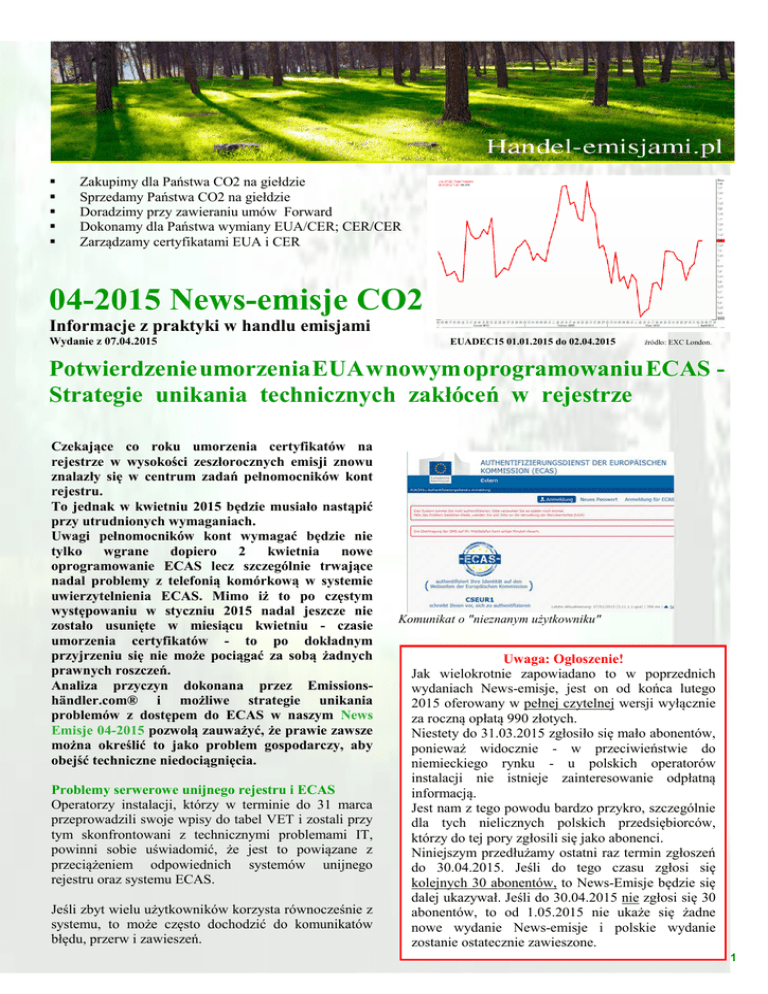 Zakupimy dla Państwa CO2 na giełdzie Sprzedamy Państwa CO2 na giełdzie Doradzimy przy zawieraniu umów Forward Dokonamy dla Państwa wymiany EUA/CER; CER/CER Zarządzamy certyfikatami EUA i CER 04-2015 News-emisje CO2 Informacje z praktyki w handlu emisjami Wydanie z 07.04.2015 EUADEC15 01.01.2015 do 02.04.2015 źródło: EXC London. Potwierdzenie umorzenia EUA w nowym oprogramowaniu ECAS Strategie unikania technicznych zakłóceń w rejestrze Czekające co roku umorzenia certyfikatów na rejestrze w wysokości zeszłorocznych emisji znowu znalazły się w centrum zadań pełnomocników kont rejestru. To jednak w kwietniu 2015 będzie musiało nastąpić przy utrudnionych wymaganiach. Uwagi pełnomocników kont wymagać będzie nie tylko wgrane dopiero 2 kwietnia nowe oprogramowanie ECAS lecz szczególnie trwające nadal problemy z telefonią komórkową w systemie uwierzytelnienia ECAS. Mimo iż to po częstym występowaniu w styczniu 2015 nadal jeszcze nie zostało usunięte w miesiącu kwietniu - czasie umorzenia certyfikatów - to po dokładnym przyjrzeniu się nie może pociągać za sobą żadnych prawnych roszczeń. Analiza przyczyn dokonana przez Emissionshändler.com® i możliwe strategie unikania problemów z dostępem do ECAS w naszym News Emisje 04-2015 pozwolą zauważyć, że prawie zawsze można określić to jako problem gospodarczy, aby obejść techniczne niedociągnięcia. Problemy serwerowe unijnego rejestru i ECAS Operatorzy instalacji, którzy w terminie do 31 marca przeprowadzili swoje wpisy do tabel VET i zostali przy tym skonfrontowani z technicznymi problemami IT, powinni sobie uświadomić, że jest to powiązane z przeciążeniem odpowiednich systemów unijnego rejestru oraz systemu ECAS. Jeśli zbyt wielu użytkowników korzysta równocześnie z systemu, to może często dochodzić do komunikatów błędu, przerw i zawieszeń. Komunikat o "nieznanym użytkowniku" Uwaga: Ogłoszenie! Jak wielokrotnie zapowiadano to w poprzednich wydaniach News-emisje, jest on od końca lutego 2015 oferowany w pełnej czytelnej wersji wyłącznie za roczną opłatą 990 złotych. Niestety do 31.03.2015 zgłosiło się mało abonentów, ponieważ widocznie - w przeciwieństwie do niemieckiego rynku - u polskich operatorów instalacji nie istnieje zainteresowanie odpłatną informacją. Jest nam z tego powodu bardzo przykro, szczególnie dla tych nielicznych polskich przedsiębiorców, którzy do tej pory zgłosili się jako abonenci. Niniejszym przedłużamy ostatni raz termin zgłoszeń do 30.04.2015. Jeśli do tego czasu zgłosi się kolejnych 30 abonentów, to News-Emisje będzie się dalej ukazywał. Jeśli do 30.04.2015 nie zgłosi się 30 abonentów, to od 1.05.2015 nie ukaże się żadne nowe wydanie News-emisje i polskie wydanie zostanie ostatecznie zawieszone. 1 Komunikat błędu przy wyborze ECAS może np. wystąpić z powodu jego przeciążenia. Użytkownik otrzymuje jednak wrażenie, że wprowadził błędne dane uwierzytelniające, ponieważ wywołuje je system poprzez swój komunikat. Tutaj pomaga tylko chwilę odczekać i potem przeprowadzić kolejną próbę logowania. Przerwanie transakcji podczas wprowadzania danych Kolejny komunikat systemowy może się pojawić gdy system rejestru z powodu przeciążenia nie może odpowiedzieć na wielkość zapytań transakcyjnych. Ale także po zakończeniu transakcji i jeszcze przed potwierdzeniem w ECAS transakcje mogą zostać przerwane przez rejestr z powodu przeciążenia. Problemy z dostępem do ECAS będą mieć prawne konsekwencje Jak już opisano to w poprzednich News-emisje, problemy z autoryzacją ECAS w unijnym rejestrze nie miały końca. W przeciwieństwie do miesięcy od maja do lutego nie mają one jednak z reguły żadnych bezpośrednich następstw dla operatorów instalacji, jeśli pominie się transfer certyfikatów, które dotrą do operatora później niż w ustawowych 26 godzinach (poniedziałek-piątek). Natomiast w miesiącach od marca do kwietnia położenie operatorów instalacji wygląda znacznie dramatyczniej, ponieważ w tym czasie należy dokonać nie tylko wpisu do tabel VET lecz także umorzyć certyfikaty na rejestr w Brukseli. Do tego czekały i czekają dalsze czasowo krytyczne transakcje jak wymiana CER1/ERU na koncie do 31.03.2015 jak również transfer odpowiednich certyfikatów od handlowców do operatorów instalacji. Możliwymi powstającymi konsekwencjami z "braku dostępu" do rejestru, jako skutek awarii w ECAS, są w miesiącach marzec i kwiecień: ekonomiczne straty w wysokości 0,50 Euro/t pomnożone przez wielkość wolnej wielkości do wymiany, z powodu niewykorzystania różnicy cen CER1/ERU do CER2 przymusowa i automatyczna blokada konta z powodu brakującego albo niepotwierdzonego wpisu do VET 100 Euro kary za każdą tonę emisji roku poprzedniego z powodu nieumorzenia certyfikatów w kwietniu. Infobox Skup nieważnych certyfikatów CER/ERU Po wprowadzeniu kodu potwierdzającego unijnego rejestru został przeciążony. 4 x4 system Przy tym należy szczególnie zwrócić uwagę, że w obserwowanych pojedynczych przypadkach wszystko na to wskazuje, że mimo zerwania systemu transakcja została przeprowadzona. Ta osobliwość będzie wtedy szczególnie nieprzyjemna, jeśli użytkownik powtórzy transakcję i nie będąc tego świadomy przeprowadzi ją dwukrotnie. W powiązaniu z zawieszeniem systemu Emissionshändler.com® zwraca również uwagę, że przy użytkowaniu systemu operacyjnego Windows XP lub starszych mogą pojawić się problemy, także przy innych zastosowaniach w handlu emisjami na krajowych rejestrach, które nie otrzymają już wsparcia. Nieznaczna część operatorów będzie posiadała po 31.03.2015 jeszcze już wtedy nieważne certyfikaty CER1 i ERU. Należy je wkrótce po żądaniu krajowych administratorów zgodnie z artykułem 115 rozporządzenia o rejestrze usunąć w terminie 40 dni z unijnego konta rejestru. Aby po częściowym lub całościowy