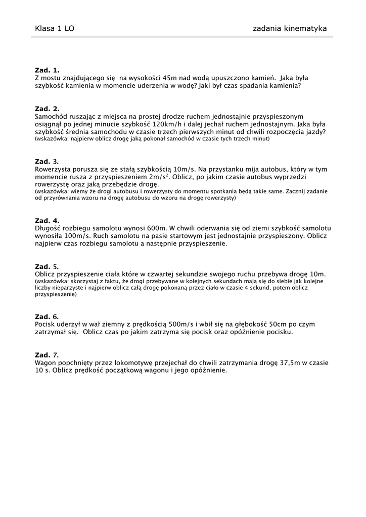 Klasa 1 LO zadania kinematyka