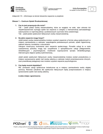 Załącznik 10 – Informacja na temat obszarów wsparcia w projekcie Obszar 1 – Centrum Opieki Środowiskowej 1. Czy to jest propozycja dla mnie? Tak – jeżeli jesteś osobą niesamodzielną, która ze względu na wiek, stan zdrowia lub niepełnosprawność wymaga opieki lub wsparcia w związku z niemożnością samodzielnego wykonywania co najmniej jednej z podstawowych czynności dnia codziennego. Tak – jeżeli jesteś opiekunem faktycznym osoby niesamodzielnej. 2. Na jakie wsparcie mogę liczyć? Jeżeli jesteś osobą niesamodzielną możesz uzyskać wsparcie w formie usług opiekuńczych w miejscu zamieszkania w zakresie: zaspokajania podstawowych potrzeb, opieki higienicznej, zaleceń lekarza, kontaktów z otoczeniem. Usługom towarzyszy budowanie sieci wsparcia społecznego. Ponadto usługi te w razie uzasadnionej potrzeby mogą być uzupełnione o specjalistyczne usługi pielęgniarskie, rehabilitacyjne i psychologiczne, możliwość wypożyczenia sprzętu rehabilitacyjnego, interwencyjne objęcie opieką wytchnieniową. Jeżeli jesteś opiekunem faktycznym osoby niesamodzielnej możesz zostać przeszkolony w miejscu sprawowania opieki nad osobą zależną w zakresie metod przemieszczania chorych, oraz prawidłowej pielęgnacji oraz możesz uzyskać wsparcie psychologiczne. 3. Czy będę musiał dojeżdżać? Nie, ponieważ usługi opiekuńcze świadczone są w miejscu zamieszkania osoby objętej pomocą. Również szkolenia dla opiekunów faktycznych będą przeprowadzane w miejscu sprawowania opieki nad osobą zależną. Liczba miejsc ograniczona. Projekt „Usługi społeczne dla mieszkańców Poznania” współfinansowany przez Unię Europejską z Europejskiego Funduszu Społecznego w ramach Wielkopolskiego Regionalnego Programu Operacyjnego na lata 2014-2020 strona 1 Obszar 2 – wsparcie opiekunów faktycznych w opiece nad osobą z niepełnosprawnością 1. Czy to jest propozycja dla mnie? Tak – jeżeli jesteś osobą z niepełnosprawnością lub opiekunem faktycznym osoby z niepełnosprawnością. Tak – jeżeli jesteś opiekunem faktycznym osoby z niepełnosprawnością. 2. Na jakie wsparcie mogę liczyć? Oferowane przez nas wsparcie asystenta osoby z niepełnosprawnością zwanego Trenerem Aktywności jest zindywidualizowane i dostosowane do każdej osoby z niepełnosprawnością. Wspólnie ustalimy plan działania i zakres czasowy, jaki zajmie nam realizacja poszczególnych jego etapów. Jako opiekun faktyczny osoby z niepełnosprawnością możesz skorzystać z szkoleń typu kurs podstawowej pierwszej pomocy przedmedycznej, kurs masażu, pakiet szkoleń: moduł 1. – Trener interpersonalny, moduł 2. – Następstwa funkcjonalne niepełnosprawności oraz savoirvivre w kontaktach z osobami z niepełnosprawnością, moduł 3. – Prawne i instytucjonalne wsparcie osób z niepełnosprawnością, moduł 4. – Wdrożenie do zagadnień Modelu Trenera Aktywności oraz etycznych aspektów pracy z osobą niesamodzielną, zapoznanie z narzędziami pracy asystentów osób z niepełnosprawnością. 3. Gdzie będę musiał dojeżdżać? Na początkowym etapie to Trener Aktywności będzie dojeżdżał do osoby z niepełnosprawnością. Na kolejnych etapach osoba objęta wsparciem asystencki będzie dojeżdżała do Centrum Usamodzielnienia. Szkolenia dla opiekunów faktycznych głównie odbywać się będą w Centrum Usamodzielnienia. 4. Na czym będzie polegało wsparcie asystenckie Trenera Aktywności Przez usługi asystenckie rozumie się świadczenie osobistej pomocy przez Trenera Aktywności w wykonywaniu czynności, których nie jest ona w stanie wykonywać samodzielnie. Jego zadaniem jest także pomoc osobom z niepełnosprawnością w wykonaniu podjętych już przez nich działań oraz inspirowanie i zachęcanie do aktywności, doradzanie, wsparcie psychiczne i emocjonalne. Asystent ma być towarzyszem w nawiązywaniu nowych relacji społecznych, motywacją do aktywnego korzystania z ról życia osobistego, społecznego i zawodowego. Zadaniem Trenera aktywności nie jest podejmowanie decyzji za osobę z niepełnosprawnością, a jedynie pomoc, bądź wspomaganie jej w realizacji osobistych zamiarów. Praca Trenera polega na wykonaniu ściśle określonych zadań, przy czym nie są to zadania typowo opiekuńcze. Asystent nie wyręcza podopiecznego w jego obowiązkach, ale wspiera bądź wskazuje rozwiązania problemu, pozwala osobom objętym opieką asystencką na rozwój umiejętności w sferze samorealizacji czy szeroko rozumianej samodzielności, przy czym jednocześnie nie izoluje podopiecznego od jego środowiska i nie stwarza zagrożenia jego alienacji. 5. Na czym będzie polegało wsparcie w Centrum Usamodzielnienia Podstawowym celem pobytu w Centrum Usamodzielnienia jest poprawa dostępu do usług opiekuńczych i usamodzielniających w zastępstwie za opiekunów faktycznych; ponadto poznanie nowych zasad funkcjonowania i wykonywania podstawowych obowiązków związanych z samoobsługą, wykorzystanie zasobów klienta, ustalania celów i ich realizowania. W Centrum będą realizowane formy wsparcia równorzędnie dla osób z Projekt „Usługi społeczne dla mieszkańców Poznania” współfinansowany przez Unię Europejską z Europejskiego Funduszu Społecznego w ramach Wielkopolskiego Regionalnego Programu Operacyjnego na lata 2014-2020 strona 2 niepełnosprawnością i ich opiekunów faktycznych. Centrum będzie czynne w dni robocze i (sporadycznie soboty) – wsparcie dla poszczególnych osób odbywać się będzie wg. ustalonego grafiku zgodnie z ustalonym kontraktem z trenerem aktywności (Indywidualny Plan Rozwoju). W celu uzupełnienia działań aktywizacyjnych realizowane będą: • zajęcia wspomagające służące usamodzielnieniu w poszczególnych sferach życia, • zajęcia socjoterapeutyczne, a w tym również warsztaty kompetencji społecznych i zajęcia terapeutyczne obejmą również grupy wsparcia, • wsparcie specjalistyczne – gru