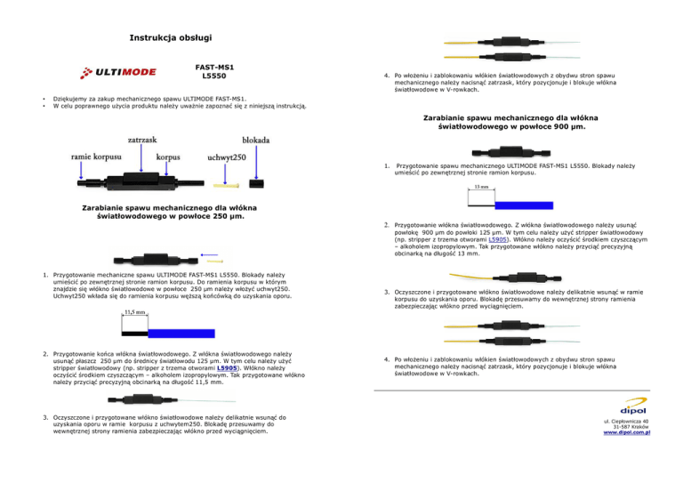 Instrukcja obsługi FAST-MS1 L5550 • • 4. Po włożeniu i zablokowaniu włókien światłowodowych z obydwu stron spawu mechanicznego należy nacisnąć zatrzask, który pozycjonuje i blokuje włókna światłowodowe w V-rowkach. Dziękujemy za zakup mechanicznego spawu ULTIMODE FAST-MS1. W celu poprawnego użycia produktu należy uważnie zapoznać się z niniejszą instrukcją. Zarabianie spawu mechanicznego dla włókna światłowodowego w powłoce 900 µm. 1. Przygotowanie spawu mechanicznego ULTIMODE FAST-MS1 L5550. Blokady należy umieścić po zewnętrznej stronie ramion korpusu. Zarabianie spawu mechanicznego dla włókna światłowodowego w powłoce 250 µm. 2. Przygotowanie włókna światłowodowego. Z włókna światłowodowego należy usunąć powłokę 900 µm do powłoki 125 µm. W tym celu należy użyć stripper światłowodowy (np. stripper z trzema otworami L5905). Włókno należy oczyścić środkiem czyszczącym – alkoholem izopropylowym. Tak przygotowane włókno należy przyciąć precyzyjną obcinarką na długość 13 mm. 1. Przygotowanie mechaniczne spawu ULTIMODE FAST-MS1 L5550. Blokady należy umieścić po zewnętrznej stronie ramion korpusu. Do ramienia korpusu w którym znajdzie się włókno światłowodowe w powłoce 250 µm należy włożyć uchwyt250. Uchwyt250 wkłada się do ramienia korpusu węższą końcówką do uzyskania oporu. 2. Przygotowanie końca włókna światłowodowego. Z włókna światłowodowego należy usunąć płaszcz 250 µm do średnicy światłowodu 125 µm. W tym celu należy użyć stripper światłowodowy (np. stripper z trzema otworami L5905). Włókno należy oczyścić środkiem czyszczącym – alkoholem izopropylowym. Tak przygotowane włókno należy przyciąć precyzyjną obcinarką na długość 11,5 mm. 3. Oczyszczone i przygotowane włókno światłowodowe należy delikatnie wsunąć do uzyskania oporu w ramie korpusu z uchwytem250. Blokadę przesuwamy do wewnętrznej strony ramienia zabezpieczając włókno przed wyciągnięciem. 3. Oczyszczone i przygotowane włókno światłowodowe należy delikatnie wsunąć w ramie korpusu do uzyskania oporu. Blokadę przesuwamy do wewnętrznej strony ramienia zabezpieczając włókno przed wyciągnięciem. 4. Po włożeniu i zablokowaniu włókien światłowodowych z obydwu stron spawu mechanicznego należy nacisnąć zatrzask, który pozycjonuje i blokuje włókna światłowodowe w V-rowkach. ul. Ciepłownicza 40 31-587 Kraków www.dipol.com.pl