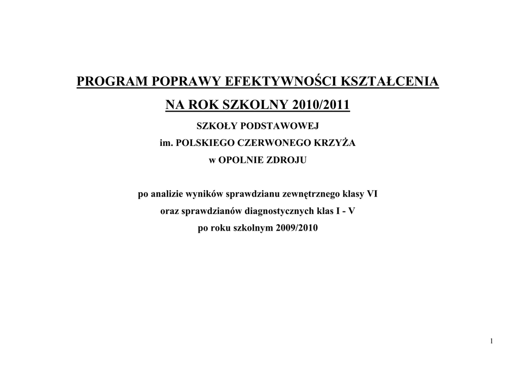 PROGRAM POPRAWY EFEKTYWNOŚCI KSZTAŁCENIA NA ROK SZKOLNY 2010/2011 SZKOŁY PODSTAWOWEJ im. POLSKIEGO CZERWONEGO KRZYŻA w OPOLNIE ZDROJU po analizie wyników sprawdzianu zewnętrznego klasy VI oraz sprawdzianów diagnostycznych klas I - V po roku szkolnym 2009/2010 1 I. WSTĘP Po analizie wyników zewnętrznego sprawdzianu po kl. VI oraz testów diagnostycznych kl. I - V, Rada Pedagogiczna SP w Opolnie Zdroju postanowiła w roku szkolnym 2010/2011 wdrożyć w życie plan obejmujący swym zasięgiem przede wszystkim sferę dydaktyczną. Wyniki sprawdzianu po kl.6 są na poziomie wyższym od średniej gminnej, powiatowej, wojewódzkiej a nawet ogólnopolskiej. Zaobserwowano. Szczególną uwagę zwrócić należy na umiejętność WYKORZYSTANIA WIEDZY W PRAKTYCE I KORZYSTANIA Z INFRMACJI. Analiza diagnoz pomiaru dydaktycznego potwierdza potrzebę wprowadzenia planu poprawy efektywności kształcenia. Istnieje potrzeba przeanalizowania metod nauczania i obowiązującego w szkole zestawu programów nauczania, pracy zespołowej nauczycieli, pedagoga, uczniów i rodziców, relacji międzyludzkich oraz ustalenia konkretnych procedur naprawczych. II. CELE PLANU CEL GŁÓWNY • poprawa efektywności kształcenia w szkole (podnoszenie wyników planowanych wewnętrznych diagnoz dydaktycznych oraz sprawdzianu po kl. VI), • opanowanie umiejętności kluczowych, • wprowadzenie elementów oceniania kształtującego w kl.1 i kl.4 z wybranych treściach programowych. CELE SZCZEGÓŁOWE • doskonalenie efektów procesu dydaktycznego, w standardach WYKORZYSTANIA WIEDZY W PRAKTYCE I KORZYSTANIA Z INFRMACJI, kształcenie i doskonalenie umiejętności kluczowych, • korelacja działań uwzględniających program nauczania, standardy wymagań i kompetencje kluczowe wszystkich nauczycieli, • zmniejszenie liczby uczniów mających niezadawalające wyniki diagnoz wewnętrznych oraz sprawdzianu, zwiększenie liczby uczniów z najwyższymi wynikami, 2 • świadome działanie n – li, rodziców i uczniów w zakresie skuteczności działań dydaktycznych i wychowawczych, które wpłyną na sukcesy uczniów i zminimalizują dydaktyczne porażki, III. • doskonalenie metod nauczania n – li poprzez podnoszenie kwalifikacji, udział czynny w pracach zespołów przedmiotowych, • systematyczne śledzenie i analizowanie skuteczności podjętych działań oraz wyciąganie wniosków i ewaluacja owych działań, • systematyczne i konsekwentne wprowadzanie zmian w pracy dydaktycznej, wychowawczej w celu poprawy wyników nauczania, • pedagogizacja rodziców, uświadomienie im potrzeby ścisłej współpracy „szkoły” i „domu” w celu osiągnięcia lepszych wyników. ZAŁOŻENIA PLANU • zintegrowanie działań dyrektora, nauczycieli, rodziców i uczniów, • systematyczna analiza wyników nauczania (sprawdziany diagnostyczne z każdego przedmiotu – sem. I, na poziomie klas I - VI, testy przedmiotowe i interprzedmiotowe – diagnoza wstępna i końcowa • wdrażanie nowych programów i metod aktywizujących, mających na celu poprawę efektów kształcenia, • wprowadzenie elementów oceniania kształtującego w kl.1 i kl.4, • motywowanie uczniów do nauki, • wyrabianie wzorców, cech i postaw, skierowanych na osiągnięcie sukcesu, • ewaluacja programu i umiejętności wyciągania wniosków, • współdziałanie nauczycieli w zespołach przedmiotowych, • uświadomienie nauczycielom, rodzicom i uczniom celowości podejmowanych działań dydaktycznych i wychowawczych, • motywowanie rodziców i innych osób do wspólnego działania wspierającego realizowanie programu, • realizacja indywidualnych programów edukacyjno – terapeutycznych. 3 IV. TREŚCI PLANU 1. Działania dyrektora a) w stosunku do siebie: • organizacja czasu pracy, pozwalająca na bezpośredni kontakt z nauczycielami, dziećmi i rodzicami, b) w stosunku do nauczycieli: • troska o życzliwą atmosferę, • dokonywanie ocen nauczycieli, mające na celu poprawienie jakości wyników edukacji, • zapewnienie nauczycielom możliwości podnoszenia kwalifikacji oraz możliwości samodokształcania (praca zespołu kl.1-3, kl.4-6, rady szkoleniowe, warsztaty, kursy), • analiza i modyfikacja WSO, • zatrudnianie nauczycieli o wysokich kwalifikacjach, • opracowanie harmonogramu obserwacji pod kątem poprawy wyników nauczania, • analiza metod nauczania, programów nauczania, • monitorowanie wprowadzenia na zajęciach elementów oceniania kształtującego, c) w stosunku do uczniów • informowanie o wynikach kształcenia: porównywanie wyników egzaminów wewnątrzszkolnych w stosunku do wyników w rejonie i kraju, • stosowanie nagród motywujących do wytężonej pracy poszczególne zespoły klasowe jak również poszczególnych uczniów, • system kar za nie wywiązywanie się z obowiązków szkolnych, • organizacja procesu nauczania uwzględniająca uczniów zdolnych – koła zainteresowań, jak też słabych – zajęcia wyrównawcze, pomoc SU przy organizacji pomocy w nauce uczniom słabym, • wspomaganie uczniów z rodzin gorzej sytuowanych, 4 d) w stosunku do rodziców: • zapoznanie rodziców z priorytetami szkoły, • umożliwienie kontaktów z dyrektorem i nauczycielami, dostęp do wyników sprawdzianów w szkole i porównanie ich z wynikami w rejonie i kraju, • zapoznanie rodziców z WSO i standardami wymagań, e) w stosunku do instytucji zewnętrznych: • zapoznanie organu nadrzędnego z wynikami pracy szkoły, • zapoznanie z programem poprawy efektywności kształcenia, • pozyskiwanie środków na szkolenia rady pedagogicznej, • pozyskiwanie funduszy i korzystanie ze środków UE. Lp. Obszar działań Zadania Sposoby i formy realizacji Osoba odpowiedzialna 1. 1.Organizowanie pracy w szkole sprzyjające podnoszeniu efektywności kształcenia. Dostosowanie planów pracy do możliwości i zainteresowań uczniów (tygodniowy rozkład zajęć, kalendarz imprez szkolnych , plan zajęć poza