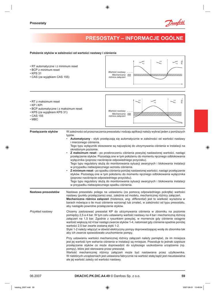Presostaty PRESOSTATY – INFORMACJE OGÓLNE Położenie styków w zależności od wartości nastawy i ciśnienia • RT automatyczne i z minimum reset • BCP z minimum reset • KPS 31 • CAS (za wyjątkiem CAS 155) • RT z maksimum reset • KP i KPI • BCP automatyczne i z maksimum reset • KPS (za wyjątkiem KPS 31) • CAS 155 • MBC Wartość nastawy _ _ _ Mechaniczna różnica załączeń Wartość nastawy _ _ _ Mechaniczna różnica załączeń Przełączanie styków W zależności od przeznaczenia presostatu i rodzaju aplikacji należy wybrać jeden z poniższych typów. • Automatyczny - styki przełączają się automatycznie w zależności od wartości nastawy i mierzonego ciśnienia. Tego typu wyłączniki stosowane są najczęściej do utrzymywania ciśnienia w instalacji na określonym poziomie. • Z maksimum reset - po przekroczeniu ciśnienia powyżej nastawionej wartości, nastąpi przełączenie styków. Pozostają one w tym położeniu do momentu ręcznego odblokowania wyłącznika (poprzez naciśnięcie odpowiedniego przycisku). Tego typu regulatory służą do monitorowania sytuacji awaryjnych i blokowania instalacji w przypadku niebezpiecznego wzrostu ciśnienia. • Z minimum reset - po spadku ciśnienia poniżej nastawionej wartości, nastąpi przełączenie styków. Pozostają one w tym położeniu do momentu ręcznego odblokowania wyłącznika (poprzez naciśnięcie odpowiedniego przycisku). Tego typu regulatory służą do monitorowania sytuacji awaryjnych i blokowania instalacji w przypadku niebezpiecznego spadku ciśnienia. Nastawa presostatów Nastawa presostatu polega na ustawieniu (za pomocą odpowiedniego pokrętła) wartości nastawy (punktu przełączania) oraz, zależnie od modelu, mechanicznej różnicy załączeń. Mechaniczna różnica załączeń (histereza, ang. differential) jest to wielkość wyrażona w barach mówiąca o ile musi ciśnienie wzrosnąć lub zmaleć, w zależności od typu presostatu, aby nastąpiło powrotne przełączenie styków. Przykład nastawy Chcemy zastosować presostat KP do utrzymywania ciśnienia w zbiorniku na poziomie pomiędzy 2,5 a 4 bar. W tym celu ustawiamy wartość nastawy na 4 bar i mechaniczną różnicę załączeń na 1,5 bar. Zgodnie z rysunkiem powyżej, w momencie gdy ciśnienie osiągnie wartość większą niż 4 bar nastąpi zwarcie styków 1-4, natomiast gdy ciśnienie spadnie poniżej wartości 2,5 bar zwarte zostaną styki 1-2. Styki 1-2 należy włączyć w obwód elektryczny pompy doprowadzającej wodę do zbiornika tak aby ich zwarcie spowodowało uruchomienie pompy. Przy ustawianiu wartości mechanicznej różnicy załączeń należy pamiętać, że im mniejsza jest jej wartość tym wahania ciśnienia w instalacji są mniejsze. Powoduje to jednak częstsze przełączanie styków co może doprowadzić do szybszego uszkodzenia urządzenia (np. pompy), które jest sterowane przez presostat. Wartość mechanicznej różnicy załączeń może być nastawiana przez użytkownika. W niektórych urządzeniach jest ustawiona fabrycznie na wartość stałą bądź jest nieustawialna ale jej wartość zależy od wartości nastawy. 06.2007 katalog_2007.indd 59 DKACVC.PK.DIC.A4.49 © Danfoss Sp. z o.o. 59 2007-06-01 13:48:04 Presostaty CAS Regulatory ciśnienia (presostaty) typu CAS Dla trudnych warunkow przemysłowych Wersja dla ciśnień wysokich i silnie pulsujących Możliwość zabezpieczenia obudowy plombą Stała niewielka mechaniczna różnica załączeń Zalecane do monitorowania i sygnalizacji stanów alarmowych Oznaczenie zgodnie z EN 60947-4/5 i 73/23 EC Morskie Uznania Typu: DNV, LR, GL, BV, RINA, NKK (pełna lista oraz szczegóły dostępne w Danfossie) Akcesoria - zob. str. 80 Dane techniczne Medium Powietrze, gazy, ciecze Temperatura medium CAS 133 - 139: -40 do +100 °C CAS 143 - 155: -25 do +100 °C Temperatura otoczenia CAS 133 - 139: -40 do +70 °C CAS 143 - 155: -25 do +70 °C Stopień ochrony IP 67 Przyłącze elektryczne Pg 13.5 (Średnica przewodu 5 do 14 mm) System styków Mikrowyłącznik SPDT (jednobiegunowy przełączny) Obciążenie styków: 220V, 0.1A, AC-14 i AC-15 (obciążenie indukcyjne) 125V, 12W, DC-13/14 Zamawianie - wersje standardowe Zakres nastawy [bar] 0 do 3,5 0 do 10 6 do 18 10 do 35 Mechaniczna różnica załączeń *) [bar] 0,1 0,2 0,3 0,6 Maks. ciśnienie robocze [bar] 10 22 27 53 Maks. ciśnienie niszczące [bar] 40 40 72 100 Przyłącze Typ Numer katalogowy G ¼" G ¼" G ¼" G ¼" CAS 133 CAS 136 CAS 137 CAS 139 060-315066 060-315166 060-315266 060-315366 Przyłącze Typ Numer katalogowy G ¼" G ¼" G ¼" CAS 143 CAS 145 CAS 147 060-316066 060-316166 060-316266 Zamawianie - presostaty dla wysokich ciśnień i silnie pulsujących czynników Zakres nastawy [bar] 1 do 10 4 do 40 6 do 60 Mechaniczna różnica załączeń **) [bar] 0,2 do 0,6 0,8 do 2,4 1 do 3 Maks. ciśnienie robocze [bar] 120 120 120 Maks. ciśnienie niszczące [bar] 240 240 240 Zamawianie - presostaty różnicowe Zakres nastawy [bar] 0,2 do 2,5 *) **) Mechaniczna różnica załączeń *) [bar] 0,1 Maks. ciśnienie robocze po str. niskiej [bar] 0 do 8 Maks. ciśnienie niszczące [bar] 42 Przyłącze Typ Numer katalogowy 2 x G ¼" CAS 155 060-313066 Ze względu na specyfikę mikrowyłącznika dopuszcza się odchyłki wartości mechanicznej rożnicy załączeń dla poszczególnych presostatów - prosimy o kontakt z Danfossem w sprawie szczegółów. Wartość mechanicznej różnicy załączeń jest nieustawialna i zależy od wartości nastawy - przy minimalnej wartości nastawy wartość mechanicznej różnicy załączeń jest równa najmniejszej wartości z podanego zakresu. 72 katalog_2007.indd 72 DKACVC.PK.DIC.A4.49 © Danfoss Sp. z o.o. 06.2007 2007-06-01 13:48:08 Presostaty Wymiary i waga Waga CAS 133-139 ok. 1,0 kg CAS 143-147 ok. 1,3 kg CAS 155 ok. 1,5 kg 06.2007 katalog_2007.indd 73 DKACVC.PK.DIC.A4.49 © Danfoss Sp. z o.o. 73 2007-06-01 13:48:09 Presostaty AKCESORIA Akcesoria do 