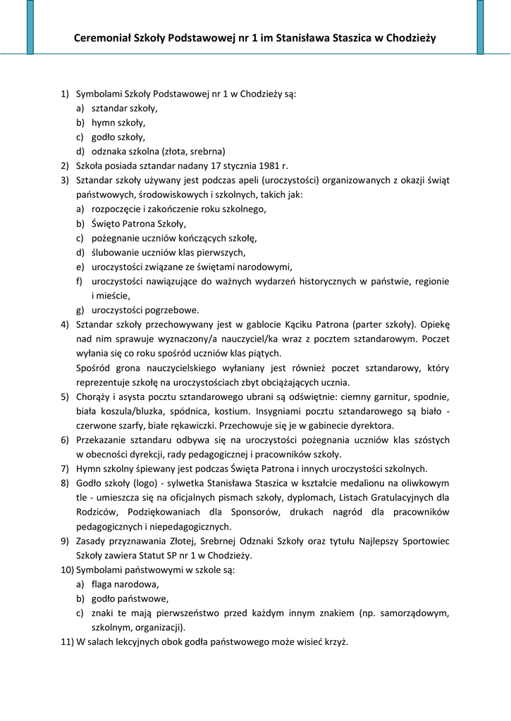 Ceremoniał Szkoły Podstawowej nr 1 im Stanisława Staszica w Chodzieży 1) Symbolami Szkoły Podstawowej nr 1 w Chodzieży są: a) sztandar szkoły, b) hymn szkoły, c) godło szkoły, d) odznaka szkolna (złota, srebrna) 2) Szkoła posiada sztandar nadany 17 stycznia 1981 r. 3) Sztandar szkoły używany jest podczas apeli (uroczystości) organizowanych z okazji świąt paostwowych, środowiskowych i szkolnych, takich jak: a) rozpoczęcie i zakooczenie roku szkolnego, b) Święto Patrona Szkoły, c) pożegnanie uczniów kooczących szkołę, d) ślubowanie uczniów klas pierwszych, e) uroczystości związane ze świętami narodowymi, f) uroczystości nawiązujące do ważnych wydarzeo historycznych w paostwie, regionie i mieście, g) uroczystości pogrzebowe. 4) Sztandar szkoły przechowywany jest w gablocie Kąciku Patrona (parter szkoły). Opiekę nad nim sprawuje wyznaczony/a nauczyciel/ka wraz z pocztem sztandarowym. Poczet wyłania się co roku spośród uczniów klas piątych. Spośród grona nauczycielskiego wyłaniany jest również poczet sztandarowy, który reprezentuje szkołę na uroczystościach zbyt obciążających ucznia. 5) Chorąży i asysta pocztu sztandarowego ubrani są odświętnie: ciemny garnitur, spodnie, biała koszula/bluzka, spódnica, kostium. Insygniami pocztu sztandarowego są biało czerwone szarfy, białe rękawiczki. Przechowuje się je w gabinecie dyrektora. 6) Przekazanie sztandaru odbywa się na uroczystości pożegnania uczniów klas szóstych w obecności dyrekcji, rady pedagogicznej i pracowników szkoły. 7) Hymn szkolny śpiewany jest podczas Święta Patrona i innych uroczystości szkolnych. 8) Godło szkoły (logo) - sylwetka Stanisława Staszica w kształcie medalionu na oliwkowym tle - umieszcza się na oficjalnych pismach szkoły, dyplomach, Listach Gratulacyjnych dla Rodziców, Podziękowaniach dla Sponsorów, drukach nagród dla pracowników pedagogicznych i niepedagogicznych. 9) Zasady przyznawania Złotej, Srebrnej Odznaki Szkoły oraz tytułu Najlepszy Sportowiec Szkoły zawiera Statut SP nr 1 w Chodzieży. 10) Symbolami paostwowymi w szkole są: a) flaga narodowa, b) godło paostwowe, c) znaki te mają pierwszeostwo przed każdym innym znakiem (np. samorządowym, szkolnym, organizacji). 11) W salach lekcyjnych obok godła paostwowego może wisied krzyż.