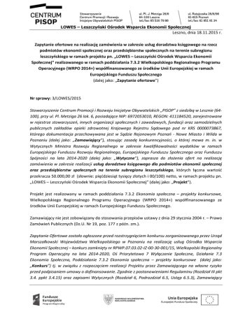LOWES – Leszczyński Ośrodek Wsparcia Ekonomii Społecznej Leszno, dnia 18.11.2015 r. Zapytanie ofertowe na realizację zamówienia w zakresie usług doradztwa księgowego na rzecz podmiotów ekonomii społecznej oraz przedsiębiorstw społecznych na terenie subregionu leszczyńskiego w ramach projektu pn. „LOWES – Leszczyński Ośrodek Wsparcia Ekonomii Społecznej” realizowanego w ramach poddziałania 7.3.2 Wielkopolskiego Regionalnego Programu Operacyjnego (WRPO 2014+) współfinansowanego ze środków Unii Europejskiej w ramach Europejskiego Funduszu Społecznego (dalej jako: „Zapytanie ofertowe”) Nr sprawy: 3/LOWES/2015 Stowarzyszenie Centrum Promocji i Rozwoju Inicjatyw Obywatelskich „PISOP” z siedzibą w Lesznie (64100), przy ul. Pl. Metziga 26 lok. 6, posiadające NIP: 6972053010, REGON: 411184520, zarejestrowane w rejestrze stowarzyszeń, innych organizacji społecznych i zawodowych, fundacji oraz samodzielnych publicznych zakładów opieki zdrowotnej Krajowego Rejestru Sądowego pod nr KRS 0000073867, którego dokumentacja przechowywana jest w Sądzie Rejonowym Poznań - Nowe Miasto i Wilda w Poznaniu (dalej jako: „Zamawiający”), stosując zasadę konkurencyjności, o której mowa m. in. w Wytycznych Ministra Rozwoju Regionalnego w zakresie kwalifikowalności wydatków w ramach Europejskiego Funduszu Rozwoju Regionalnego, Europejskiego Funduszu Społecznego oraz Funduszu Spójności na lata 2014-2020 (dalej jako: „Wytyczne”), zaprasza do złożenia ofert na realizację zamówienia w zakresie realizacji usług doradztwa księgowego dla podmiotów ekonomii społecznej oraz przedsiębiorstw społecznych na terenie subregionu leszczyńskiego, których łączna wartość przekracza 50.000,00 zł (słownie: pięćdziesiąt tysięcy złotych i 00/100) netto, w ramach projektu pn. „LOWES – Leszczyński Ośrodek Wsparcia Ekonomii Społecznej” (dalej jako: „Projekt”). Projekt jest realizowany w ramach poddziałania 7.3.2 Ekonomia społeczna – projekty konkursowe, Wielkopolskiego Regionalnego Programu Operacyjnego (WRPO 2014+) współfinansowanego ze środków Unii Europejskiej w ramach Europejskiego Funduszu Społecznego. Zamawiający nie jest zobowiązany do stosowania przepisów ustawy z dnia 29 stycznia 2004 r. – Prawo Zamówień Publicznych (Dz.U. Nr 19, poz. 177 z późn. zm.). Zapytanie Ofertowe zostało ogłoszone przed rozstrzygnięciem konkursu zorganizowanego przez Urząd Marszałkowski Województwa Wielkopolskiego w Poznaniu na realizację usług Ośrodka Wsparcia Ekonomii Społecznej – konkurs zamknięty nr RPWP.07.03.02-IZ-00-30-001/15, Wielkopolski Regionalny Program Operacyjny na lata 2014-2020, Oś Priorytetowa 7 Wyłączenie Społeczne, Działanie 7.3 Ekonomia Społeczna, Poddziałanie 7.3.2 Ekonomia społeczna – projekty konkursowe (dalej jako: „Konkurs”) tj. w związku z rozpoczęciem realizacji Projektu przez Zamawiającego na własne ryzyko przed podpisaniem umowy o dofinansowanie. Zgodnie z postanowieniami Regulaminu (Rozdział III pkt 3.4. ppkt 3.4.15) oraz zapisami Wytycznych (Rozdział 6, Podrozdział 6.5, Ustęp 6.5.3), Zamawiający LOWES – Leszczyński Ośrodek Wsparcia Ekonomii Społecznej ogłaszając Zapytania Ofertowe upublicznia je www.pisop.org.pl oraz w siedzibie Zamawiającego. na stronie internetowej Zamawiającego: 1. Zamawiający: Stowarzyszenie Centrum Promocji i Rozwoju Inicjatyw Obywatelskich „PISOP” Pl. J. Metziga 26/6 64-100 Leszno tel./ fax. 065 520 78 86 KRS: 0000073867 NIP: 697 20 53 010 REGON: 411184520 2. Nazwa projektu „LOWES – Leszczyński Ośrodek Wsparcia Ekonomii Społecznej” 3. Opis przedmiotu oraz zakres zamówienia: Zamawiający realizujący Projekt w ramach poddziałania 7.3.2 Ekonomia społeczna – projekty konkursowe, Wielkopolskiego Regionalnego Programu Operacyjnego (WRPO 2014+), współfinansowany ze środków Unii Europejskiej w ramach Europejskiego Funduszu Społecznego, zaprasza do przedstawienia ofert na: Świadczenie usług doradztwa księgowego na rzecz podmiotów ekonomii społecznej1 (dalej jako: „PES”) oraz przedsiębiorstw społecznych2 (dalej jako: „PS”) na terenie subregionu leszczyńskiego3, obejmujących w szczególności: 1) świadczenie kompleksowych usług doradztwa księgowego związanych z: a) prowadzeniem dokumentacji księgowej dla wskazanych przez Zamawiającego PES lub PS, na podstawie odpowiednich dokumentów księgowych zgodnie z wymogami ustawy z dnia 29 września 1994 r. o rachunkowości (Dz.U. Nr 121, poz. 591 z późn. zm.; dalej jako: „Ustawa”), w tym w szczególności ewidencji środków trwałych zgodnie z obowiązującą klasyfikacją środków trwałych; b) sporządzaniem polityki rachunkowości dla danego PES lub PS; c) sporządzeniem instrukcji obiegu dokumentów dla danego PES lub PS; 1 Podmiot Ekonomii Społecznej – zgodnie z definicją zawartą w Wytycznych w zakresie przedsięwzięć w obszarze wykluczenia społecznego i zwalczania ubóstwa z wykorzystaniem środków Europejskiego Funduszu Społecznego i Europejskiego Funduszu Rozwoju Regionalnego na lata 2014 – 2020. 2 Przedsiębiorstwo Społeczne – to podmiot prowadzący działalność gospodarczą, której celem jest integracja społeczna i zawodowa osób zagrożonych wykluczeniem społecznym lub świadczenie usług społecznych użyteczności publicznej, realizujący jednocześnie cele prozatrudnieniowe, wyodrębniony pod względem organizacyjnym i rachunkowym. 3 Subregion leszczyński – teren obejmujący obszar terytorialny powiatów: nowotomyskiego, międzychodzkiego, grodziskiego, m. Leszna, leszczyńskiego, rawickiego, gostyńskiego, wolsztyńskiego, kościańskiego. LOWES – Leszczyński Ośrodek Wsparcia Ekonomii Społecznej d) sporządzaniem sprawozdań finansowych, w tym sprawozdania rocznego dla danego PES lub PS i innych sprawozdań, jeśli przepisy obowiązującego prawa nakładają na PES/PS obowiązek ich sporządzania; e) wypełnianiem obo