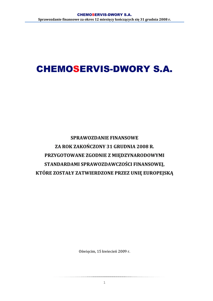 CHEMOSERVIS-DWORY S.A. Sprawozdanie finansowe za okres 12 miesięcy kończących się 31 grudnia 2008 r. CHEMOSERVIS-DWORY S.A. SPRAWOZDANIE FINANSOWE ZA ROK ZAKOŃCZONY 31 GRUDNIA 2008 R. PRZYGOTOWANE ZGODNIE Z PIZDZYNARODOWYPI STANDARDAPI SPRAWOZDAWCZOŚCI FINANSOWEJ, KTÓRE ZOSTAŁY ZATWIERDZONE PRZEZ UNIZ EUROPEJSKK Oświęcim, 15 kwiecień 2009 r. 1 CHEMOSERVIS-DWORY S.A. Sprawozdanie finansowe za okres 12 miesięcy kończących się 31 grudnia 2008 r. SPIS TREŚCI Strona Sprawozdanie finansowe Oświadczenie kierownictwa 3 Bilans 4 Rachunek zysków i strat 6 Zestawienie zmian w kapitale własnym 7 Rachunek przepływów pieniężnych 9 Informacje dodatkowe o przyjętych zasadach rachunkowości oraz inne informacje objaśniające 11 2 CHEMOSERVIS-DWORY S.A. Sprawozdanie finansowe za okres 12 miesięcy kończących się 31 grudnia 2008 r. OŚWIADCZENIE KIEROWNICTWA Stosownie do artykułu 52 ustawy o rachunkowości z dnia 29 września 1994 roku z późniejszymi zmianami, Zarząd Spółki Firmy Chemoservis-Dwory S.A. przedstawia sprawozdanie finansowe za okres 12 miesięcy kończących się 31 grudnia 2008 r., na które składa się : • • • • • Bilans sporządzony na dzień 31.12. 2008 r., Rachunek zysków i strat za okres 01.01.2008 - 31.12.2008 r., Zestawienie zmian w kapitale własnym za okres 01.01.2008 - 31.12.2008 r., Rachunek przepływów pieniężnych za okres 01.01.2008 - 31.12.2008 r., Informacje dodatkowe o przyjętych zasadach rachunkowości oraz inne informacje objaśniające. Sprawozdanie finansowe i dane porównywalne sporządzone zostały zgodnie z wymogami Międzynarodowych Standardów Sprawozdawczości Finansowej, które zostały zatwierdzone przez Unię Europejską („MSSF UF”) oraz w sposób prawdziwy, rzetelny i jasny przedstawia sytuację majątkową i finansową Spółki oraz wynik finansowy. Sprawozdanie z działalności Firmy Chemoservis-Dwory S.A. zawiera prawdziwy obraz rozwoju i osiągnięć Spółki, w tym opis podstawowych ryzyk i zagrożeń. Podmiot uprawniony do badania sprawozdania finansowego dokonujący badania rocznego sprawozdania finansowego został wybrany zgodnie z przepisami prawa. Podmiot ten oraz biegli rewidenci dokonujący badania spełniali warunki do wydania bezstronnej i niezależnej opinii o badaniu, zgodnie z właściwymi przepisami prawa krajowego. Oświęcim, 15 kwiecień 2009 r. 3 CHEMOSERVIS-DWORY S.A. Sprawozdanie finansowe za okres 12 miesięcy kończących się 31 grudnia 2008 r. BILANS na dzień 31 grudnia 2008 r. stan na dzień AKTYWA Aktywa trwałe Rzeczowe aktywa trwałe Wartości niematerialne Inwestycje w jednostkach zależnych Inwestycje w jednostkach stowarzyszonych Aktywa finansowe dostępne do sprzedaży Należności długoterminowe Aktywa z tytułu odroczonego podatku dochodowego Długoterminowe rozliczenia międzyokresowe kosztów Aktywa trwałe razem Nota 31.12.2008 PLN 31.12.2007 PLN 1a-1d 2a-2c 3a-3e 4a-4e 5a-5d 6a-6d 4 928 869,77 57 536,37 0,00 0,00 0,00 0,00 4 213 749,59 34 024,25 0,00 0,00 0,00 0,00 445 544,00 418 665,00 1 512,50 0,00 5 433 462,64 4 666 438,84 376 147,46 758 439,26 7 12b Aktywa obrotowe Zapasy 8a,8b,14 Należności z tytułu dostaw i usług oraz pozostałe 9a-9g należności Należne wpłaty na kapitał Należności z tytułu podatku dochodowego Środki pieniężne i ich ekwiwalenty 10a,10b Inne aktywa obrotowe 11a-11c Krótkoterminowe rozliczenia międzyokresowe 12a Aktywa trwałe przeznaczone do sprzedaży 13 Aktywa obrotowe razem 4 698 710,34 5 040 503,34 0,00 70 441,00 5 025 856,74 0,00 33 575,29 0,00 10 204 730,83 2 250 000,00 143 579,00 1 315 813,95 0,00 190 171,49 0,00 9 698 507,04 Aktywa razem 15 638 193,47 14 364 945,88 6 792 000,00 153 885,48 3 499 439,19 0,00 912 243,99 11 357 568,66 0,00 11 357 568,66 6 792 000,00 885,48 1 694 211,35 53 562,75 1 904 665,09 10 445 324,67 0,00 10 445 324,67 19a-19b 0,00 0,00 20a-20c 0,00 0,00 21a-21b 0,00 0,00 22 530 148,00 453 296,00 23 195 121,00 154 772,00 24 0,00 0,00 PASYWA Kapitał własny Kapitał zakładowy Kapitał zapasowy Kapitały rezerwowe Zyski zatrzymane Zysk netto bieżącego okresu Kapitał własny bez udziałów mniejszości Kapitały przypadające na udziały mniejszości Kapitał własny razem 15 16 17 18 Zobowiązania Zobowiązania długoterminowe Zobowiązania z tytułu dostaw i usług oraz pozostałe zobowiązania Kredyty i pożyczki Zobowiązania długoterminowe z tytułu leasingu finansowego Rezerwa na świadczenia pracownicze oraz pozostałe rezerwy długoterminowe Rezerwa z tytułu odroczonego podatku dochodowego Rozliczenia międzyokresowe 4 CHEMOSERVIS-DWORY S.A. Sprawozdanie finansowe za okres 12 miesięcy kończących się 31 grudnia 2008 r. Zobowiązania długoterminowe razem Zobowiązania krótkoterminowe Zobowiązania z tytułu dostaw i usług oraz pozostałe zobowiązania Pochodne instrumenty finansowe Kredyty i pożyczki Długoterminowe kredyty i pożyczki w okresie spłaty Zobowiązania krótkoterminowe z tytułu leasingu finansowego Zobowiązania z tytułu podatku dochodowego Rezerwa na świadczenia pracownicze oraz pozostałe rezerwy krótkoterminowe Rozliczenia międzyokresowe Zobowiązania krótkoterminowe razem 725 269,00 608 068,00 25a,25b 3 059 882,94 2 767 673,66 26a-26c 0,00 0,00 0,00 0,00 27a,27b 0,00 0,00 28 0,00 13 990,09 0,00 0,00 69 527,00 350 921,00 425 945,87 3 555 355,81 178 968,46 3 311 553,21 15 638 193,47 14 364 945,88 29a,29b 30 Pasywa razem POZYCJE POZABILANSOWE Nota 1. Należności warunkowe 1.1. Od jednostek powiązanych (z tytułu) 1.2. Od pozostałych jednostek (z tytułu) 2. Zobowiązania warunkowe 2.1. Na rzecz jednostek powiązanych (z tytułu) 2.2. Na rzecz pozostałych jednostek (z tytułu) − zabezpieczenie kredytu bankowego w rachunku bieżącym zgodnie z umową Nr 676/2008/00000150/00 - cesja wierzytelności potwierdzona przez Synthos Sp. z o.o. z umowy serwisowo-eksploatacyjnej Nr 1/CH/2008; weksel in blanco − zabezpieczenie należytego wykonania umowy oraz świadcze