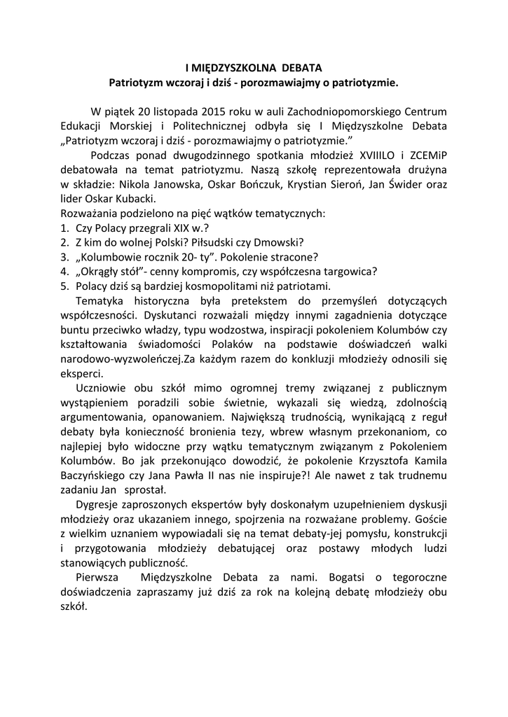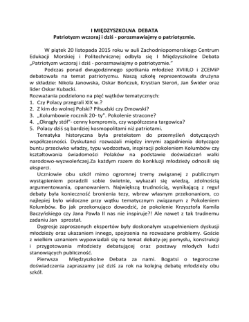 I MIĘDZYSZKOLNA DEBATA Patriotyzm wczoraj i dziś