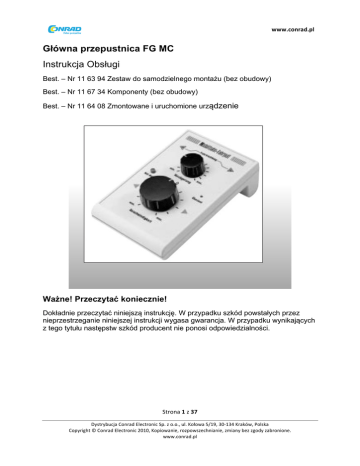 www.conrad.pl Główna przepustnica FG MC Instrukcja Obsługi Best. – Nr 11 63 94 Zestaw do samodzielnego montażu (bez obudowy) Best. – Nr 11 67 34 Komponenty (bez obudowy) Best. – Nr 11 64 08 Zmontowane i uruchomione urządzenie Ważne! Przeczytać koniecznie! Dokładnie przeczytać niniejszą instrukcję. W przypadku szkód powstałych przez nieprzestrzeganie niniejszej instrukcji wygasa gwarancja. W przypadku wynikających z tego tytułu następstw szkód producent nie ponosi odpowiedzialności. Strona 1 z 37 Dystrybucja Conrad Electronic Sp. z o.o., ul. Kołowa 5/19, 30-‐134 Kraków, Polska Copyright © Conrad Electronic 2010, Kopiowanie, rozpowszechnianie, zmiany bez zgody zabronione. www.conrad.pl www.conrad.pl Spis treści Warunki pracy 3 Użytkowanie zgodne z przeznaczeniem 4 Wskazówki bezpieczeństwa 5 Opis produktu 6 Opis połączeń 6 Podłączenie urządzenia 10 Obsługa urządzenia 11 Dane techniczne 13 Ogólne wskazówki odnośnie zestawiania połączenia 14 Instrukcja lutowania 16 Pierwszy etap montażu 17 Schemat połączeń 29 Schemat montażowy 30 Drugi etap montażu 31 Lista możliwych błędów 32 Wskazówki do montażu obudowy 34 Zakłócenia 35 Gwarancja 35 Strona 2 z 37 Dystrybucja Conrad Electronic Sp. z o.o., ul. Kołowa 5/19, 30-‐134 Kraków, Polska Copyright © Conrad Electronic 2010, Kopiowanie, rozpowszechnianie, zmiany bez zgody zabronione. www.conrad.pl www.conrad.pl Wskazówki (zestaw do samodzielnego montażu) Zestaw do samodzielnego montażu może być konstruowany i uruchamiany tylko z komponentów zaufanych producentów. Ten, kto montuje niniejszy zestaw lub dopuszcza jego grupę poprzez rozszerzenie względnie montaż obudowy do użytku, podlega jako producent normie DIN VDE 0869 i jest zobowiązany przy reprodukcji do dostarczenia wszystkich załączonych dokumentów oraz podania swojego nazwiska i adresu. Urządzenia, które zostały samodzielnie złożone z komponentów stanowiących niniejszy zestaw traktowane są jako bezpieczny technicznie produkt przemysłowy. Wskazówki (komponenty/uruchomione urządzenie) Niniejsze urządzenie opuściło fabrykę w stanie bezpiecznym technicznie, wolnym od wszelkich usterek. W celu utrzymania niniejszego stanu użytkownik zobowiązany jest do przestrzegania wskazówek bezpieczeństwa i ostrzeżeń zawartych w niniejszej instrukcji. Warunki pracy • Praca urządzenia możliwa jest tylko i wyłącznie z wykorzystaniem zalecanego napięcia. • Podczas wymiany bezpiecznika należy całkowicie wyłączyć urządzenie (odłączyć od napięcia zasilającego). Należy stosować tylko bezpieczniki o tej samej wartości prądu znamionowego i tej samej charakterystyce wyzwalania (T2A). • Położenie urządzenia jest dowolne. • Koniecznie należy zwrócić uwagę na przestrzegania zawartych w instrukcji danych technicznych. Przekroczenie ich wartości może doprowadzić do uszkodzenia urządzenia jak i narażenia użytkownika na niebezpieczeństwo. • Podczas instalacji urządzenia zwrócić uwagę na minimalny przekrój kabla przewodu przyłączeniowego. • Dopuszczalna temperatura otoczenia (temperatura pomieszczenia) podczas pracy urządzenia nie może być niższa niż 0°C i wyższa niż 40°C. • Urządzenie nadaje się do użytku w suchych i czystych pomieszczeniach. • Urządzenie należy trzymać z daleka od wazonów do kwiatów, wanien łazienkowych, umywalek i wszelkiego rodzaju cieczy. Strona 3 z 37 Dystrybucja Conrad Electronic Sp. z o.o., ul. Kołowa 5/19, 30-‐134 Kraków, Polska Copyright © Conrad Electronic 2010, Kopiowanie, rozpowszechnianie, zmiany bez zgody zabronione. www.conrad.pl www.conrad.pl • Komponenty należy chronić oddziaływaniem gorąca przed wilgocią, strumieniami wody i • Urządzenia nie należy użytkować w połączeniu z łatwopalnymi i palnymi cieczami. • Wszystkie elementy i ich grupy należy przechowywać z dala od dzieci. • Części składowe urządzenia można uruchamiać tylko pod nadzorem specjalistów. • W zakładach przemysłowych należy przestrzegać przepisów zawodowych organizacji przemysłowych ds. urządzeń elektrycznych • W szkołach, placówkach edukacyjnych, warsztatach hobbystycznych i samopomocy uruchamianie poszczególnych komponentów powinno być nadzorowane przez wyszkolony w tym zakresie personel • Urządzenia nie należy uruchamiać w środowisku, w którym występują lub mogą wystąpić gazy palne, dymy czy pyły. • W przypadku konieczności naprawy urządzenia należy stosować tylko oryginalne części zamienne. Stosowanie części zamiennych niewiadomego pochodzenia może doprowadzić do szkód materialnych jak i narażenia życia ludzkiego. • Naprawy urządzenia mogą dokonywać tylko specjaliści. • Po zakończeniu użytkowania urządzenia należy natychmiast odłączyć je od napięcia zasilania. • Wniknięcie do urządzenia substancji ciekłych może doprowadzić do jego uszkodzenia. W takim przypadku urządzenie powinno zostać sprawdzone przez wykwalifikowanego specjalistę. BHP Użytkowanie zgodne z przeznaczeniem Użytkowanie zgodnie z przeznaczeniem niniejszego urządzenia sprowadza się do eksploatacji go jako sterownika kolejki elektrycznej zasilanej stałym prądem o maksymalnym poborze prądu do 1,5A. Inne zastosowanie jest niedopuszczalne. Strona 4 z 37 Dystrybucja Conrad Electronic Sp. z o.o., ul. Kołowa 5/19, 30-‐134 Kraków, Polska Copyright © Conrad Electronic 2010, Kopiowanie, rozpowszechnianie, zmiany bez zgody zabronione. www.conrad.pl www.conrad.pl Wskazówki bezpieczeństwa W przypadku obchodzenia się z produktami, które mają styczność z napięciem elektrycznym należy przestrzegać obowiązujących przepisów VDE, a w szczególności VDE 0100, VDE 0550/0551, VDE 0700, VDE 0711 i VDE 0860. Przed otwarciem urządzenia należy zawsze wyciągnąć wtyczkę sieciową oraz upewnić się, że urządzenie pozbawione jest zasilania. Elementy, podzespoły lub urządzenia mogą by