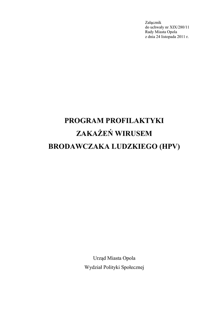 Załącznik do uchwały nr XIX/280/11 Rady Miasta Opola z dnia 24 listopada 2011 r. PROGRAM PROFILAKTYKI ZAKAŻEŃ WIRUSEM BRODAWCZAKA LUDZKIEGO (HPV) Urząd Miasta Opola Wydział Polityki Społecznej 1. Opis problemu zdrowotnego a. Problem zdrowotny Zakażenie narządów płciowych wirusem brodawczaka ludzkiego (HPV) jest jedną z najczęstszych chorób przenoszonych drogą płciową, stwierdza się je bowiem u 20-46 % młodych kobiet aktywnych seksualnie. Znany jest przyczynowo-skutkowy związek zakażenia HPV z rozwojem nie tylko dysplazji, ale również raka szyjki macicy. Ponad 96 % przypadków raka szyjki macicy jest powiązana z zakażeniem HPV. Wirus HPV odpowiada za różne przednowotworowe i nowotworowe zmiany na błonach śluzowych narządów płciowych i innych okolic ciała. W skali całego świata rak szyjki macicy jest drugim, co do częstości rakiem, który dotyka kobiety. Ryzyko zakażenia wirusem HPV w ciągu całego życia u osób aktywnych seksualnie wynosi około 50 %. Spośród ponad stu typów wirusa HPV kilka jest naprawdę niebezpiecznych. Są to wirusy tak zwanego wysokiego ryzyka onkogennego (typ 16 i 18). Zakażenie tymi typami HPV często jest długotrwałe – w tym czasie wirus mnoży się w obrębie komórek nabłonka szyjki macicy nie dając żadnych niepokojących objawów. Pomimo skrytego przebiegu zakażenia, może ono prowadzić do rozwoju zmian przedrakowych, a ostatecznie także raka szyjki macicy. Także i te stany nie są zauważalne przez kobiety, gdyż nie powodują na ogół żadnych charakterystycznych dolegliwości, które byłyby powodem zgłoszenia się do ginekologa. Średni czas rozwoju choroby wynosi od 5 do 10 lat. Przez wiele lat choroba rozwija się niemal bezobjawowo. Dlatego kobiety często zbyt późno zjawiają się u lekarza. Długi rozwój choroby daje dostatecznie dużo czasu, aby ją wykryć. Niestety, zaledwie co piąta Polka chodzi regularnie do ginekologa i wykonuje badania cytologiczne. Rak szyjki macicy jest chorobą, której nowoczesna medycyna potrafi skutecznie zapobiegać, ale wciąż powoduje śmierć zbyt wielu kobiet. Polska, niestety, zajmuje czołowe miejsce wśród krajów Unii Europejskiej w liczbie zgonów z powodu raka szyjki macicy. b. Epidemiologia Rak szyjki macicy w skali całego świata jest drugim, co do częstości rakiem, który dotyka kobiety i drugą, co do częstotliwości przyczyną ich zgonów z powodu chorób nowotworowych. Globalnie, co roku, notuje się około 500.000 nowych zachorowań, a około 300.000 kobiet umiera z powodu raka szyjki macicy. Szacuje się, że na świecie liczba kobiet chorych na raka szyjki macicy sięga 1.400.000. 2/15 W Polsce zapada na ten typ nowotworu ponad 3.600 kobiet rocznie, z czego umiera co roku niemal 2.000. Jest to jeden z najwyższych wskaźników umieralności w Europie. Warto tu zauważyć, że o ile wskaźnik zachorowalności na raka szyjki macicy w Polsce nie różni się od odnotowanego w innych krajach Europy, o tyle odsetek kobiet przeżywający 5 lat po rozpoznaniu tego nowotworu należy do najniższych w Europie i nie przekracza 50 %. Najczęściej rak szyjki macicy rozwija się u kobiet pomiędzy 35 a 59 rokiem życia, to jest w momencie, kiedy wiele z nich wychowuje dzieci i jest aktywnych zawodowo. Już tylko ten fakt może świadczyć o znacznej, społecznej randze problemu. W mieście Opolu w 2009 r., pomimo bardzo wielu apeli, nieznaczna grupa kobiet w wieku od 25 do 59 lat skorzystała z bezpłatnych badań cytologicznych w ramach Narodowego Programu Profilaktyki Raka Szyjki Macicy finansowanego przez Narodowy Fundusz Zdrowia. Liczbę zarejestrowanych zachorowań i zgonów z powodu raka szyjki macicy w latach 2003-2007 (liczby bezwzględne) wśród kobiet w mieście Opolu, na podstawie danych z Opolskiego Rejestru Nowotworów, obrazuje poniższa tabela: Lata 2003 2004 2005 2006 2007 Zachorowania 18 12 15 13 19 Zgony 5 14 7 7 10 c. Populacja podlegająca jednostce samorządu terytorialnego i populacja kwalifikująca się do włączenia do Programu Liczba mieszkańców miasta Opola na dzień 5 października 2011 r. to 122.403 osoby. Populacja kwalifikująca się do włączenia do Programu to dziewczęta w wieku 9-18 lat. Na terenie miasta Opola zameldowanych jest (według stanu na dzień 5 października 2011 r.) 4.393 dziewcząt w tym wieku. d. Obecne postępowanie w omawianym problemie zdrowotnym ze szczególnym uwzględnieniem gwarantowanych świadczeń opieki zdrowotnej finansowanych ze środków publicznych Artykuł 5 ustawy z dnia 27 sierpnia 2004 r. o świadczeniach opieki zdrowotnej finansowanych ze środków publicznych (Dz.U. z 2008 r. Nr 164, poz. 1027 z późn. zm.) definiuje świadczenie zdrowotne jako działanie służące profilaktyce, zachowaniu, ratowaniu, przywracaniu lub poprawie zdrowia oraz inne działania medyczne wynikające z procesu leczenia lub przepisów odrębnych regulujących zasady ich udzielania. Świadczenie opieki 3/15 zdrowotnej finansowane w całości lub współfinansowane ze środków publicznych na zasadach i w zakresie określonym w ww. ustawie to świadczenie gwarantowane. Profilaktyka raka szyjki macicy realizowana aktualnie w Polsce sprowadza się przede wszystkim do redukowania częstości występowania nowych zachorowań i ograniczenia roli czynników nasilających podatność na chorobę (profilaktyka pierwotna) oraz działań zmierzających do wczesnego wykrywania objawów (profilaktyka wtórna). Standardowym postępowaniem w zapobieganiu rakowi szyjki macicy w profilaktyce wtórnej są okresowe badania cytologiczne, w podejrzanych przypadkach uzupełnione kolposkopią z pobraniem wycinków do badania histopatologicznego. Postępowanie takie pozwala na wczesne diagnozowanie raka szyjki macicy i usunięcie go metodami małoinwazyjnymi. W przypadku raków zaawansowanych, stosuje się metody chirurgiczne oraz radio i chemioterapię, a możliwość wyleczenia zależy przede wszystkim od stopnia zaawans