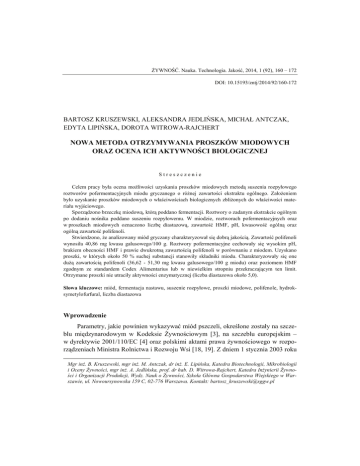 ŻYWNOŚĆ. Nauka. Technologia. Jakość, 2014, 1 (92), 160 – 172 DOI: 10.15193/zntj/2014/92/160-172 BARTOSZ KRUSZEWSKI, ALEKSANDRA JEDLIŃSKA, MICHAŁ ANTCZAK, EDYTA LIPIŃSKA, DOROTA WITROWA-RAJCHERT NOWA METODA OTRZYMYWANIA PROSZKÓW MIODOWYCH ORAZ OCENA ICH AKTYWNOŚCI BIOLOGICZNEJ Streszczenie Celem pracy była ocena możliwości uzyskania proszków miodowych metodą suszenia rozpyłowego roztworów pofermentacyjnych miodu gryczanego o różnej zawartości ekstraktu ogólnego. Założeniem było uzyskanie proszków miodowych o właściwościach biologicznych zbliżonych do właściwości materiału wyjściowego. Sporządzono brzeczkę miodową, którą poddano fermentacji. Roztwory o zadanym ekstrakcie ogólnym po dodaniu nośnika poddano suszeniu rozpyłowemu. W miodzie, roztworach pofermentacyjnych oraz w proszkach miodowych oznaczono liczbę diastazową, zawartość HMF, pH, kwasowość ogólną oraz ogólną zawartość polifenoli. Stwierdzono, że analizowany miód gryczany charakteryzował się dobrą jakością. Zawartość polifenoli wynosiła 40,86 mg kwasu galusowego/100 g. Roztwory pofermentacyjne cechowały się wysokim pH, brakiem obecności HMF i prawie dwukrotną zawartością polifenoli w porównaniu z miodem. Uzyskano proszki, w których około 50 % suchej substancji stanowiły składniki miodu. Charakteryzowały się one dużą zawartością polifenoli (36,62 - 51,30 mg kwasu galusowego/100 g miodu) oraz poziomem HMF zgodnym ze standardem Codex Alimentarius lub w niewielkim stropniu przekraczającym ten limit. Otrzymane proszki nie utraciły aktywności enzymatycznej (liczba diastazowa około 5,0). Słowa kluczowe: miód, fermentacja nastawu, suszenie rozpyłowe, proszki miodowe, polifenole, hydroksymetylofurfural, liczba diastazowa Wprowadzenie Parametry, jakie powinien wykazywać miód pszczeli, określone zostały na szczeblu międzynarodowym w Kodeksie Żywnościowym [3], na szczeblu europejskim – w dyrektywie 2001/110/EC [4] oraz polskimi aktami prawa żywnościowego w rozporządzeniach Ministra Rolnictwa i Rozwoju Wsi [18, 19]. Z dniem 1 stycznia 2003 roku Mgr inż. B. Kruszewski, mgr inż. M. Antczak, dr inż. E. Lipińska, Katedra Biotechnologii, Mikrobiologii i Oceny Żywności, mgr inż. A. Jedlińska, prof. dr hab. D. Witrowa-Rajchert, Katedra Inżynierii Żywności i Organizacji Produkcji, Wydz. Nauk o Żywności, Szkoła Główna Gospodarstwa Wiejskiego w Warszawie, ul. Nowoursynowska 159 C, 02-776 Warszawa. Kontakt: [email protected] NOWA METODA OTRZYMYWANIA PROSZKÓW MIODOWYCH ORAZ OCENA ICH… 161 przestała obowiązywać Polska Norma dotycząca miodu pszczelego [16]. Jednak w wielu punktach była ona bardziej restrykcyjna od unijnej. Miód gryczany należy do grupy miodów nektarowych. Jest uznawany za jeden z najbardziej wartościowych rodzajów miodu pod względem odżywczym [8]. Charakteryzuje się ciemnobrązową barwą, ostrym, „drapiącym” i słodkim smakiem oraz bardzo intensywnym zapachem kwiatów gryki. W jego składzie chemicznym występuje dużo fruktozy w stosunku do glukozy (F/G około 1,8), a także znaczne ilości magnezu, żelaza i innych pierwiastków. Odznacza się znaczną kwasowością i wyjątkowo dużą zawartością białka. Jako miód letni bogaty jest w liczne enzymy, olejki eteryczne i flawonoidy. Badania przeprowadzone w Oddziale Pszczelnictwa Instytutu Ogrodnictwa w Puławach [20] wskazują, że nawet po roku przechowywania tego produktu w temperaturze pokojowej aktywność diastazy kształtuje się znacznie powyżej normy. Jedną z niepożądanych substancji w miodach, wpływającą szkodliwie na organizm człowieka jest 5-hydroksymetylofurfural (HMF). Polska należy do europejskiej czołówki producentów miodu – ponad 23 tysiące ton w 2011 roku (17,2 tys. ton w 2012). Tylko 1 % wyprodukowanego w Polsce miodu zużywa przemysł farmaceutyczny, kosmetyczny i spożywczy, w tym fermentacyjny [17]. Powodem, dla którego wykorzystanie miodu jako surowca w przemyśle spożywczym jest bardzo małe, są jego właściwości fizykochemiczne. Szczególnie związane jest to z jego wysoką gęstością i lepkością, utrudniającą dozowanie oraz z koniecznością upłynniania po krystalizacji. Dobrym rozwiązaniem problemu może być miód w proszku. Może on być swobodnie mieszany z innymi surowcami, a ponadto wchodzić w skład suplementów diety, przekąsek, batonów czy stanowić środek słodzący w produktach dietetycznych [22]. Jednak duża zawartość glukozy i fruktozy (około 74 % świeżej masy), które charakteryzują się niską temperaturą przemiany szklistej, uniemożliwia otrzymanie produktu w postaci sypkiego proszku. Trudno jest uzyskać informacje na temat rozwiązań technologicznych suszenia miodów. Prace poświęcone temu zagadnieniu pojawiają się niezwykle rzadko. Co więcej, większość wyników badań objęta jest ochroną patentową. Patenty dotyczą głównie aspektów suszenia rozpyłowego – zastosowanych mieszanin nośników, parametrów procesu, początkowych stężeń roztworów oraz rozwiązań konstrukcyjnych urządzeń [9]. Miód w proszku próbowano otrzymywać metodą suszenia rozpyłowego, tunelowego, próżniowego, bębnowego, mikrofalowego i liofilizacyjnego [7, 21, 22, 29]. Najczęściej stosowaną metodą jest suszenie rozpyłowe. Temperaturę przemiany szklistej podwyższano dotychczas poprzez dodatek wysokocząsteczkowych substancji nośnikowych lub obniżenie temperatury suszenia [9]. Innym, nowym sposobem umożliwienia suszenia miodu proponowanym w niniejszej publikacji, jest redukcja zawartości cukrów poprzez poddanie go fermentacji alkoholowej do zadanej zawartości ekstraktu ogólnego. Jednakże fermentacja miodu po- 162 Bartosz Kruszewski, Aleksandra Jedlińska, Michał Antczak, Edyta Lipińska, Dorota Witrowa-Rajchert woduje pewne zmiany w składzie substancji biologicznie aktywnych i zniekształca wrażenia sensoryczne (smak, zapach). Z drugiej strony, oprócz 