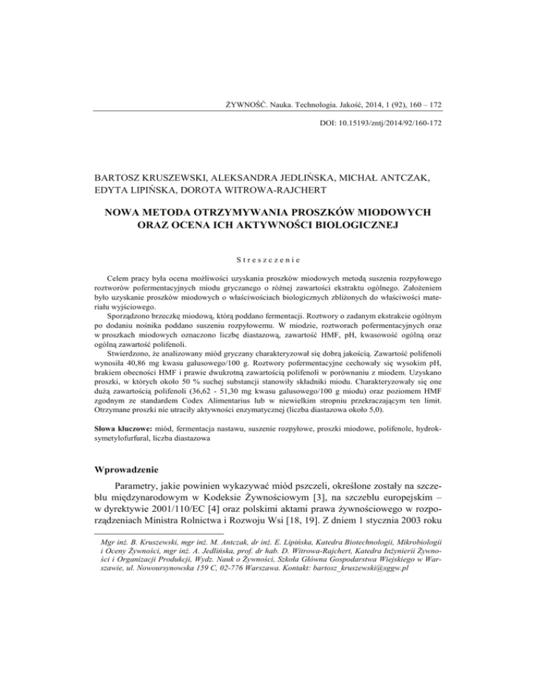 nowa metoda otrzymywania proszków miodowych oraz ocena ich