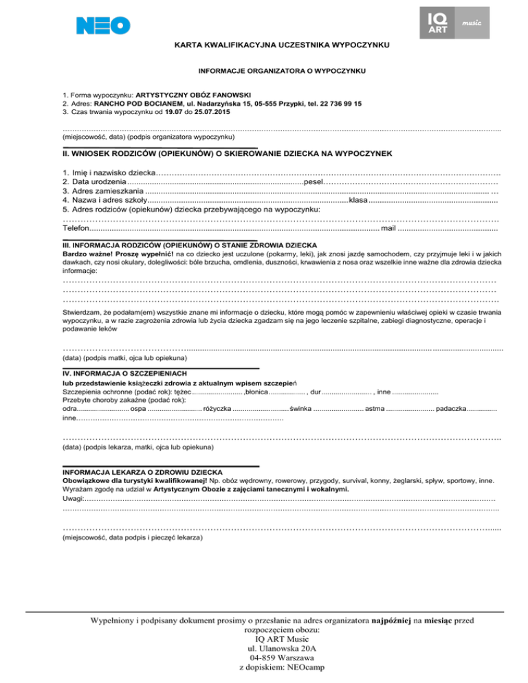 KARTA KWALIFIKACYJNA UCZESTNIKA WYPOCZYNKU INFORMACJE ORGANIZATORA O WYPOCZYNKU 1. Forma wypoczynku: ARTYSTYCZNY OBÓZ FANOWSKI 2. Adres: RANCHO POD BOCIANEM, ul. Nadarzyńska 15, 05-555 Przypki, tel. 22 736 99 15 3. Czas trwania wypoczynku od 19.07 do 25.07.2015 …………………………………………………………………………………………………………………………………………………………………... (miejscowość, data) (podpis organizatora wypoczynku) II. WNIOSEK RODZICÓW (OPIEKUNÓW) O SKIEROWANIE DZIECKA NA WYPOCZYNEK 1. 2. 3. 4. 5. Imię i nazwisko dziecka…………………………………………………………………………………………………………………. Data urodzenia ...............................................................................pesel………………………………………………………… Adres zamieszkania .......................................................................................................................................................... … Nazwa i adres szkoły.......................................................................................... klasa .......................................................... Adres rodziców (opiekunów) dziecka przebywającego na wypoczynku: …………………………………………………………………………………………………………………………………. Telefon.................................................................................................................................. mail ............................................. III. INFORMACJA RODZICÓW (OPIEKUNÓW) O STANIE ZDROWIA DZIECKA Bardzo ważne! Proszę wypełnić! na co dziecko jest uczulone (pokarmy, leki), jak znosi jazdę samochodem, czy przyjmuje leki i w jakich dawkach, czy nosi okulary, dolegliwości: bóle brzucha, omdlenia, duszności, krwawienia z nosa oraz wszelkie inne ważne dla zdrowia dziecka informacje: ………………………………………………………………………………………………………………………………… ………………………………………………………………………………………………………………………………… …………………………………………………………………………………………………………………………………. Stwierdzam, że podałam(em) wszystkie znane mi informacje o dziecku, które mogą pomóc w zapewnieniu właściwej opieki w czasie trwania wypoczynku, a w razie zagrożenia zdrowia lub życia dziecka zgadzam się na jego leczenie szpitalne, zabiegi diagnostyczne, operacje i podawanie leków ……………………………………............................................................................................................................................... (data) (podpis matki, ojca lub opiekuna) IV. INFORMACJA O SZCZEPIENIACH lub przedstawienie książeczki zdrowia z aktualnym wpisem szczepień Szczepienia ochronne (podać rok): tężec ......................... ,błonica .................. , dur ......................... , inne ....................... Przebyte choroby zakaźne (podać rok): odra.......................... ospa ........................... różyczka ............................ świnka ......................... astma ........................ padaczka ............... inne……………………………………………………………………………. ………………………………………………………………………………………………………………………………….. (data) (podpis lekarza, matki, ojca lub opiekuna) INFORMACJA LEKARZA O ZDROWIU DZIECKA Obowiązkowe dla turystyki kwalifikowanej! Np. obóz wędrowny, rowerowy, przygody, survival, konny, żeglarski, spływ, sportowy, inne. Wyrażam zgodę na udział w Artystycznym Obozie z zajęciami tanecznymi i wokalnymi. Uwagi:………………………………………………………………………………………………………………………………………………………… ………………………………………………………………………………………………………………………………………………………………….. ………………………………………………………………………………………………………………………………...... (miejscowość, data podpis i pieczęć lekarza) Wypełniony i podpisany dokument prosimy o przesłanie na adres organizatora najpóźniej na miesiąc przed rozpoczęciem obozu: IQ ART Music ul. Ulanowska 20A 04-859 Warszawa z dopiskiem: NEOcamp V. INFORMACJA WYCHOWAWCY KLASY O DZIECKU (w przypadku braku możliwości uzyskania opinii wychowawcy klasy wypełnia rodzic lub opiekun) ………………………………………………………………………………………………………………………………… ………………………………………………………………………………………………………………………………… …………………………………………………………………………………………………………………………………. ………………………………………………………………………………………………………………………………….. (data) (podpis wychowawcy lub rodzica/opiekuna) VI. DECYZJA O KWALIFIKACJI UCZESTNIKA Postanawia się: (niepotrzebne skreślić) 1. Zakwalifikować i skierować dziecko na wypoczynek 2. Odmówić skierowania dziecka na wypoczynek ze względu: ............................................................................... ……………………………………………………………………………………. ………………………………