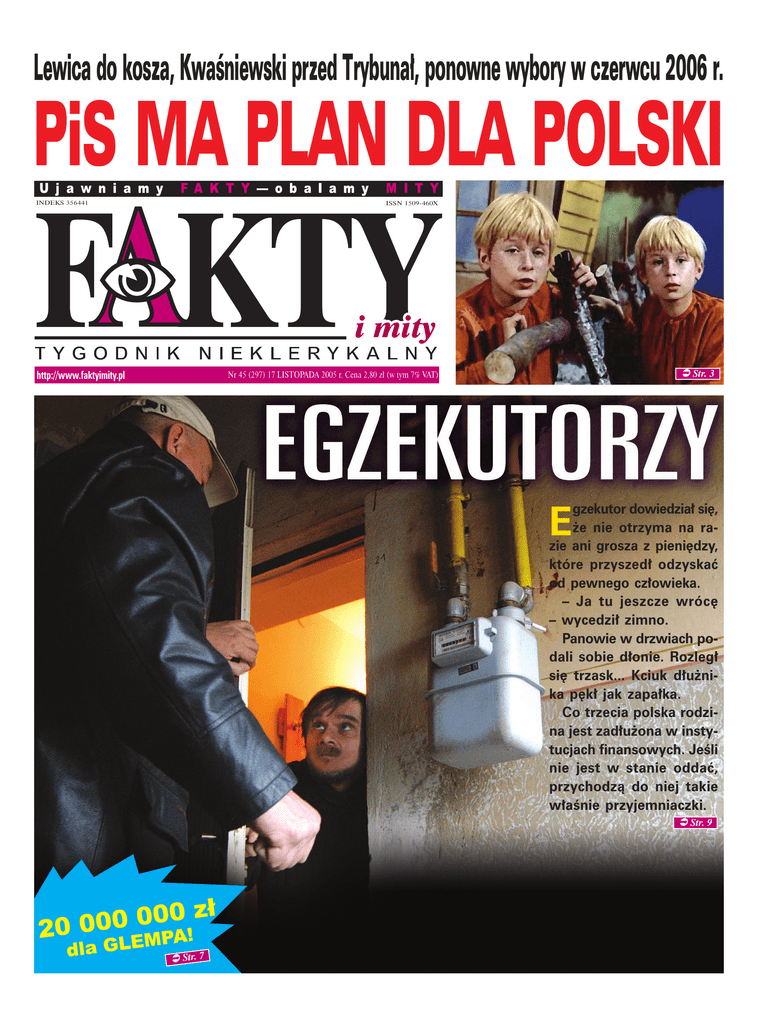 Lewica do kosza, Kwaśniewski przed Trybunał, ponowne wybory w czerwcu 2006 r. PiS MA PLAN DLA POLSKI INDEKS 356441 ISSN 1509-460X http://www.faktyimity.pl Ü Str. 3 Nr 45 (297) 17 LISTOPADA 2005 r. Cena 2,80 zł (w tym 7% VAT) gzekutor dowiedział się, że nie otrzyma na razie ani grosza z pieniędzy, które przyszedł odzyskać od pewnego człowieka. – Ja tu jeszcze wrócę – wycedził zimno. Panowie w drzwiach podali sobie dłonie. Rozległ się trzask... Kciuk dłużnika pękł jak zapałka. Co trzecia polska rodzina jest zadłużona w instytucjach finansowych. Jeśli nie jest w stanie oddać, przychodzą do niej takie właśnie przyjemniaczki. E Ü Str. 9 Ü Str. 7 2 Nr 45 (297) 10 – 17 XI 2005 r. KSIĄDZ NAWRÓCONY KOMENTARZ NACZELNEGO FA K T Y POLSKA Janusz Śniadek, szef „Solidarności”, uznał znane- Wiara w uczynki go antysemitę, organizatora i bywalca luksusowych bankietów – księdza Henryka Jankowskiego – za szczególnie zasłużonego dla związku. Prałat otrzymał specjalny rocznicowy medal NSZZ „Solidarność”. Takiego odznaczenia nie dostał nawet Lech Wałęsa, jej pierwszy szef. Czekamy na medal dla Rydzyka – innego obrońcy „Solidarności” – za zebranie milionów złotych na ocalenie Stoczni Gdynia. Biznesmeni zrzeszeni w Radzie Przedsiębiorczości przedstawili premierowi 13 postulatów, m.in. obniżenie podatków i kosztów pracy, zmniejszenie deficytu, ograniczenie pakietu socjalnego, np. odchodzenia na wcześniejsze emerytury. Premier obiecał spełnić postulaty. Z bożą pomocą. Sekretarz generalny PO Schetyna oznajmił, że rząd PiS-u nie ma szans na sprawne rządzenie krajem. Platforma utworzyła gabinet cieni i liczy na przedterminowe wybory w 2007 roku. A czy w tym kraju będą jeszcze kiedyś demokratyczne wybory? W programie PiS niczego takiego nie było... Prasa regularnie publikuje nowe zdjęcia z imprez Młodzieży Wszechpolskiej. Wygoleni młodzieńcy (niektórzy to dzisiaj już posłowie na Sejm) podnoszą na nich ręce w hitlerowskim geście. Zamiast przeprosin – na stronach internetowych LPR widnieje list gończy za jednym z fotoreporterów. Za podanie jego danych personalnych ufundowano nagrodę. To on jeszcze żyje?! WARSZAWA Odnalazł się cudowny obraz Matki Królów i Narodu. W sposób cudowny przetrwał on okupację i powstanie warszawskie, a niedawno po prostu cudem rozpoznał go w jakiejś zakrystii ks. Niewęgłowski, proboszcz parafii św. Andrzeja, kapelan praktykujących środowisk twórczych, który tak zareklamował obraz: „On patrzył na powstańców, jak giną!” Tę to nieczułą świętość wyborcy Kaczyńskiego – wraz z dywizją wojska i z Glempem na czele – przenieśli uroczyście do kościoła św. Andrzeja na pl. Teatralny. No to mamy już – jak znalazł! – patronkę IV RP! Słynącą cudami, patrzącą, jak ginie naród... PIOTRKÓW TRYBUNALSKI Zaskakujący zwrot akcji w pro- cesie prezydenta Piotrkowa Trybunalskiego – Waldemara Matusewicza. Główny świadek oskarżenia, były prezes Wojewódzkiego Funduszu Ochrony Środowiska, Marek K., oświadczył nagle, że wszystkie jego twierdzenia o przyjmowaniu przez prezydenta Matusewicza łapówek są kłamstwem. Marek K. to także główny świadek w sprawie byłego barona SLD z Łodzi – Andrzeja Pęczaka. Czyżby wystarczyło, że ktoś – jak na filmie „Ojciec chrzestny” – wszedł na rozprawę w towarzystwie członka rodziny K.? OLSZTYN Zapanował tu przedziwny zwyczaj. Msze święte w intencji swoich klientów zamawiają usłużne wobec kleru zakłady pogrzebowe. Zaproszenia na nie drukują lokalne gazety. Do kasy miejscowych parafii wpływają co miesiąc tysiące złotych. Proboszczowie są zachwyceni. Przypominamy, że msze może zamawiać każdy w dowolnej intencji, np. położne za szczęśliwe narodziny (błagalna i dziękczynna), nauczyciele – o szóstki dla uczniów, drogówka za ofiary wypadków... LUBLIN Matka jednego z maturzystów domaga się w sądzie od korepetytorki odszkodowania za słaby wynik egzaminu swojego syna. Proponujemy pozwać także nauczycieli, kolegów z podwórka i męża, jeśli był pijany podczas poczęcia... ŁÓDŹ Policja złapała złodziei, którzy z policyjnego magazy- nu ukradli 20 kilogramów kokainy. Wśród łobuzów są funkcjonariusze Centralnego Biura Śledczego. Spokojnie, to było jeszcze „za komuny”. Teraz służby są prawe i sprawiedliwe i łapią złych „komunistów”. TORUŃ Premier Kazimierz Marcinkiewicz swoje pierwsze duże spotkanie publiczne zorganizował w Radiu Maryja i Telewizji „Trwam”. Tam przedstawił program rządu, jego cele i strategię polityczną. Oczywiście, nie było ani słowa o nowych wyborach. Dużo mówił za to o pomocy ubogim, wsadzaniu do więzień komunistów i zaostrzeniu prawa. To mówił do wszystkich. A co dał w prezencie Rydzykowi za poparcie PiS-u w wyborach i za zielone światło dla rządu? FRANCJA Od tygodnia trwają rozruchy wywołane przez imigrantów z Afryki i krajów arabskich. Fala buntu dotarła już do Belgii i Niemiec. Tam też płoną samochody i lecą szyby. Nauczony przykładem Francji nowy polski rząd powinien wpuszczać do Polski samych białych katolików, np. z Czeczenii. SZKOCJA Polacy pracujący w Szkocji u irańskiego biznes- mena Alego Najafiana zostali skoszarowani w tajnym obozie. Nasi rodacy mieszkali po pięciu w przenośnych, plastikowych kabinach. Kiedyś tak pracowali Chińczycy w Kalifornii, a dzisiaj Chiny to potęga! estem bardzo wierzący. Moja wiara jest ciągle wystawiana na ciężkie próby, a potrzeba też do niej wiele nadziei i miłości. I cierpliwości! Wierzę bowiem w Polskę, a dokładnie w zdrową substancję narodu, która kiedyś zdominuje tę chorą, będącą pożywką dla pandemii klerykalizmu. Objawem tej strasznej choroby jest bezmyślność milionów. Sam kiedyś byłem chory. Wielokrotnie pisałem już, że Polacy to niezwykle przedsiębiorczy naród. Nie wolno nam tylko