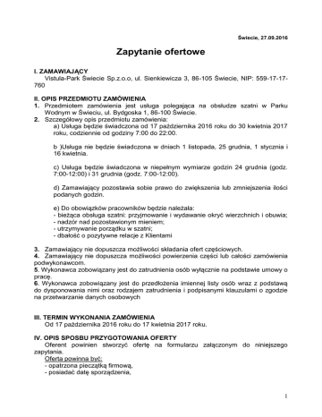 Świecie, 27.09.2016 Zapytanie ofertowe I. ZAMAWIAJĄCY Vistula-Park Świecie Sp.z.o.o, ul. Sienkiewicza 3, 86-105 Świecie, NIP: 559-17-17760 II. OPIS PRZEDMIOTU ZAMÓWIENIA 1. Przedmiotem zamówienia jest usługa polegająca na obsłudze szatni w Parku Wodnym w Świeciu, ul. Bydgoska 1, 86-100 Świecie. 2. Szczegółowy opis przedmiotu zamówienia: a) Usługa będzie świadczona od 17 października 2016 roku do 30 kwietnia 2017 roku, codziennie od godziny 7:00 do 22:00. b )Usługa nie będzie świadczona w dniach 1 listopada, 25 grudnia, 1 stycznia i 16 kwietnia. c) Usługa będzie świadczona w niepełnym wymiarze godzin 24 grudnia (godz. 7:00-12:00) i 31 grudnia (godz. 7:00-12:00). d) Zamawiający pozostawia sobie prawo do zwiększenia lub zmniejszenia ilości podanych godzin. e) Do obowiązków pracowników będzie należała: - bieżąca obsługa szatni: przyjmowanie i wydawanie okryć wierzchnich i obuwia; - nadzór nad pozostawionym mieniem; - utrzymywanie porządku w szatni; - dbałość o pozytywne relacje z Klientami 3. Zamawiający nie dopuszcza możliwości składania ofert częściowych. 4. Zamawiający nie dopuszcza możliwości powierzenia części lub całości zamówienia podwykonawcom. 5. Wykonawca zobowiązany jest do zatrudnienia osób wyłącznie na podstawie umowy o pracę. 6. Wykonawca zobowiązany jest do przedłożenia imiennej listy osób wraz z podstawą do dysponowania nimi oraz rodzajem zatrudnienia i podpisanymi klauzulami o zgodzie na przetwarzanie danych osobowych III. TERMIN WYKONANIA ZAMÓWIENIA Od 17 października 2016 roku do 17 kwietnia 2017 roku. IV. OPIS SPOSBU PRZYGOTOWANIA OFERTY Oferent powinien stworzyć ofertę na formularzu załączonym do niniejszego zapytania. Oferta powinna być: - opatrzona pieczątką firmową, - posiadać datę sporządzenia, 1 - zawierać adres lub siedzibę oferenta, numer telefonu, numer NIP, - podpisana czytelnie przez wykonawcę. V. MIEJSCE ORAZ TERMIN SKŁADANIA OFERT 1. Oferta powinna być przesłana za pośrednictwem: poczty, kuriera lub też dostarczona osobiście na adres Park Wodny w Świeciu, ul. Bydgoska 1, 86-100 Świecie do dnia 12 października 2016 roku wraz z załączoną kserokopią wypisu z rejestru przedsiębiorców lub zaświadczenia z ewidencji działalności gospodarczej, wystawione w dacie nie wcześniejszej niż sześć miesięcy przed datą złożenia oferty. 2. Ocena ofert zostanie dokonana w dniu 13 października 2016 roku, a wyniki i wybór najkorzystniejszej oferty zostanie ogłoszony o godzinie 12:00 w Parku Wodnym w Świeciu, ul. Bydgoska 1, 86-100 Świecie Oraz na stronie internetowej pod adresem www.parkwodnyswiecie.com oraz www.vistulapark.pl. 3. Oferty złożone po terminie nie będą rozpatrywane. 4. Oferent może przed upływem terminu składania ofert zmienić lub wycofać swoją ofertę. 5. W toku badania i oceny ofert Zamawiający może żądać od oferentów wyjaśnień dotyczących treści złożonych ofert. 6. Zapytanie ofertowe zamieszczono na stronie: www.vistulapark.pl i www.parkwodnyswiecie.com. VI. OCENA OFERT Zamawiający dokona oceny ważnych ofert na podstawie następujących kryteriów: 1 - Cena 100% VII. WADIUM Wykonawca zobowiązany jest do złożenia wadium w wysokości: 1000. (jeden tysiąc złotych) Wadium winno być wniesione w pieniądzu; poręczeniach bankowych lub poręczeniach spółdzielczej kasy oszczędnościowo-kredytowej, z tym że poręczenie kasy jest zawsze poręczeniem pieniężnym; gwarancjach bankowych; gwarancjach ubezpieczeniowych; poręczeniach udzielanych przez podmioty, o których mowa w art. 6b ust. 5 pkt 2 ustawy z dnia 9 listopada 2000 r. o utworzeniu Polskiej Agencji Rozwoju Przedsiębiorczości (t.j.; Dz. U. z 2014 r. poz. 1804 ze zm.), na okres związania ofertą, nie krótszy niż 40 dni licząc od dnia, w którym upływa termin składania ofert. Wadium należy wnieść: a) w pieniądzu - przelewem na rachunek bankowy Zamawiającego, prowadzony przez Bank Spółdzielczy w Brodnicy Oddział w Świeciu, nr: 13 9484 1163 0700 0270 2007 0002, z dopiskiem Przetarg - Świadczenie kompleksowych usług ratownictwa wodnego w Parku Wodnym w Świeciu z takim wyprzedzeniem, aby wadium wpłynęło na rachunek Zamawiającego przed upływem terminu składania ofert. Za dzień zapłaty uważa się datę obciążenia rachunku bankowego Zamawiającego. b) w innych formach - przed upływem terminu składania ofert. Oryginał dokumentu należy złożyć w siedzibie Zamawiającego, 86-100 Świecie, ul. Sienkiewicza 3, w sekretariacie, a kopię dokumentu dołączyć do oferty. Niewniesienie wadium w wymaganym terminie oraz wymaganej wysokości i formie skutkuje wykluczeniem Wykonawcy z postępowania. VII. INFORMACJE DOTYCZĄCE WYBORU NAJKORZYSTNIEJSZEJ OFERTY 2 O wyborze najkorzystniejszej oferty Zamawiający zawiadomi oferentów za pośrednictwem strony internetowej znajdującej się pod adresem www.parkwodnyswiecie.com i www.vistulapark.pl . VIII. DODATKOWE INFORMACJE Dodatkowych informacji udziela Ariel Stawski pod numerem telefonu 661 555 125. IX. ZAŁĄCZNIKI Wzór formularza ofertowego. 3