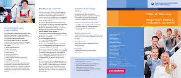 Projekty na rzecz rzemiosła Właściwie we wszystkich obszarach zarówno gospo darczych jak i społecznych napotkamy obecnie na publicznie finansowane, bądź prywatnie wspierane projekty. Również nasz Ośrodek Szkolenia angażuje się już od wielu lat z sukcesem w projekty zarówno krajo we jak i międzynarodowe. Ponadzakładowe zajęcia praktyczne (ÜLU) W ramach projektów młodzi ludzie rozwijają swoje zainteresowanie do rzemiosła i poprzez to przyczyniają sie do pozyskiwania młodej kadry pracowniczej. Ponadto Ośrodek Szkolenia występuje w roli partnera i współpracuje z innymi podmiotami projektów. ■ W naszych Ośrodkach Szkolenia z siedzibą we Frankfurcie nad Odrą i Hennickendorfie odbywają się szkolenia dla kształcących się uczniów w 18 zawo dach z branży: ■ ■ ■ ■ ■ ■ ■ ■ technik elektryk/elektronik fryzjer / kosmetyczka technik samochodowy malarz/lakiernik lakiernik samochodowy obróbka metalu/spawacz technik instalacji sanitarnych, grzewczych i klimatyzacji gospodarka i administracja W ramach ponadzakładowych zajęć praktycznych, przekazywane są w nowocześnie wyposażonych warsztatach, teoretyczne i praktyczne umiejętności oraz wiadomości zawodowe, które nie wszystkie zakłady pracy są w stanie w pełni zapewnić swoim uczniom. Ośrodek Szkolenia Ośrodek Szkolenia - jako uznany partner gospodarczy - jest jedną z największych instytucji szkoleniowych we wschodniej Brandenburgii i wyróżnia się szczególnymi kompetencjami. Kompetencja w kształceniu i doskonaleniu zawodowym Spawanie/technika obróbki metalu ■ ■ ■ ośrodek kursów spawalniczych Zrzeszenia DVS centrum kompetencji „Technika Mocowania” centrum kompetencji „Stal szlachetna nierdzewna” Projekty obejmują tematy związane z: Jako uzupełnienie praktyczej nauki zawodu w zakładach pracy, organizowane są dodatkowe zajęcia praktyczne dla uczniów rzemiosła. Program tych zajęć jest jednolity na obszarze całych Niemiec. ■ Kompetencja dla Twojego sukcesu ■ ■ ■ ■ orientacją zawodową i przygotowaniem do zawodu zapewnieniem i rozwojem wyspecjalizowanej kadry rozwojem personalnym doradztwem przedsiębiorstw społeczną i zawodową integracją międzynarodową współpracą Projekty są ważnym krokiem w procesie uczenia się przez całe życie i stanowią bezpośrednią pomoc dla zrzeszonych zakładów członkowskich. Programy wymiany uczniów, studentów, pracowników oraz nauczycieli zawodu realizowane są we współpracy z międzynarodowymi partnerami. Uczestnicy projektów mogą w naszych Ośrodkach Szkolenia poszerzać zarówno swoją wiedzę teoretyczną, zawodową i międzykulturową, jak i poprawić swoją znajmość języka. Wielowymiarowe działania związane z projektami ma ją na celu ciągły rozwój kompleksowej oferty informa cyjnej, doradczej i z zakresu dokształcenia zawodowe go Izby. Poza tym pozwalają odpowiednio wcześnie uchwycić najnowsze trendy w obszarach kształcenia, doradztwa, rynku pracy, transferu technologii oraz ba dań naukowych. Technika samochodowa Szkolenia w branży motoryzacyjnej certyfikowane przez Zentralverband des Deutschen Kraftfahrzeuggewerbes e.V. (ZDK) Elektrotechnika Centrum Kompetencji w zakresie budowy sieci bezprzewodowych Kosmetyka Certyfikowane seminaria z zakresu beauty, wellness i vital Powyższe kompetencje wyróżniają się w szczególności poprzez: ■ ■ ■ wysoko wykwalifikowaną kadrę wykładowczą wyposażenie warsztatów i pracowni na najwyższym poziomie technicznym kompleksowe branżowe know-how w kształceniu i doskonaleniu zawodowym Handwerkskammer Frankfurt (Oder) Region Ostbrandenburg Bildungszentrum Spiekerstraße 11 15230 Frankfurt (Oder) Telefon 0335 5554-200 Telefax 0335 5554-203 www.facebook.com/bzffo Handwerkskammer Frankfurt (Oder) Region Ostbrandenburg Berufsbildungsstätte Hennickendorf Rehfelder Straße 50 15378 Hennickendorf Telefon 033434 439-10 Telefax 033434 439-23 www.facebook.com/bzhed [email protected] www.weiterbildung-ostbrandenburg.de Źródła wykorzystanych zdjęć zdjęcia tytułowe: Fotolia.com/Karin & Uwe Annas zdjęcia budynków: Handwerkskammer Frankfurt (Oder) – Region Ostbrandenburg Ośrodek Szkolenia we Frankfurcie nad Odrą Ośrodek Szkolenia w Hennickendorfie Szkoła przygotowująca do uzyskania tytułu mistrza Doskonalenie zawodowe Ośrodek Szkolenia we Frankfurcie nad Odrą kształci i doskonali zawodowo w branżach: Ośrodek Szkolenia zawodowego w Hennickendorfie (pod Berlinem) umożliwia naukę w nowocześnie wyposarzonych warsztatach i pomieszczeniach szkolenio wych. W ich skad wchodzą: Kurs przygotowujący do uzyskania tytułu mistrza w zawodzie jest jednym z najwyższych nieakademickich kursów doskonalenia zawodowego uznawanych zarówno w Niemczech jak i w Europie. Składa się on z czterech części: Każdego roku około 800 uczestników korzysta z możliwości dokształcania i doskonalenia zawodowego w Izbie Rzemieślniczej. Oferty adresowane są zarówno do pracowników i włascicieli zakładów rzemieślniczych, jak i do wszystkich zainteresowanych z innych branż. Mają Pańswto do wyboru ponad 200 różnych kursów. ■ ■ ■ elektrotechnik/elektronik fryzjer/kosmetyczka pracownik biurowy/administracyjny ■ ■ Tradycja i edukacja Izba Rzemieślnicza we Frankfurcie nad Odrą w regionie Brandenburgii Wschodniej jest najstarszą Izbą Rzemieślniczą w Brandenburgii. Istnieje od 10 kwietnia 1900 roku. Po rożnorodnych zmianach prezentuje się dzisiaj jako no woczesne centrum rzemiosła. Izba Rzemieślnicza repre zentuje interesy około 12.000 zrzeszonych zakładów członkowskich wraz z ich pracownikami i uczniami zawo du. Jest ona organizacją wspierającą przedsiębiorstwa rozpoczynające działalność gospodarczą, a także wszyst kich zainteresowanych kształceniem zawodowym. Izba Rzemieślnicza z Frankfurtu nad Odrą obejmuje swoim obszarem cztery starostwa: Oder-Spree, Märkisch-Oderland, Barnim, Uckermark oraz miast