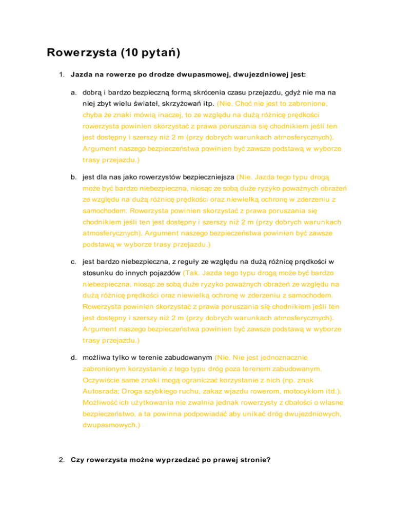 Rowerzysta (10 pyta ń ) 1. Jazda na rowerze po drodze dwupasmowej, dwujezdniowej jest: a. dobr ą i bardzo bezpieczną form ą skrócenia czasu przejazdu, gdyż nie ma na niej zbyt wielu świate ł, skrzyżowań itp. (Nie. Choć nie jest to zabronione, chyba że znaki mówi ą inaczej, to ze względu na dużą róż nicę prędkości rowerzysta powinien skorzystać z prawa poruszania się chodnikiem jeś li ten jest dostępny i szerszy niż 2 m (przy dobrych warunkach atmosferycznych). Argument naszego bezpieczeństwa powinien być zawsze podstawą w wyborze t rasy przejazdu.) b. jest dla nas jako rowerzystów bezpieczniejsza (Nie. Jazda tego typu drogą może być bardzo niebezpieczna, niosąc ze sobą duże ryzyko poważnych obrażeń ze względu na dużą różnicę prędkości oraz niewielk ą ochronę w zderzeniu z samochodem. Rowerzysta powinien skorzystać z prawa poruszania się chodnikiem jeś li ten jest dostępny i szerszy niż 2 m (przy dobrych warunkach atmosferycznych). Argument naszego bezpieczeństwa powinien być zawsze podstawą w wyborze t rasy przejazdu.) c. jest bardzo niebezpieczna, z regu ł y ze względu na dużą róż nicę prędkości w stosunku do innych pojazdów (Tak. Jazda tego typu drogą może być bardzo niebezpieczna, niosąc ze sobą duże ryzyko poważnych obrażeń ze względu na dużą różnicę prędkości oraz niewielk ą ochronę w zderzeniu z samochodem. Rowerzysta powinien skorzystać z prawa poruszania się chodnikiem jeś li ten jest dostępny i szerszy niż 2 m (przy dobrych warunkach atmosferycznych). Argument naszego bezpieczeństwa powinien być zawsze podstawą w wyborze t rasy przejazdu.) d. moż liwa tylko w terenie zabudowanym (Nie. Nie jest jednoznacznie zabronionym korzystanie z tego typu dróg poza terenem zabudowanym. Oczywiście same znaki mogą ograniczać korzystanie z nich (np. znak Autosrada; Droga szybkiego ruchu, zakaz wjazdu rowerom, motocyklom itd.). Moż liwość ich użytkowania nie zwalnia jednak rowerzysty z dba łości o w ł asne bezpieczeństwo, a ta powinna podpowiadać aby unikać dróg dwujezdniowych, dwupasmowych.) 2. Czy rowerzysta mo ż ne wyprzedzać po prawej stronie? a. nie, jest to ca ł kowicie zabronione (Nie. W świetle przepisów obowiązujących w Polsce od 21 maja br. rowerzysta ma prawo wyprzedzania po prawej stronie wolniej jadących pojazdów a także tych stojących w korku.) b. tak, jednak wy łącznie samochód stojący w korku (Nie. W świetle przepisów obowi ązujących w Polsce od 21 maja br. rowerzysta ma prawo wyprzedzania po prawej stronie również wolniej od niego jadących pojazdów.) c. tak, samochód zarówno stojący w korku jak i jadący wolniej od rowerzysty (Tak. Prawo to dają obowiązuj ące od 21 maja br. nowe przepisy dotyczące m.in. ruchu rowerzystów. Zosta ł y one dostosowane tym samym i ujednolicone z przepisami panuj ącymi w UE.) d. tak, musi jednak zachować szczególną ostrożność (Tak. Manewr wyprzedzania z natury rzeczy niesie za sobą pewne ryzyko. W Polsce dużym problemem pozostaje sporadyczne patrzenie do lusterek wstecznych przez kierowców. Jeś li ktoś już patrzy, bardzo rzadko kontroluje co dzieje się z ty ł u po jego prawej stronie. Zw łaszcza na począ tku obowiązywania nowych przepisów warto wiec dla bezpieczeństwa zachować szczególną ostrożność.) 3. Rowerzysta: a. ma bezwzględny obowiązek korzystania z drogi dla rowerów jeś li ta jest dostępna (Tak. Jeś li na drodze wydzielony jest specjalny pas dla rowerów lub stworzona jest specjalna ścież ka rowerowa, korzystanie z niej jest obowi ązkowe. Wyją tek stanowi sytuacja, w k tórej ścież ka ta jest wy łączona z ruchu.) b. jadąc drogą dla rowerów oraz pieszych ma pierwszeństwo przed pieszym (Nie. Na drodze dopuszczającej wspólny ruch zarówno pieszych jak i rowerzystów, Ci ostatni mają obowiązek zachowania szczególnej ostrożności oraz bezwzględnego ust ąpienia pierwszeństwa pieszym.) c. ma prawo poruszania się po chodniku w terenie zabudowanym niezależnie od dopuszczalnej prędkości na drodze wzd ł uż k tórej prowadzi (Tak. Warunkiem stawianym przez przepisy jest szerokość chodnika nie mniejsza niż 2 m. Co więcej w przypadku z łych warunków atmosferycznych rowerzysta ma obecnie prawo poruszać się chodnikiem nawet i węższym niż wspomniane 2 m. Rowerzysta dla w ł asnego bezpieczeństwa winien wówczas skorzystać z tego prawa. Kodeks nak ł ada jednak na rowerzystę obowiązek wolnej jazdy, zachowania szczególnej ostrożności oraz bezwzględnego ust ąpienia miejsca pieszemu.) d. ma prawo poruszania się po chodniku jeś li opiekuje się dzieckiem w wieku do 10 lat również kieruj ącym rowerem (Tak. W takim przypadku Kodeks Ruchu Drogowego dopuszcza korzystanie przez rowerzystów z chodnika. Pamię tajmy jednak, że pierwszeństwo ma wówczas pieszy, musimy jechać powoli oraz zachować szczególną ostrożność.) 4. Poruszaj ąc się rowerem, doje ż d żaj ąc do skrzy żowania z zamiarem jazdy prosto: a. masz pierwszeństwo przed pojazdem skręcającym w drogę poprzeczną, k tóra przecina wyodrębnioną ścież kę dla rowerów, na k tórej się znajdujesz (Tak. Zgodnie z najnowszymi zmianami w Prawie o Ruchu Drogowym obowi ązującymi od 23 maja 2011 roku pierwszeństwo w takiej sytuacji posiada rowerzysta. Nie zwalnia to jednak od upewnienia się, że ma on moż liwość bezpiecznie przekroczyć jezdnię. Wjechanie tu ż przed nadjeżdżający pojazd pozostaje wykroczeniem i może okazać się t ragiczne w skutkach!) b. nie masz pierwszeństwa przed pojazdem skręcającym w drogę poprzeczną, która przecina wyodrębnioną ścież kę dla rowerów, na k tórej się znajdujesz (Nie. Zgodnie z najnowszymi zmianami w Prawie o Ruchu Drogowym obowi ązującymi od 23 maja 2011 roku pierwszeństwo w takiej sytuacji posiada rowerzysta. Nie zwalnia to jednak od upewnienia się, że ma on moż liwość bezpiecznie przekroczyć jezdnię. 