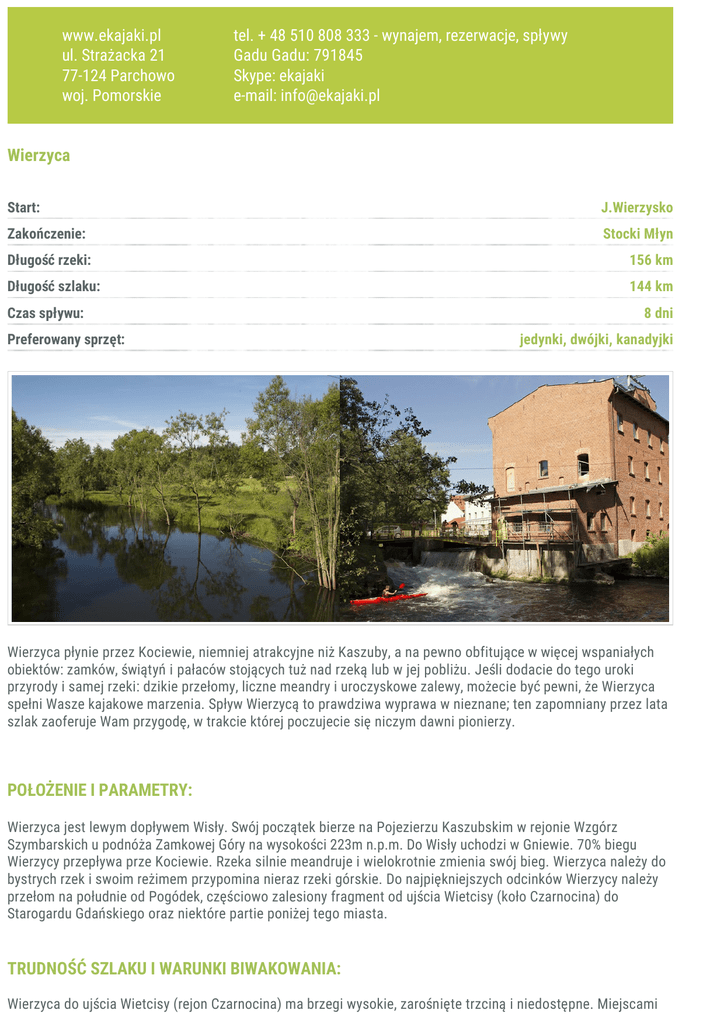 www.ekajaki.pl ul. Strażacka 21 77-124 Parchowo woj. Pomorskie tel. + 48 510 808 333 - wynajem, rezerwacje, spływy Gadu Gadu: 791845 Skype: ekajaki e-mail: [email protected] Wierzyca Start: J.Wierzysko Zakończenie: Stocki Młyn Długość rzeki: 156 km Długość szlaku: 144 km Czas spływu: Preferowany sprzęt: 8 dni jedynki, dwójki, kanadyjki Wierzyca płynie przez Kociewie, niemniej atrakcyjne niż Kaszuby, a na pewno obfitujące w więcej wspaniałych obiektów: zamków, świątyń i pałaców stojących tuż nad rzeką lub w jej pobliżu. Jeśli dodacie do tego uroki przyrody i samej rzeki: dzikie przełomy, liczne meandry i uroczyskowe zalewy, możecie być pewni, że Wierzyca spełni Wasze kajakowe marzenia. Spływ Wierzycą to prawdziwa wyprawa w nieznane; ten zapomniany przez lata szlak zaoferuje Wam przygodę, w trakcie której poczujecie się niczym dawni pionierzy. POŁOŻENIE I PARAMETRY: Wierzyca jest lewym dopływem Wisły. Swój początek bierze na Pojezierzu Kaszubskim w rejonie Wzgórz Szymbarskich u podnóża Zamkowej Góry na wysokości 223m n.p.m. Do Wisły uchodzi w Gniewie. 70% biegu Wierzycy przepływa prze Kociewie. Rzeka silnie meandruje i wielokrotnie zmienia swój bieg. Wierzyca należy do bystrych rzek i swoim reżimem przypomina nieraz rzeki górskie. Do najpiękniejszych odcinków Wierzycy należy przełom na południe od Pogódek, częściowo zalesiony fragment od ujścia Wietcisy (koło Czarnocina) do Starogardu Gdańskiego oraz niektóre partie poniżej tego miasta. TRUDNOŚĆ SZLAKU I WARUNKI BIWAKOWANIA: Wierzyca do ujścia Wietcisy (rejon Czarnocina) ma brzegi wysokie, zarośnięte trzciną i niedostępne. Miejscami jest tu głęboka. Odcinek do Starogardu Gdańskiego nie należy jednak do uciążliwych. Od Starogardu rzeka zaczyna znacznie przyśpieszać, a jej brzegi są miejscami zarośnięte łozami - w większość do przepłynięcia bez większego problemu. Rzeka zapewni Wam także sporo przenosek - głównie ze względu na występowanie licznych elektrowni wodnych oraz niskich kładek. Wierzyca jest rzeką o szybkim nurcie i dużym spadku. Jeśli dodacie do tego zwalone drzewa i podwodne głazy, odpowiecie sobie na pytanie, dlatego spływ nie będzie należał do najłatwiejszych. Nie możecie też liczyć na znaki informacyjne, ani ułatwienia w postaci śladów pozostawionych przez poprzednie załogi (ścieżki, przepływy przez sitowie itp.). Wierzycę z czystym sumieniem polecamy doświadczonym kajakarzom, którzy będą z tych utrudnień wielce zadowoleni. Z racji tego, że tę atrakcyjną rzekę o dziwo wykreślono na lata ze spisu szlaków kajakowych, baza turystyczna jest tu marnie rozwinięta – na brak przystani nakłada się mała liczba dogodnych dzikich miejsc biwakowych. Każdy nocleg należy zaplanować odpowiednio wcześniej i na długo przed zmrokiem rozpocząć poszukiwania dobrego miejsca. Tak - na Wierzycy trzeba przygotować się na spartańskie warunki. Dlatego rzekę tę polecamy w okresie letnim, kiedy ciepłe noce i temperatura wody są bardziej sprzyjające. Dziewicza przyroda i cisza na pewno wynagrodzą Wam wszystkie niedogodności. OPIS SZLAKU WIERZYCY: Spływ kajakowy najlepiej rozpocząć od jeziora Wierzysko w pobliżu Kościerzyny. Trasa do ujścia Wietcisy jest dość szybka i meandrująca. Po drodze miniecie ciekawą wieś Pogódka. Jeśli macie czas, warto poświęcić jeden dzień na spływ Wietcisą, która jest lewym i najdłuższym dopływem Wierzycy (47km). Takie rozwiązanie wymaga jednak zorganizowania dodatkowego transportu. Etap do Starogardu Gdańskiego należy do meandrujących, a w korycie możecie się natknąć na sporą liczbę dużych głazów! Czekają Was także przenoski i przeszkody w postaci niskich kładek i wystających z koryta konarów. Etap do Pelplina należy do najbardziej malowniczych. Szczególnie warto zwrócić uwagę na Diabelski Kamień znajdujący się w wodzie – jego obwód ma 8m! Warto także poświęcić jeden dzień na zwiedzanie Pelpina. Dalsza trasa biegnie do Gniewu, gdzie Wierzyca uchodzi do Wisły. Warto spłynąć do końca, by podziwiać przepiękną panoramę zamku w Gniewie od strony Wisły – wygląda naprawdę niesamowicie. Odwiedźcie także Gniew zwany Kazimierzem Północy. Miasto to ma średniowieczny układ ulic oraz przepiękny gotycki zamek krzyżacki. Gniew jest również znany z bardzo prężnie działającego bractwa rycerskiego (można obejrzeć pokaz). Jeśli odwiedzicie Gniew w lipcu macie szansę natrafić na odbywające się tutaj turnieje rycerskie o międzynarodowej sławie. Górski charakter Wierzycy powoduje, że często budowano na niej młyny wodne, elektrownie, czy też tartaki. Ciekawostka: łączny spadek czterech elektrowni ma prawie 19 metrów! Wierzyca nie należy do rzek szczególnie uczęszczanych. Wyprawa będzie miała traperski posmak - górski reżim zapewnia ciekawe przeżycia i zdecydowanie podnosi adrenalinę. Cisza i spokój oraz duża ilość zabytków pozwali Wam spędzić tutaj bardzo przyjemny urlop. Szlak rzeki Wierzycy polecamy kajakarzom oczekującym ciszy i spokoju oraz lubiącym dzikie biwaki na łonie natury z dala od przejawów cywilizacji. NAJWAŻNIEJSZE ATRAKCJE WIERZYCY: Elektrownia Czarnocińskie Piece Elektrownia Owidz Elektrownia Kolincz Elektrownia Stocki Młyn Ruiny Zamku Kiszewskiego (dostępne z zewnątrz) Barokowy Kościół św.Piotra i Pawła z XVIII wieku w Pogódkach Starogard Gdański Gotycki Kościół w Klonówce Katedra w Pelplinie i Biblia Gutenberga Zamek w Gniewie